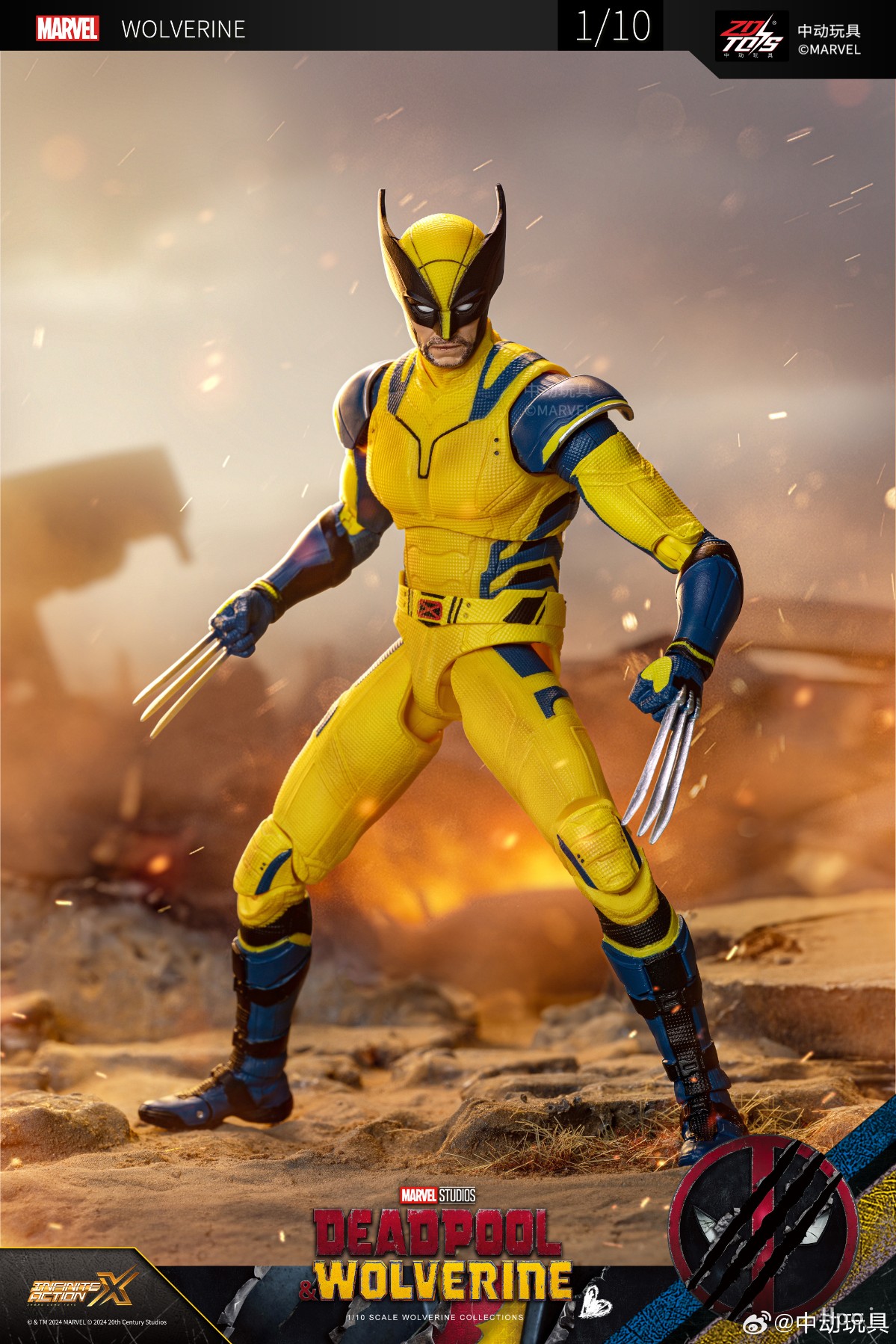 外观上还原了这套经典战衣的黄蓝配色,并做了旧化处理,腰带中间是代表了金刚狼变种人身份的红黑色「X」标志。全身设置多处可动关节,包括四肢关节、手肘、膝盖、脚尖等。这款金刚狼配备了四对替换手型,包括一对握拳手、一对架势手、一对放松手,还有金刚狼标志性的狼爪。