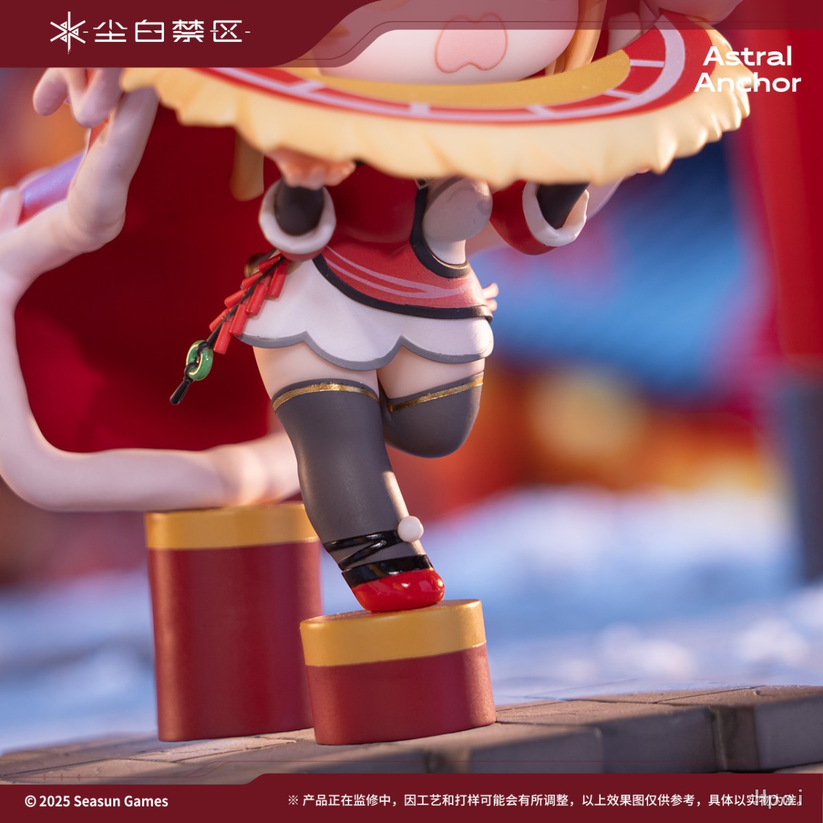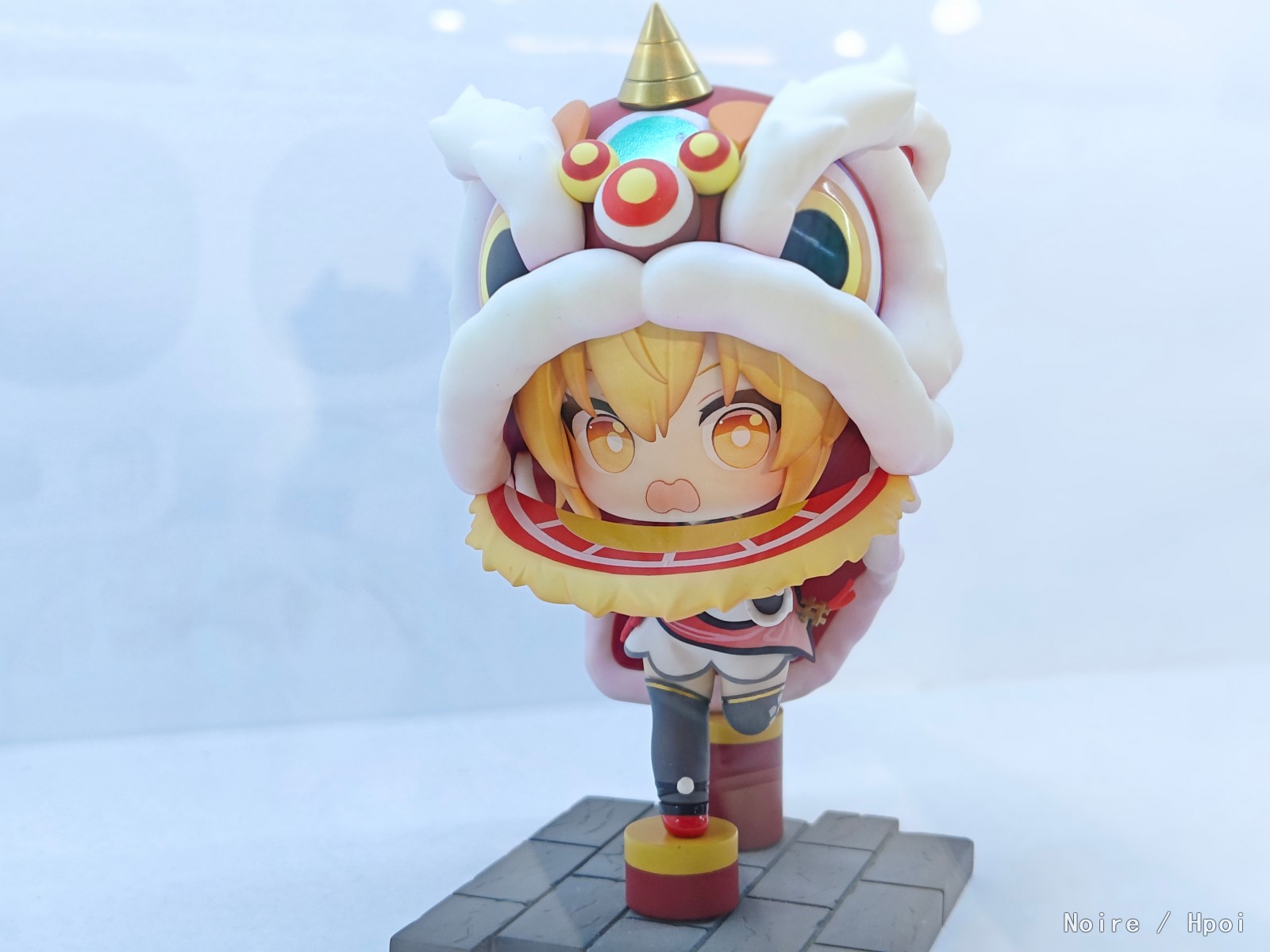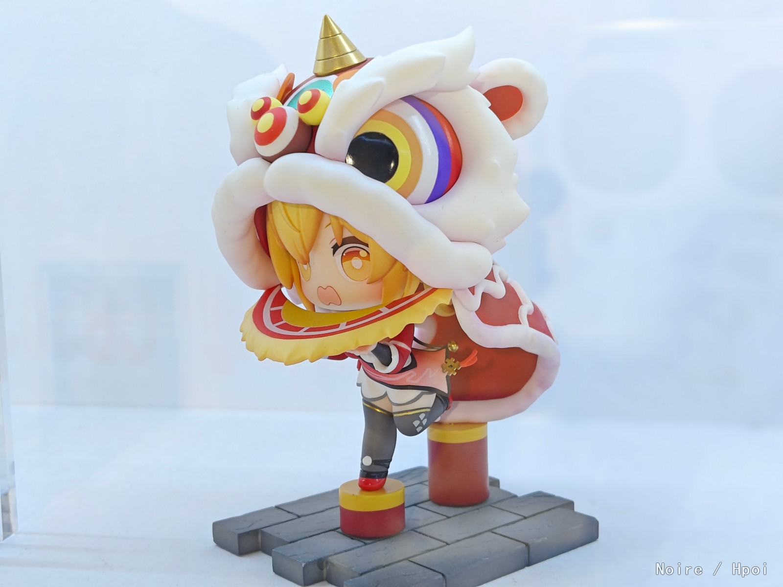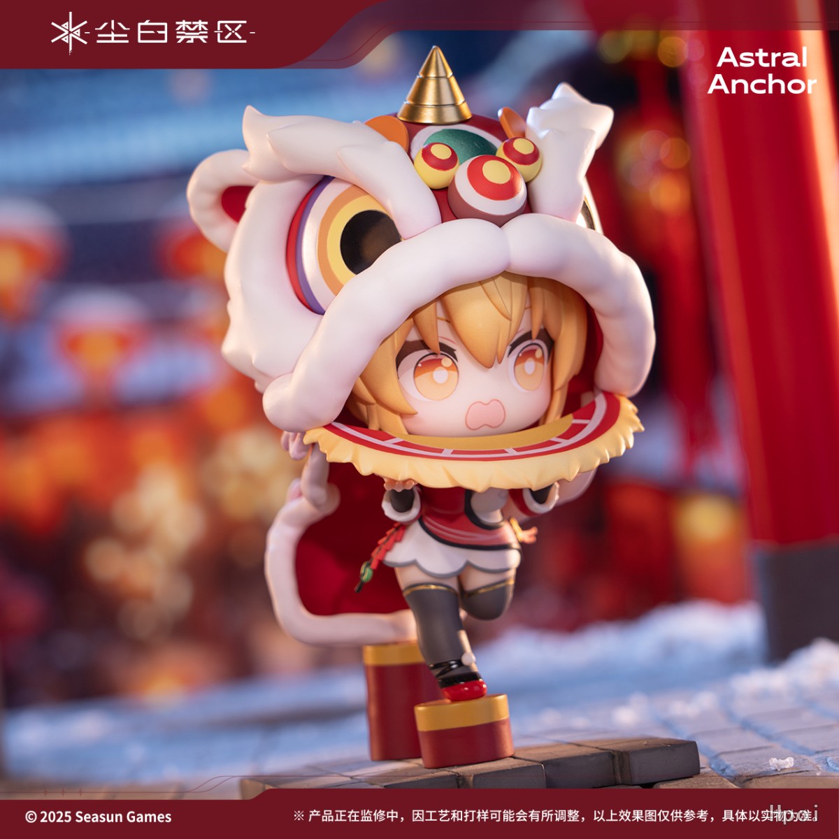 身穿喜庆服饰的芬妮头戴舞狮头套,单脚小心翼翼的踩着梅花桩,略显手忙脚乱的动作搭配慌乱的小表情却显得格外灵动俏丽~