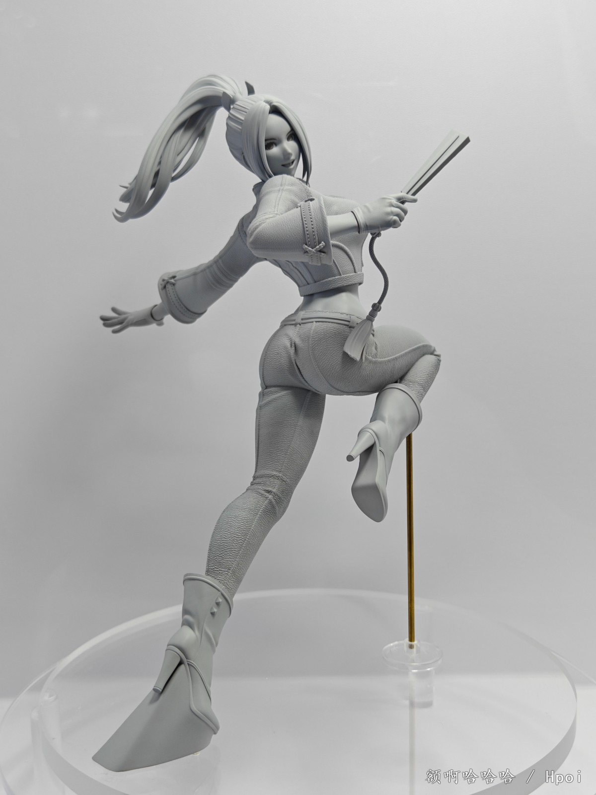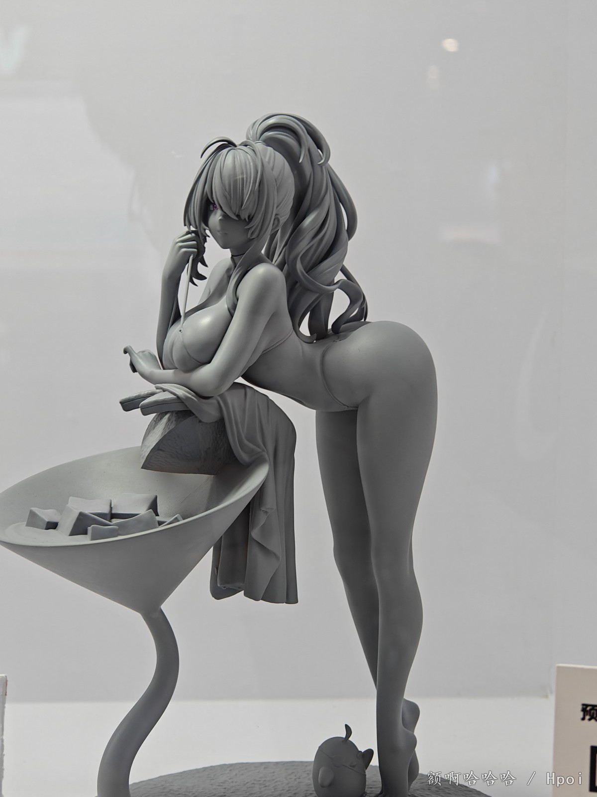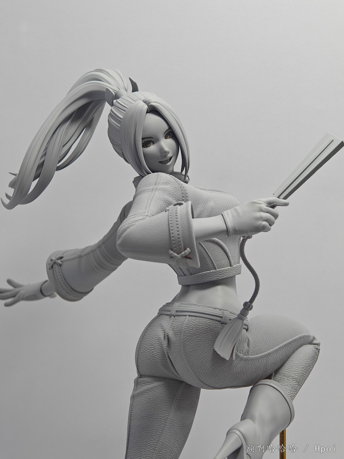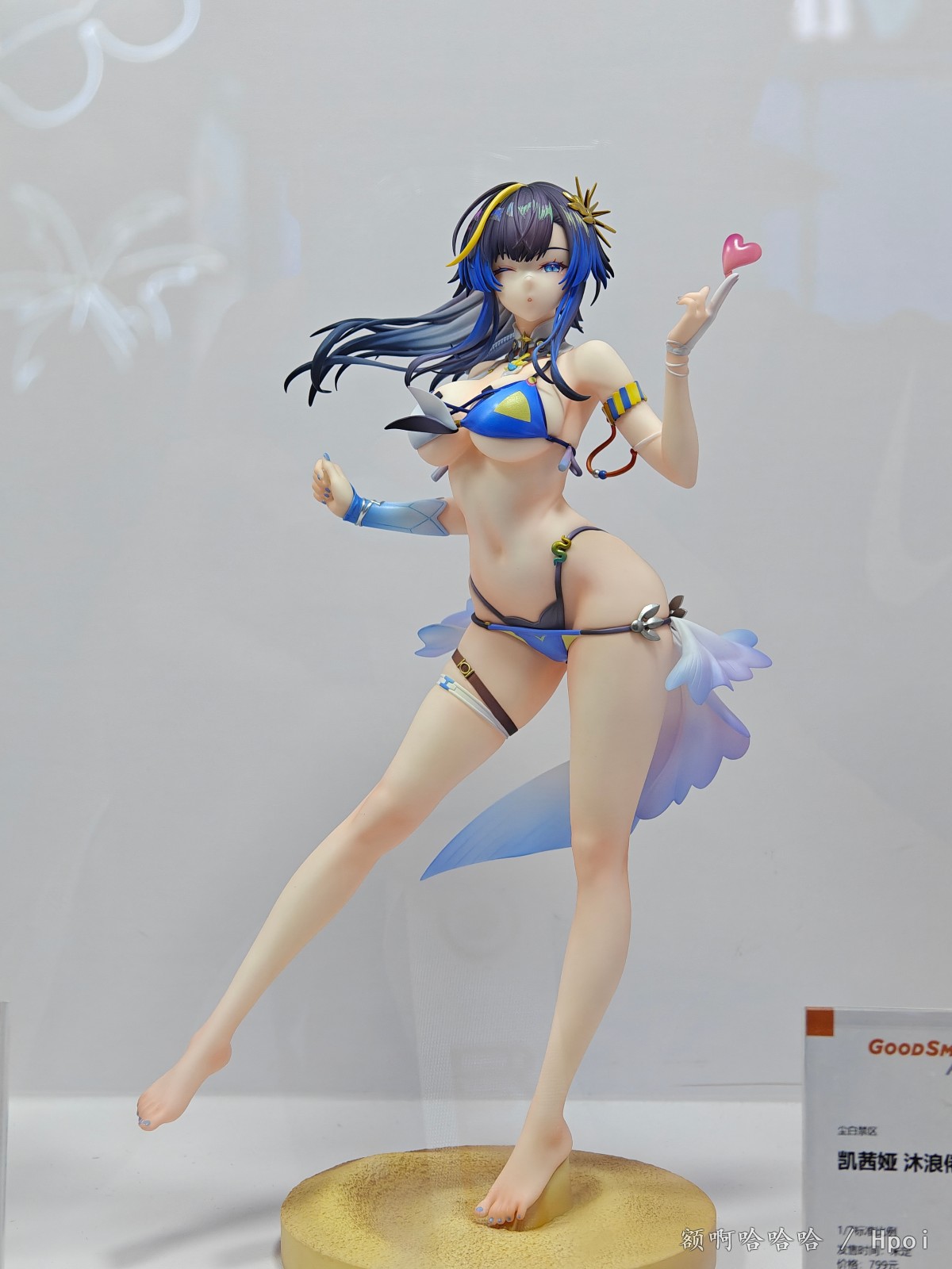 身着充满设计感的蓝色比基尼,凯茜娅摆出轻盈魅惑的姿态,单脚站立在沙滩上,嘴角带笑、眨眼送出爱心手势,展现出她俏皮又迷人的一面。细腻的涂装表现出肌肤的柔滑质感与阴影变化,发丝则采用的丰富的渐变效果,与金色发饰相得益彰。泳装细节、配饰装点以及尾部羽状装饰也被精心还原,整体造型活泼而不失性感。