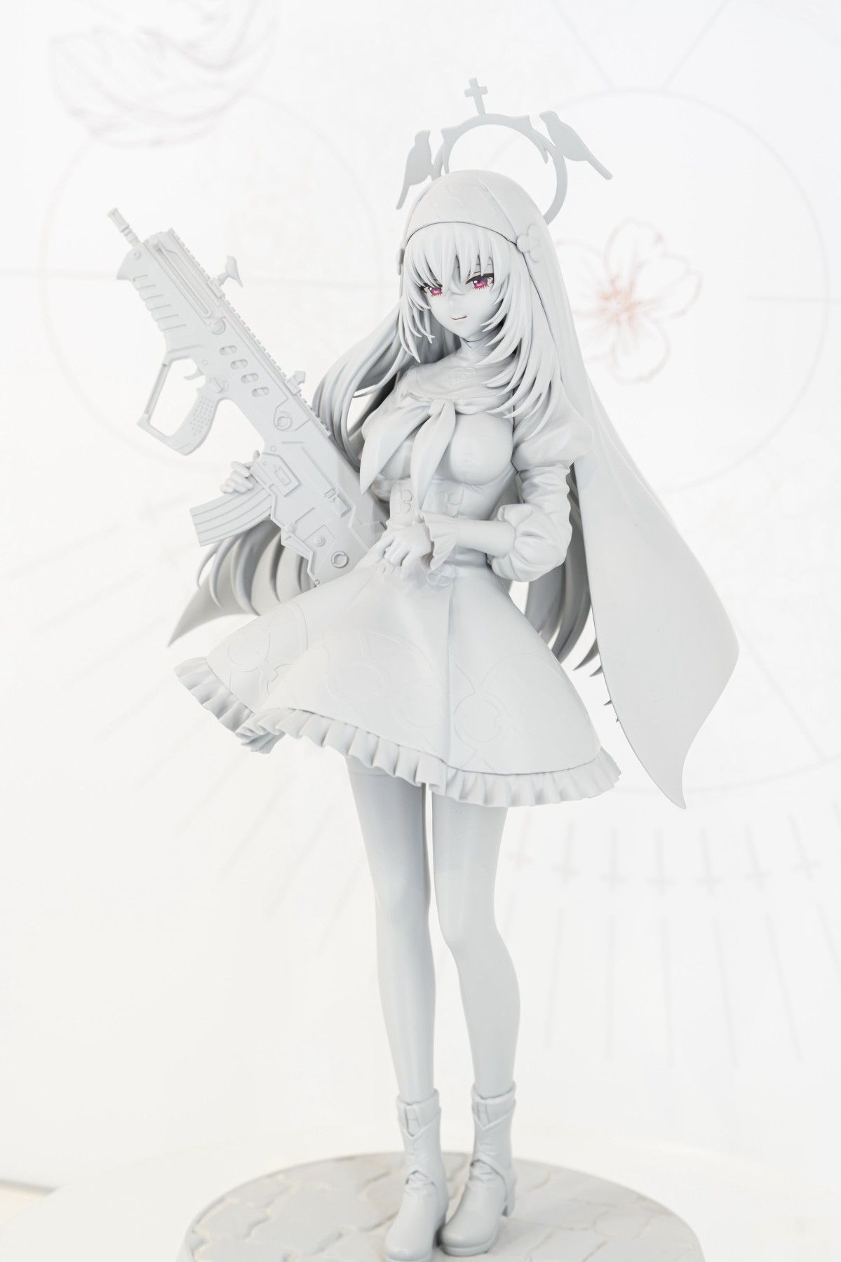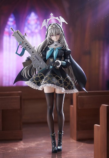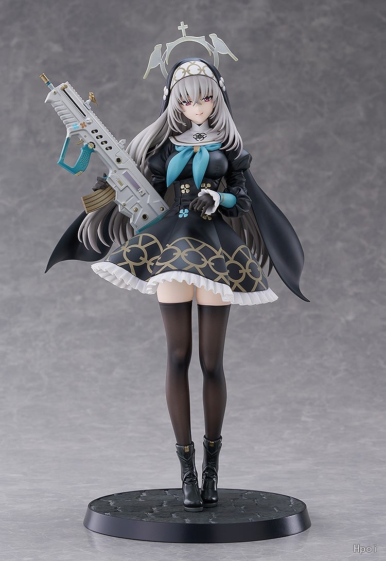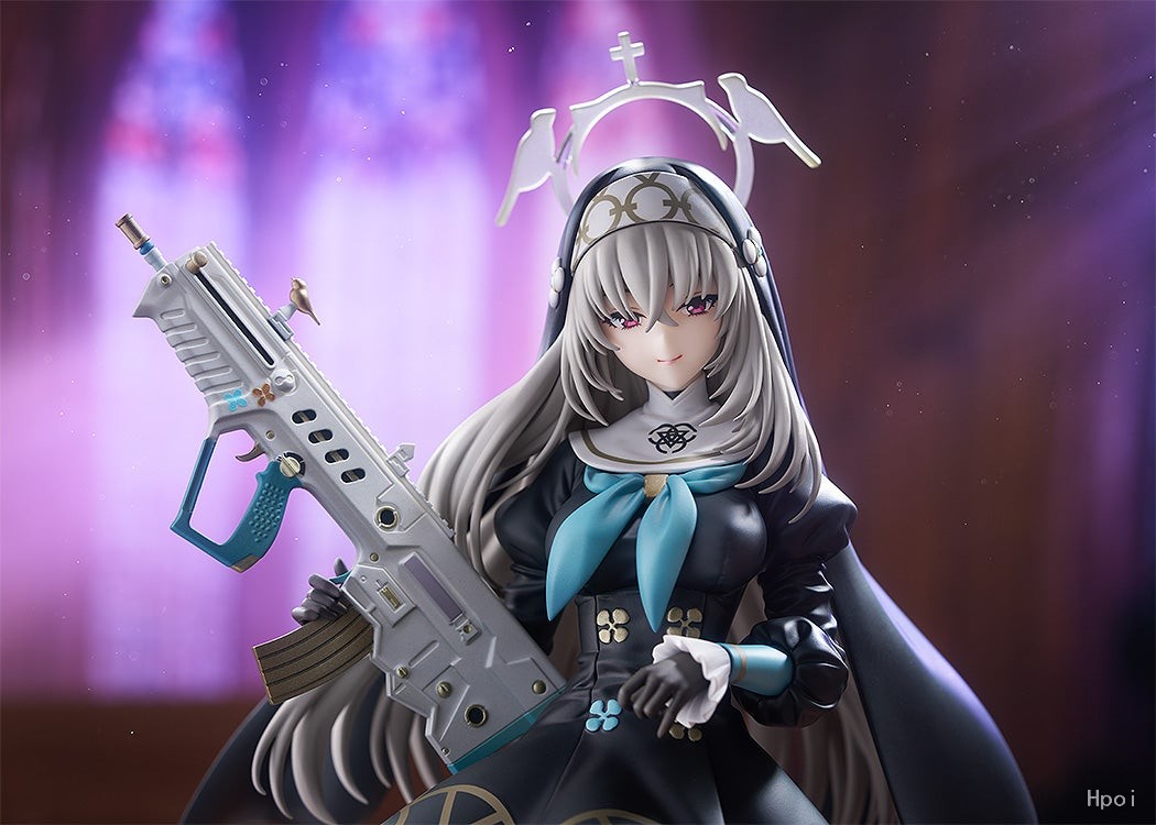 出自人氣遊戲《蔚藍檔案 Blue Archive》,三一綜合學園一年級生且所屬於修女會的「櫻子」化身為1/7比例模型。忠實重現聰慧美麗且站姿優雅的櫻子。黑色修女服上點綴的金色雕飾、微微透出膚色的大腿襪、短裙和過膝襪之間等,都施以講究的造型與色彩。右手持握的專屬武器「淨化之手」和聯想大教堂石板路的台座也十分有看頭。敬請將氣質高雅而美麗的櫻子帶回家鑑賞吧。