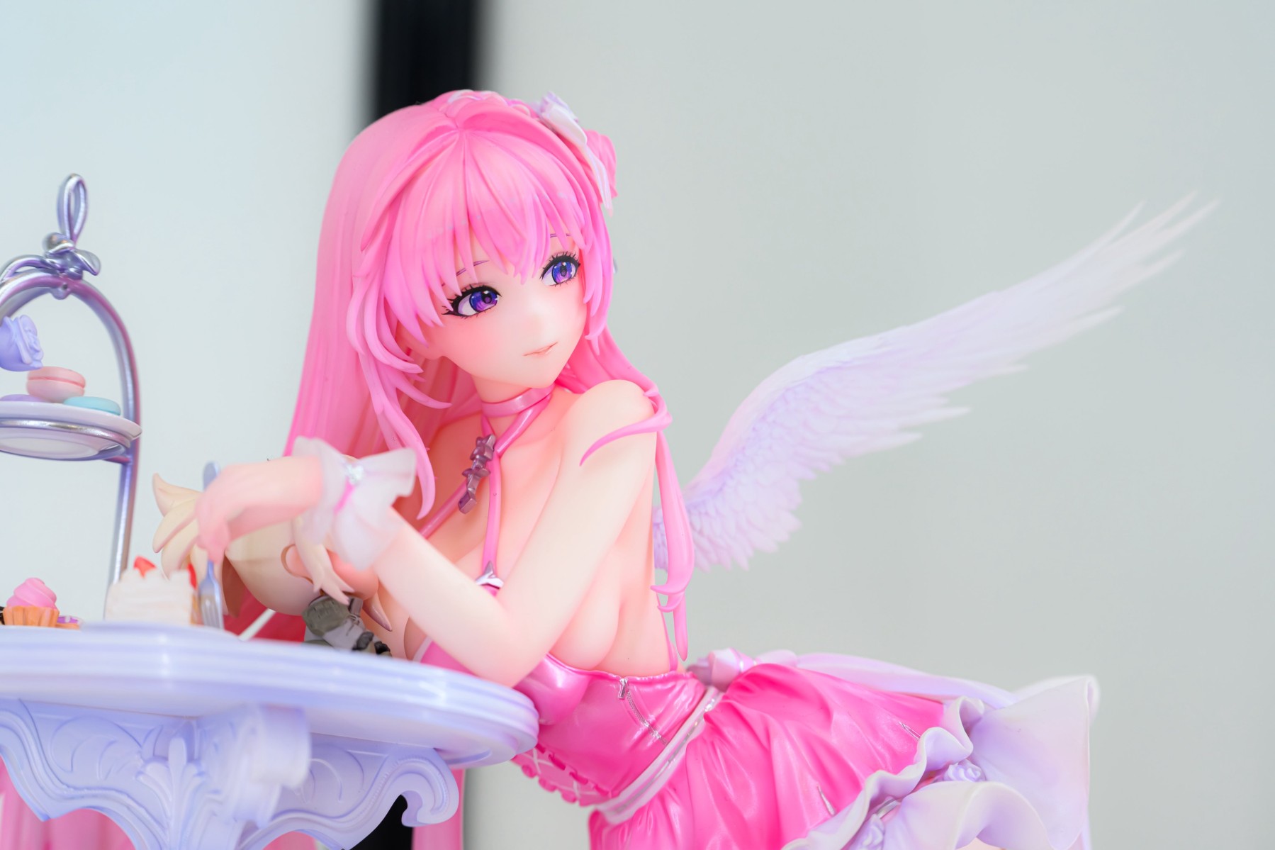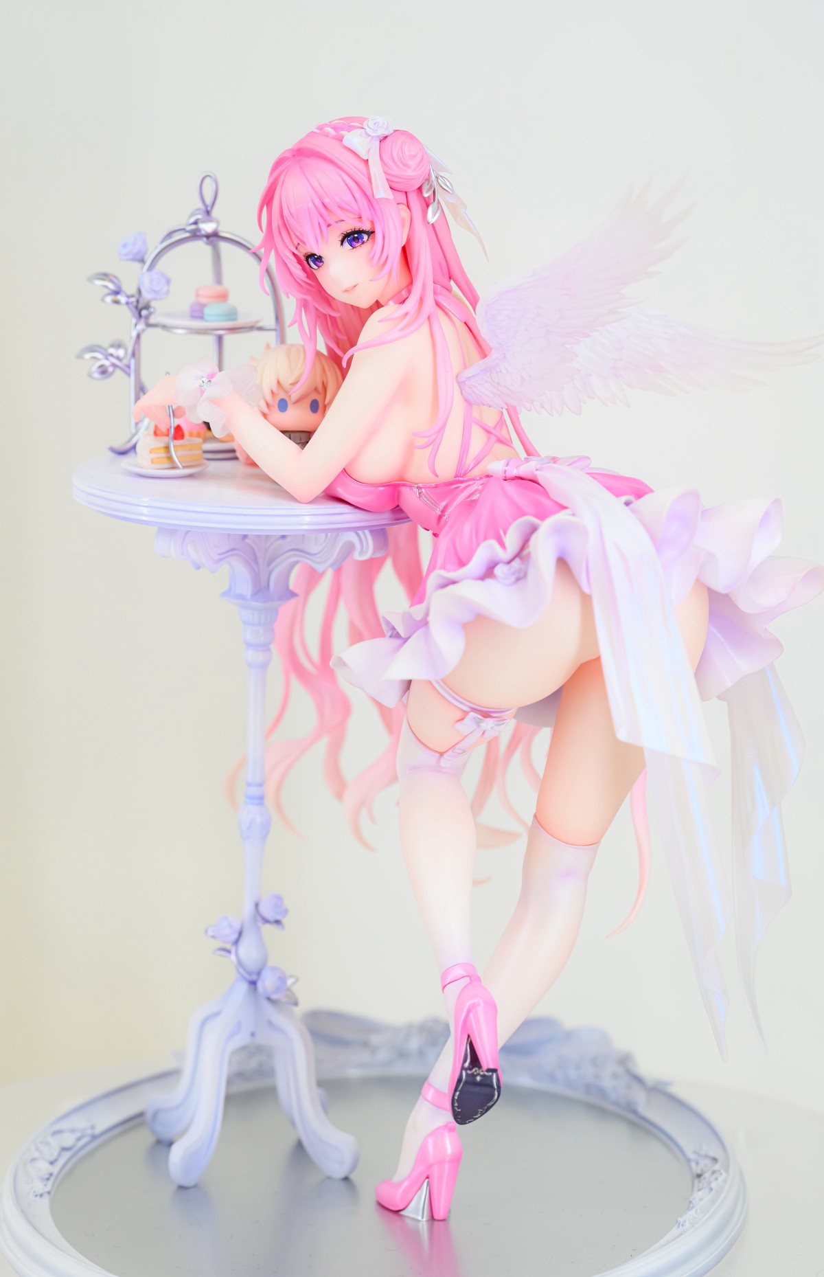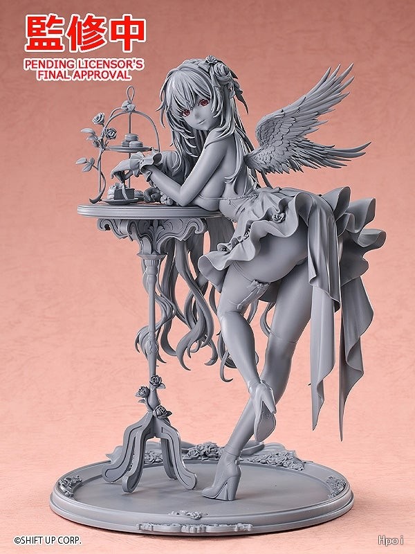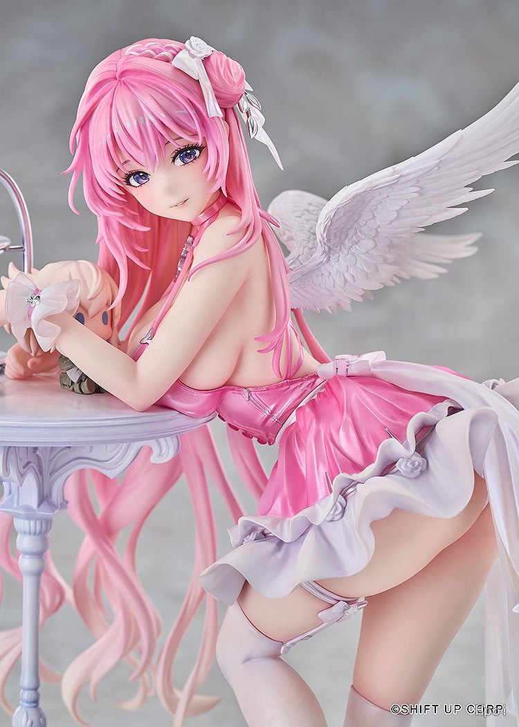 出自適用於iOS/Android/PC,戰場響起的槍聲與羈絆~地面奪還槍械少女RPG《勝利女神:妮姬》,「桃樂絲」以可愛且惹人憐愛的服裝「懷舊」姿態化身為1/7比例模型登場!桃樂絲倚靠在精緻的桌旁,展現出誘人的身材曲線的同時,露出溫柔的微笑。在瞳孔的深處,似乎隱藏著更深邃的東西。細膩的服裝皺褶與色彩完美重現了原畫中的質感,精心造型的翅膀與配飾,更是將她的可愛與優雅兼具的魅力發揮到極致。也精緻重現了桌上的甜點和皮娜的玩偶。各位指揮官們,敬請將這款優雅的「桃樂絲:懷舊」帶回家細細鑑賞吧!