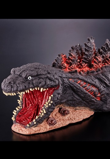 压倒性的尺寸感和重量。将“二次元的森林哥斯拉迎击作战”的设施直接造型化,不仅仅是哥斯拉的半身像,地面的造型和固定哥斯拉的螺栓也是立体化的模型。成型颜色也不仅仅是黑色,还巧妙地混合了茶色和灰色的元素,表现出哥斯拉独特的肌肤感。牙齿也一颗一颗地进行了仔细的涂装,背鳍的红色涂装也进行了类似渐变的涂装。意识到更加现实的设施立体化而备受瞩目的sofbi。