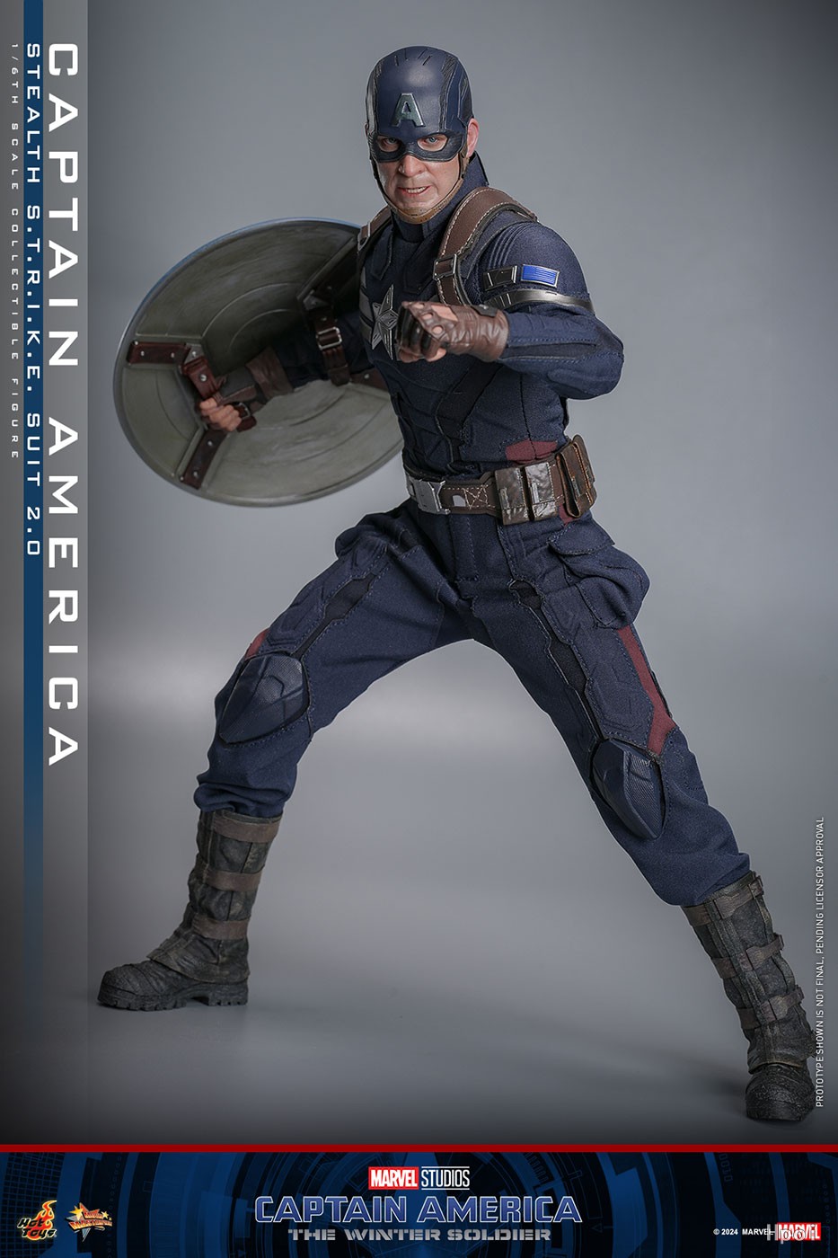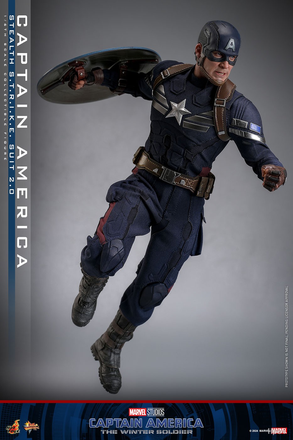在服饰的设计上,Hot Toys参照深蓝色S.T.R.I.K.E.潜行战衣的设定,以精致的车缝和浮雕压纹技术处理战衣,无论是胸前的哑银色星型徽章、银色间纹、装备腰带以至肩背带扣均提升了外观的细致程度,还原出电影开场时美国队长那富有层次感的潜行服造型。