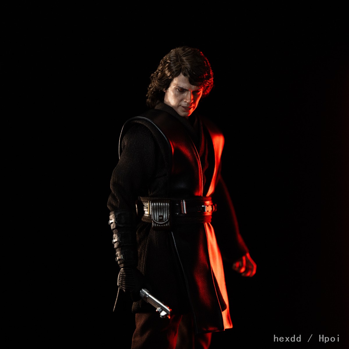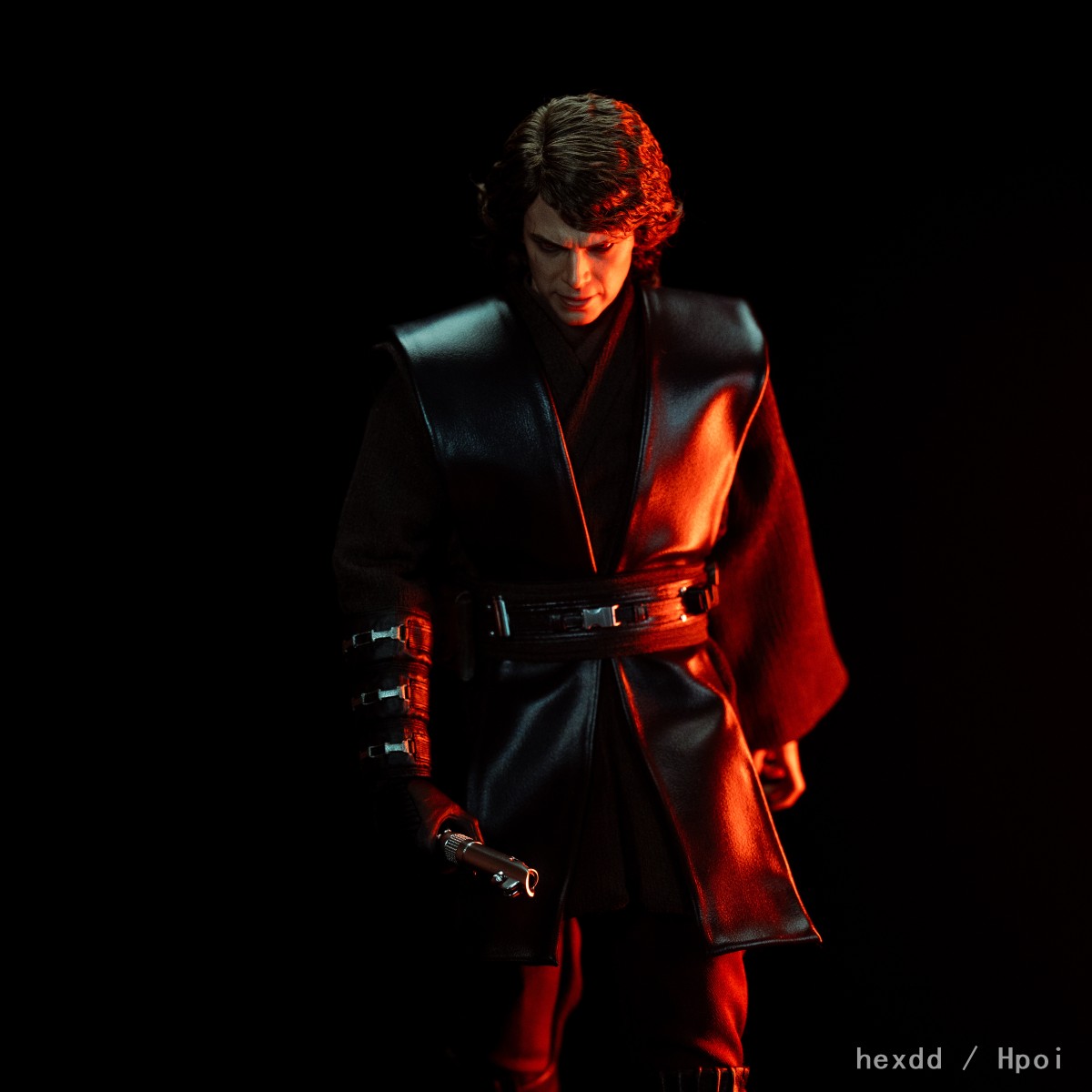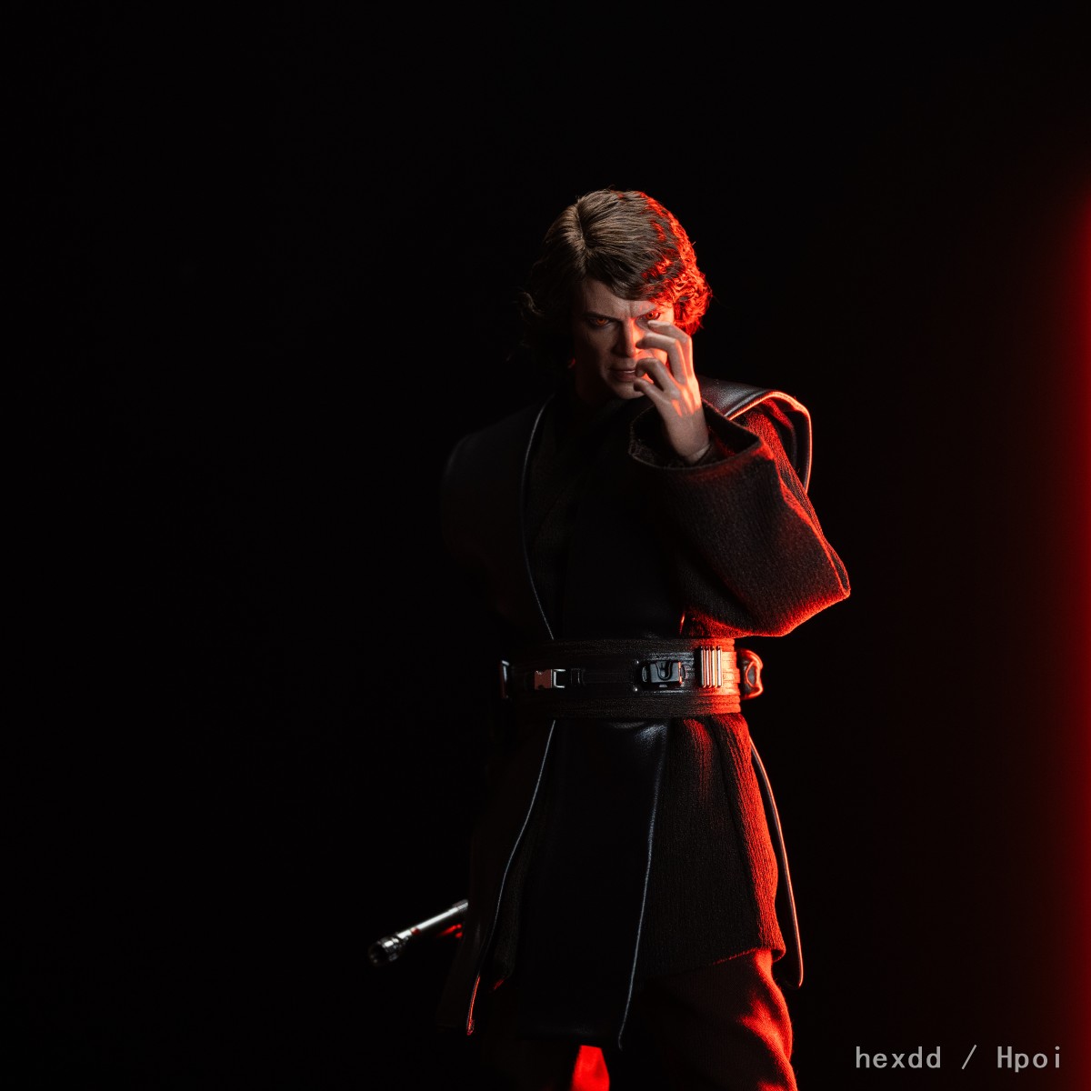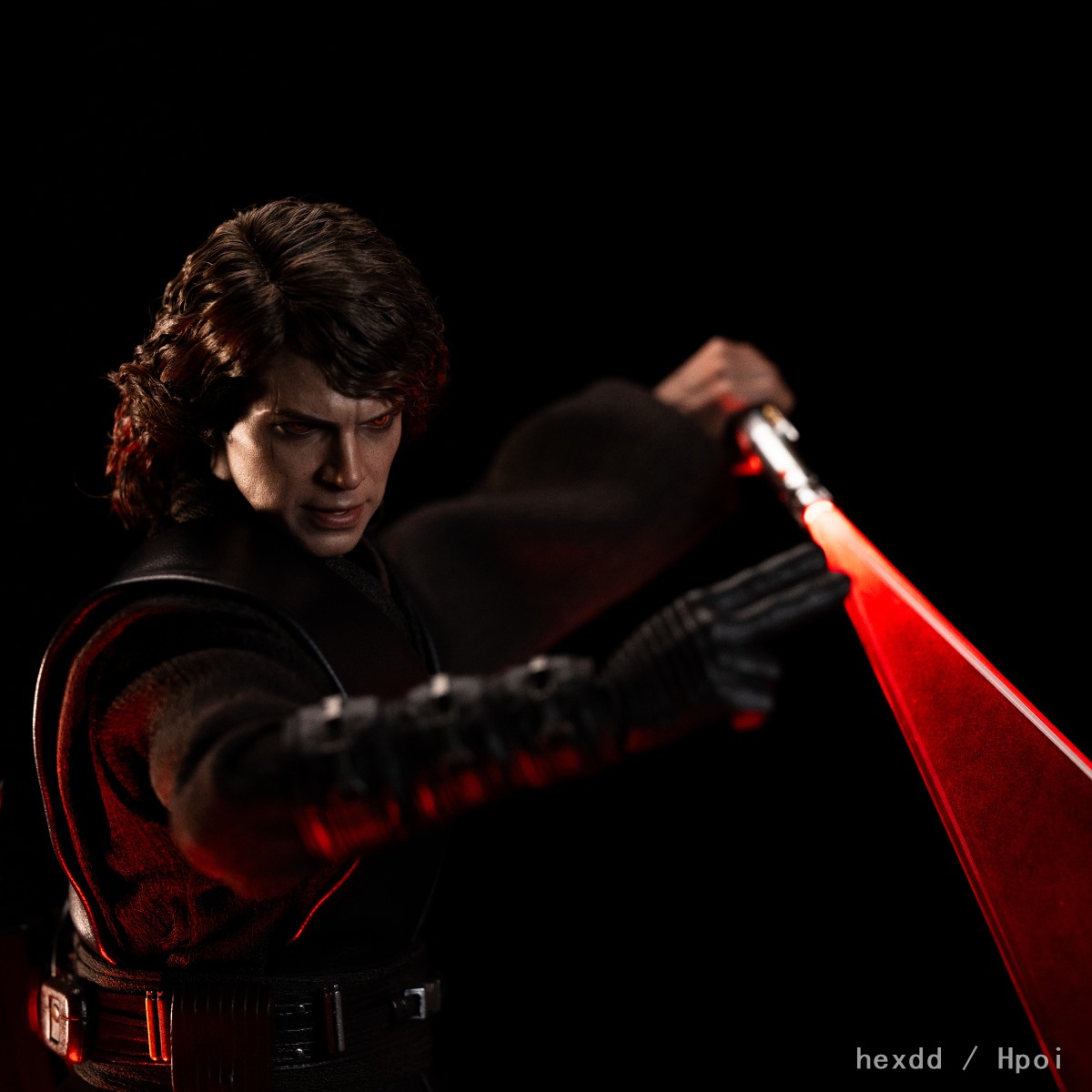 Hot Toys团队以安纳金·天行者最终堕入黑暗面、转变成为西斯学徒的关键时刻为设计来源,倾力打造1:6比例珍藏人偶。头雕师团队采用羊毛植发技术,以全手工工艺将轻盈纤细的深棕色卷发逐条还原于1:6角色头雕上;同时复刻出演员海登·克里斯滕森(Hayden Christensen)深邃的五官轮廓,并搭配可动眼球设计。一双泛着橘红色光芒的西斯之眼仿佛燃烧着无尽怒火,眼神中蕴含着仇恨与黑暗面的力量,散发出令人不寒而栗的压迫感。