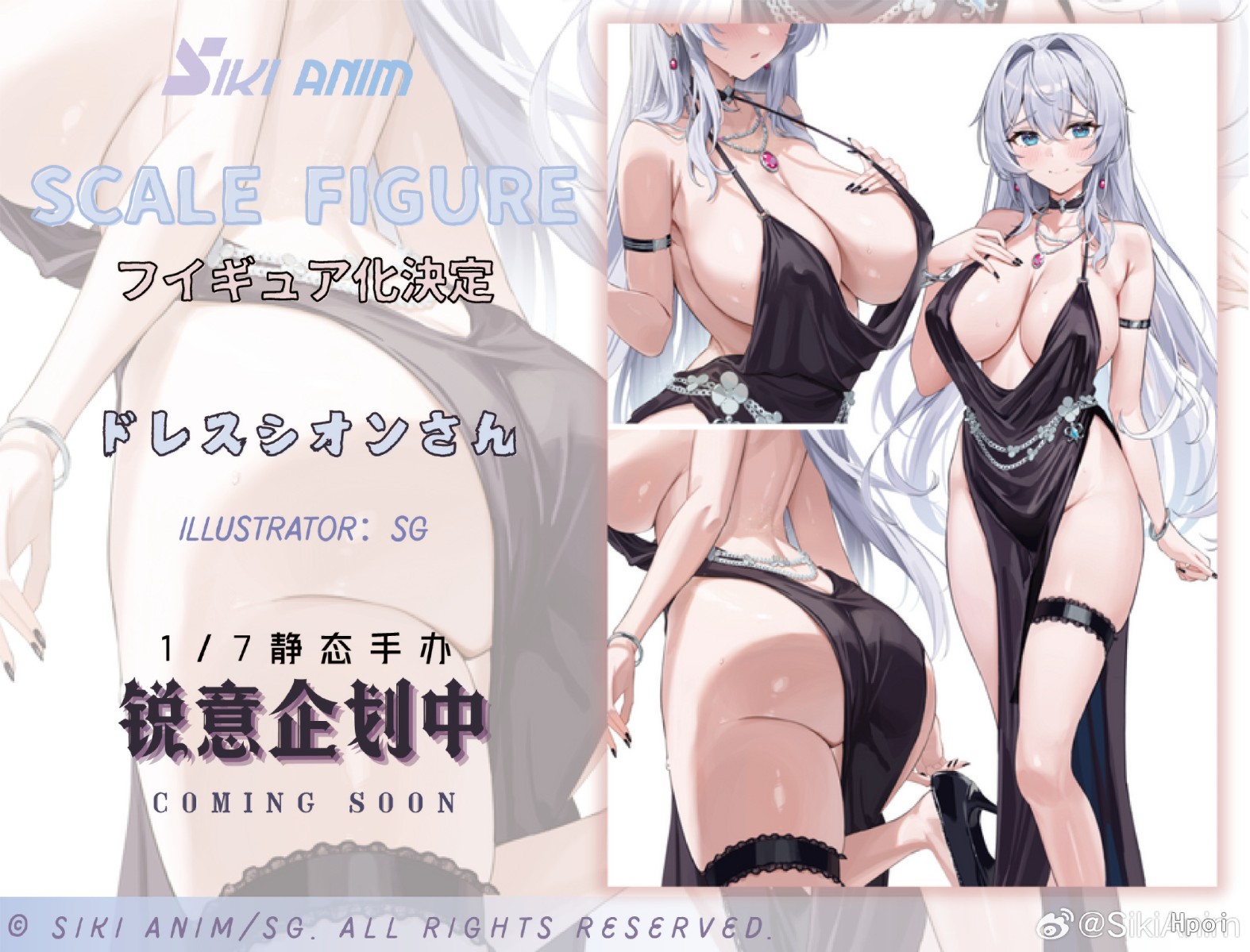 「企划通告」SikiAnim已正式获得日本高人气画师: SG老师的授权,将以其笔下极具魅力的角色——(ドレスシオンさん为)原型,全力打造一款集优雅、性感与高贵于一体的收藏级手办!—————————————————————-月光般倾泻的长发,映衬着一双藏有星海的湛蓝眼眸。她微启双唇,欲言又止的羞涩,是一切心动的开始。