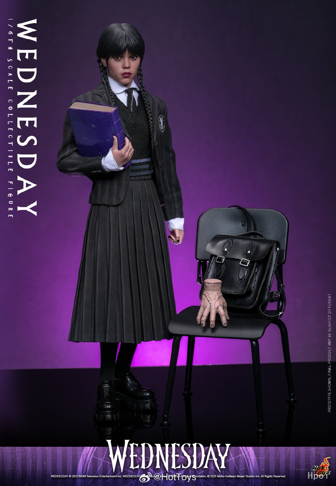 服饰方面,Hot Toys忠实还原了由蒂姆·波顿御用服装设计师柯琳·阿特伍德(Colleen Atwood)操刀的奈落学院(Nevermore Academy)制服。团队依照原版绘图以真人服装制作工艺精心打造。西装外套饰有带渐变效果的灰黑条纹并附有学院徽章,考究搭配仿针织背心、纯白衬衫、条纹领带及优雅百褶裙,脚上的黑色厚底鞋更是点睛之笔,为整体学院风造型注入一抹低调的叛逆感。