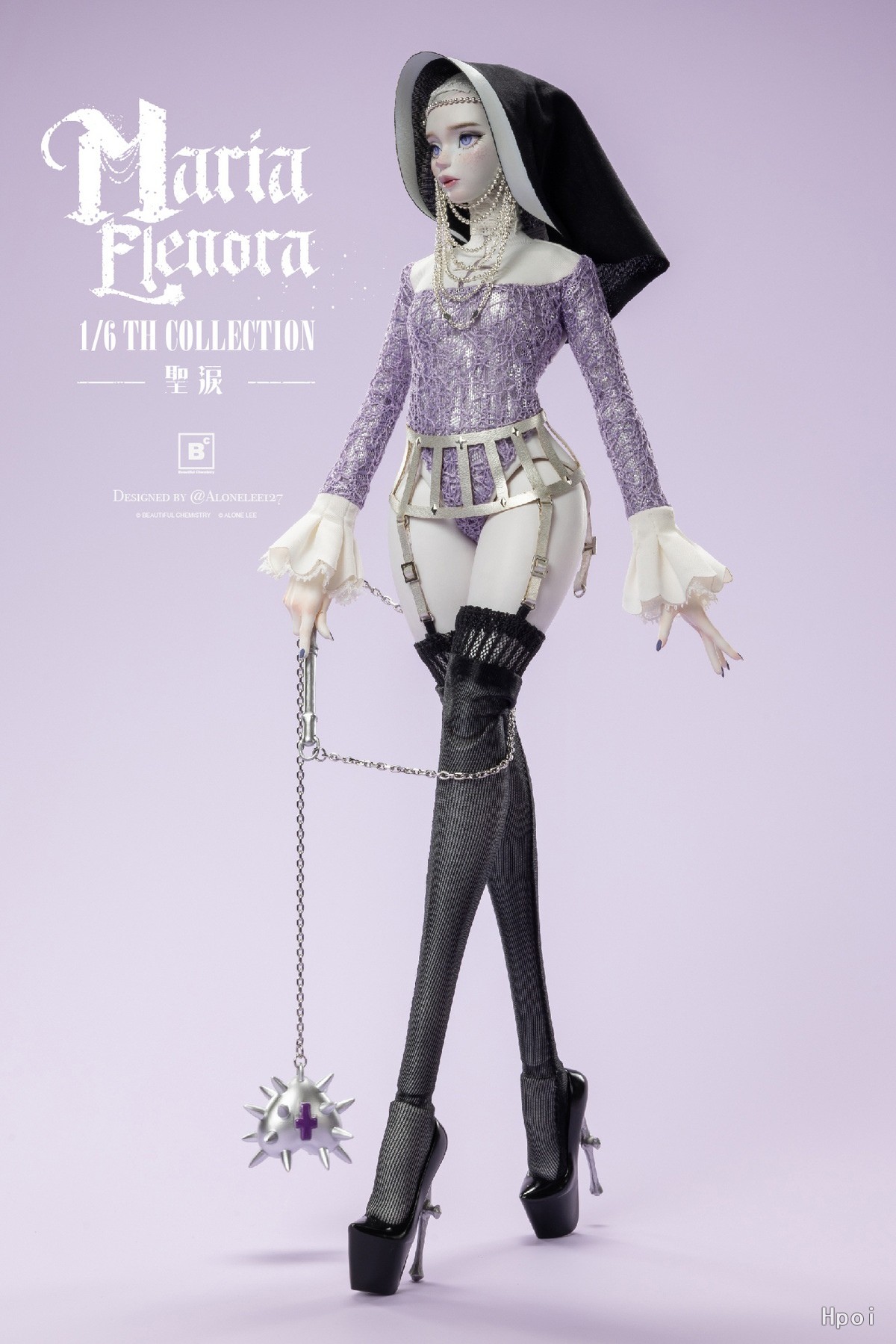 精细剪裁分层修女服,内搭紫色蕾丝连体衣、银色吊带束腰及长袜!