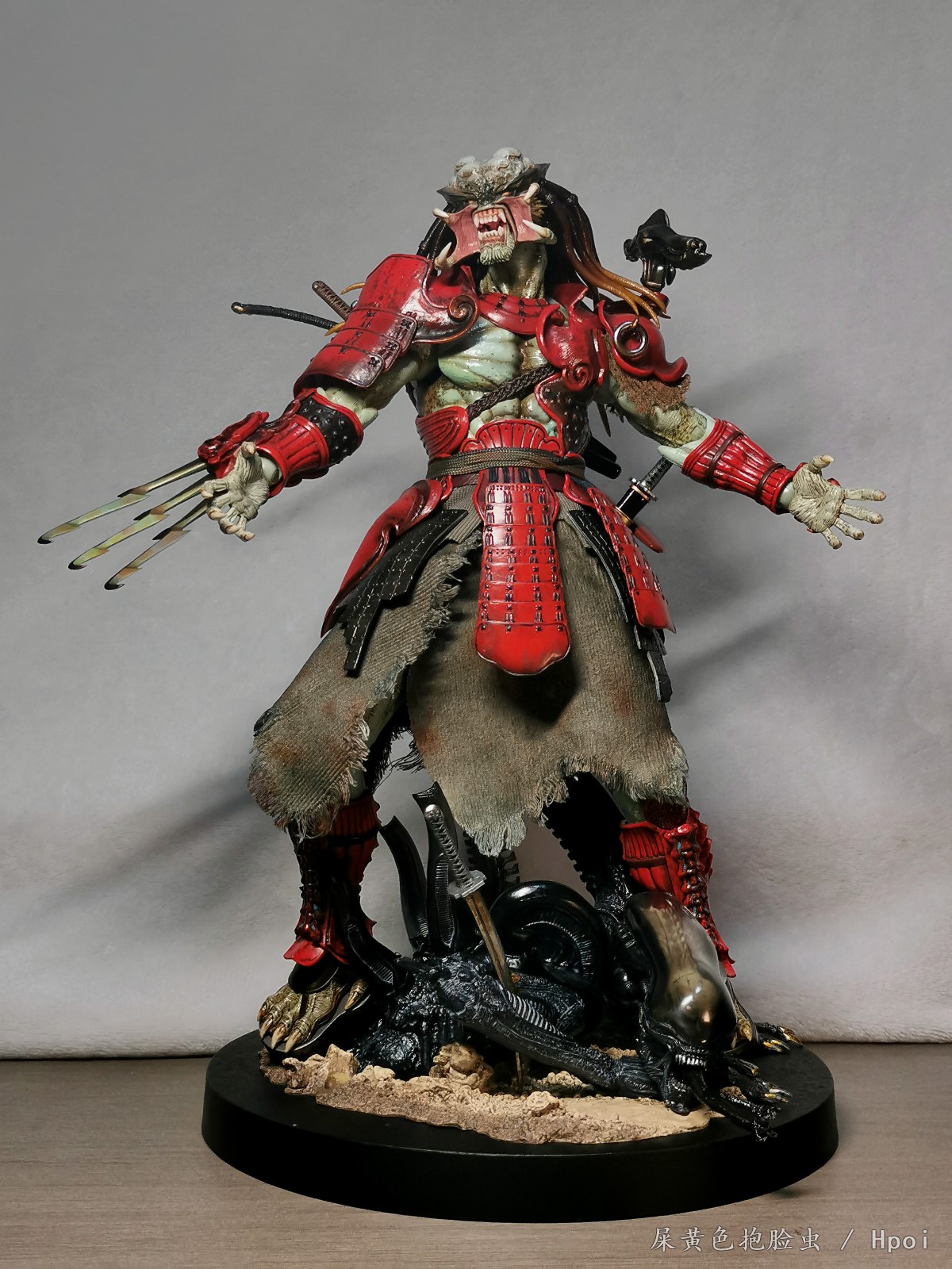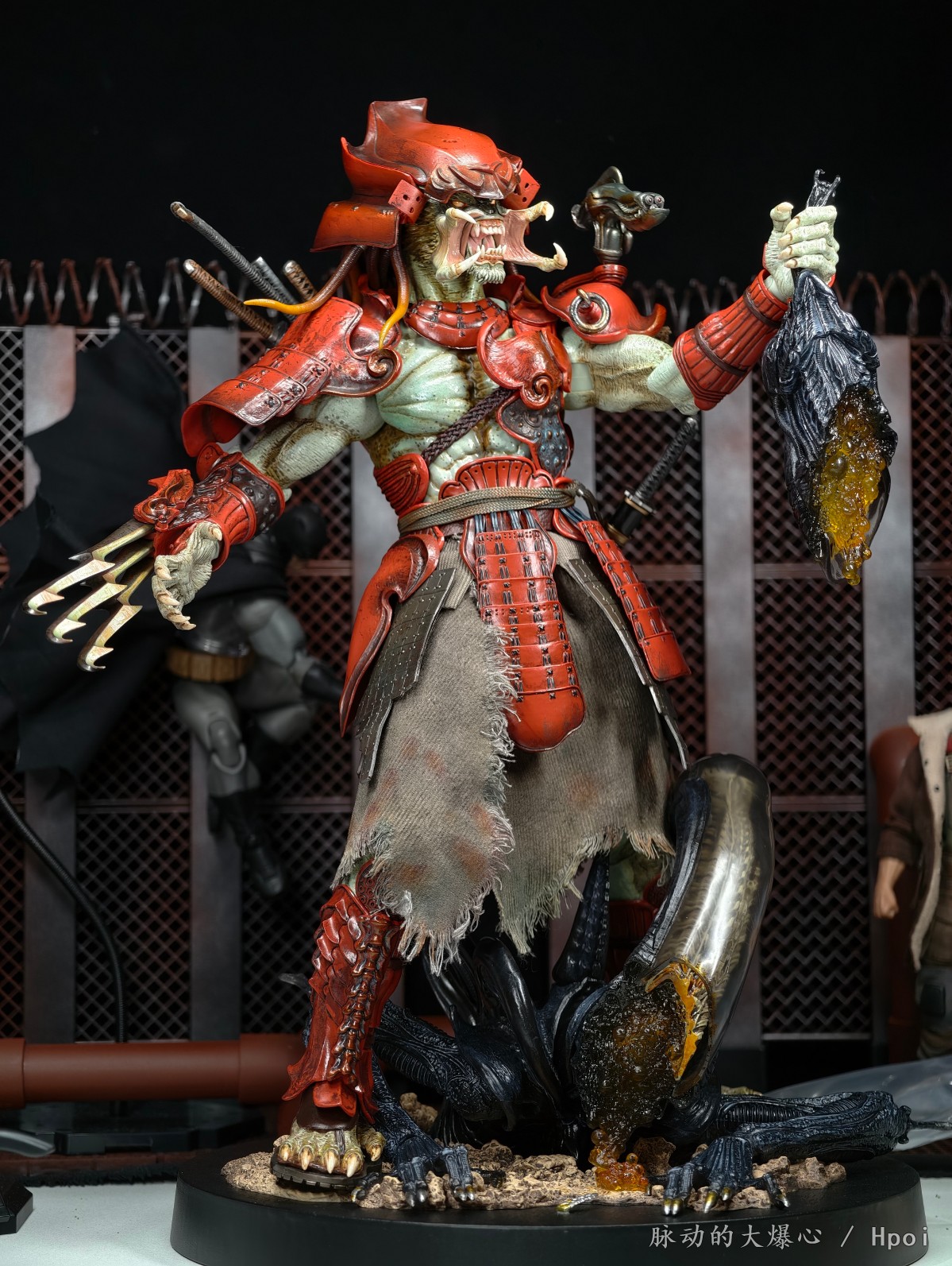 武器配件十分多样化,从可活动的左肩激光炮到传统金属武士刀、右手腕刃、再到一把被异形血液腐蚀的破损武士刀具,搭配半边异形首级及舌头配件,与铁血战士喜好收集对手的头骨作为狩猎战利品的尚武文化相呼应。特别设计情景地台则以激战异形为主题,写实演绎异形蜿蜒的黑色身躯、半透明头壳及拟真的伤口细节,无疑为珍藏人偶的展示增添更多可能,同时极致表现出赤鬼武士铁血战士为荣誉杀戮的追求!