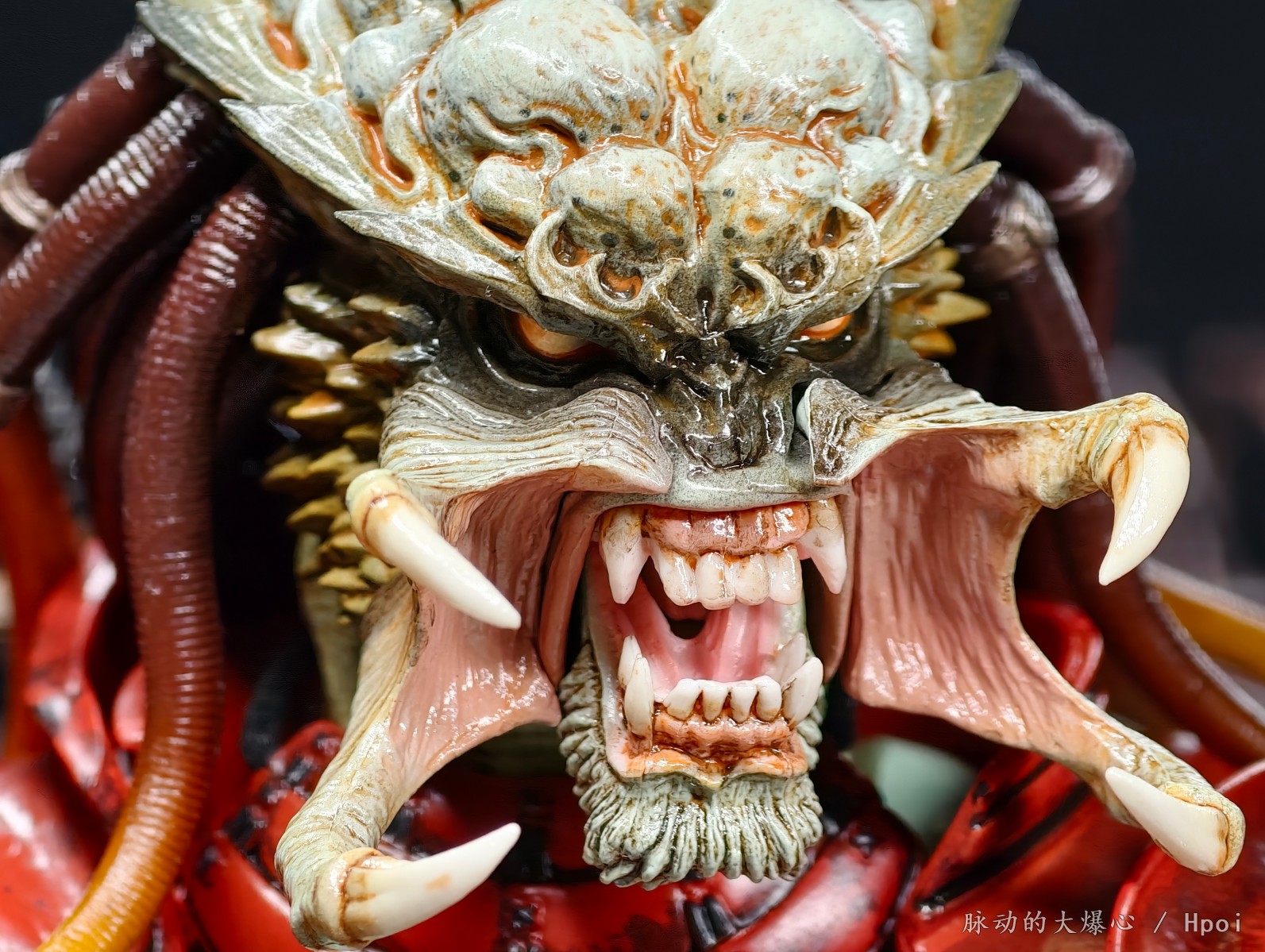 在头雕的设计上,由另鬼木佑二大师操刀,凭借丰富经验将铁血战士标志性头部轮廓、颚部特征、冷酷的眼神、狰狞的血盆大口与獠牙刻划得细致无遗。用软胶制作的一头充满野性的触须辫子、可活动下颚及两组嘴型,生动打造出张口咆哮的凶猛模样。