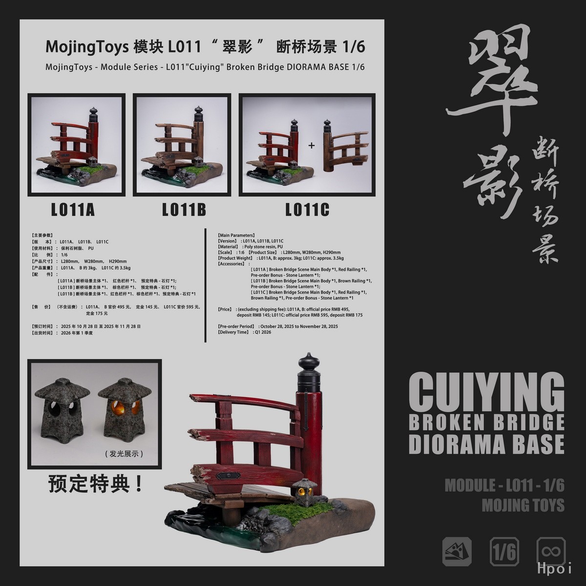“断桥凝翠影,苔痕印清寂”,MojingToys 推出新品 “翠影” 断桥场景。该产品提供红色及棕色双色选择,现阶段预定可赠送特典石灯一个,详细参数如下: