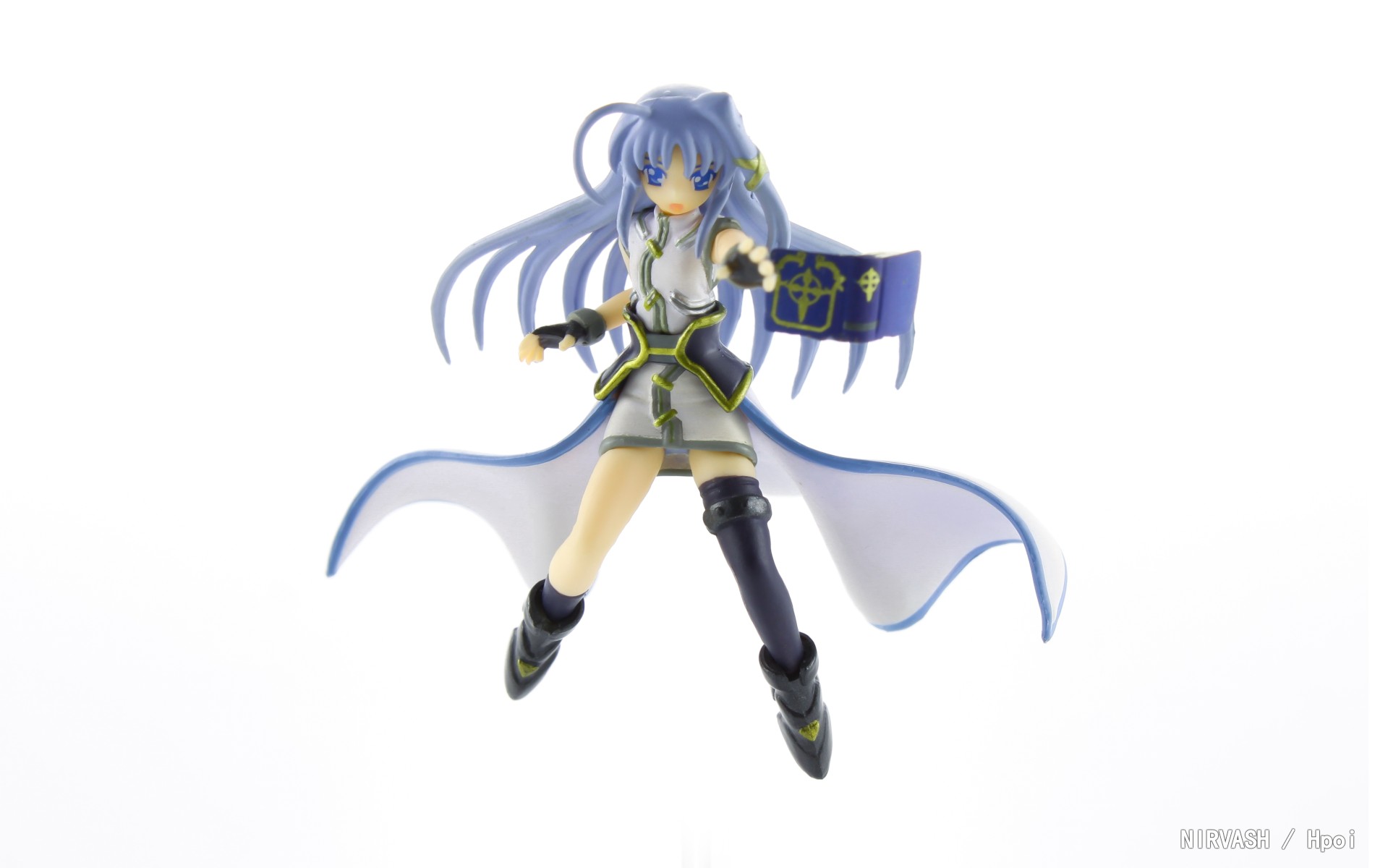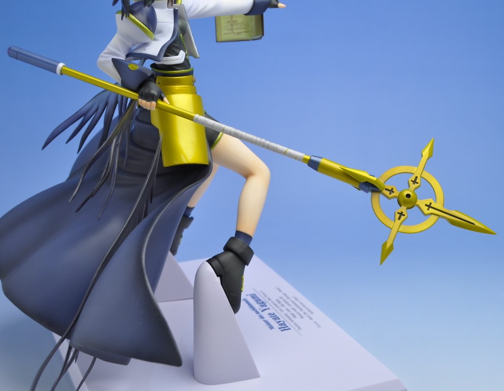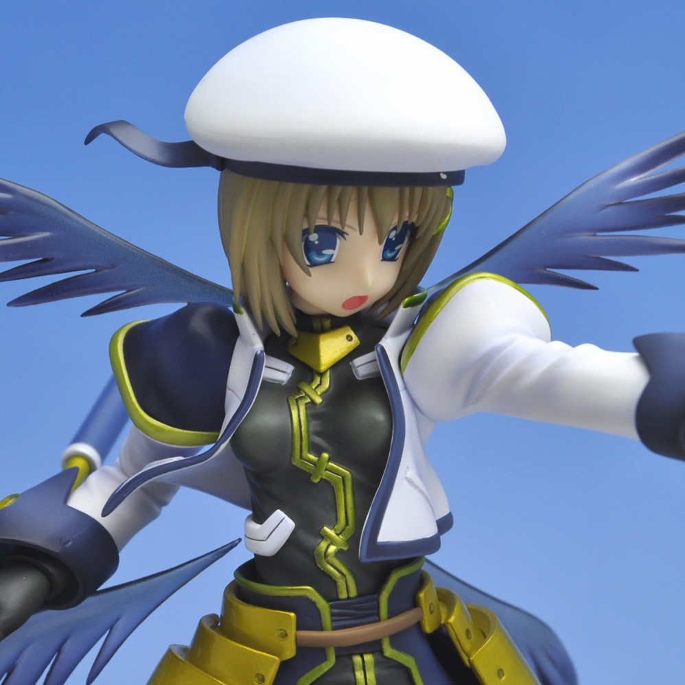 手を前に突き出し、空間いっぱいにマントと羽を広げた迫力あるポージングで立体化。バリアジャケットを身に纏い、強い意志を感じさせる精悍な表情は心地よい緊張感を与えてくれます。