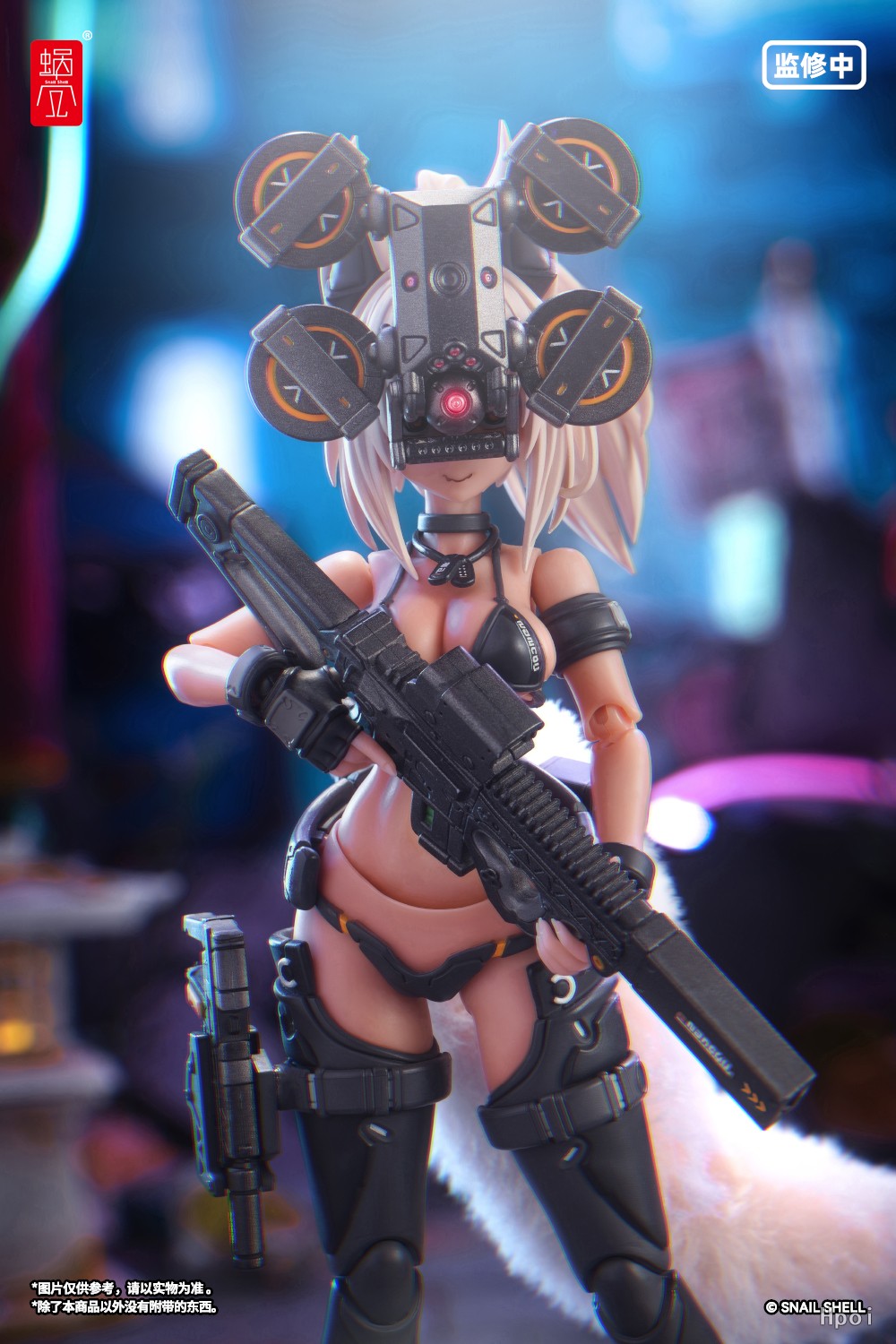 6.产品附带的两架无人机,可以通过3mm接口与蜗之壳透明支架套装进行连接。无人机前端的球状摄像头可以进行上下转动。角色还可以握住无人机前端的握柄进行短距离的移动或紧急迫降。