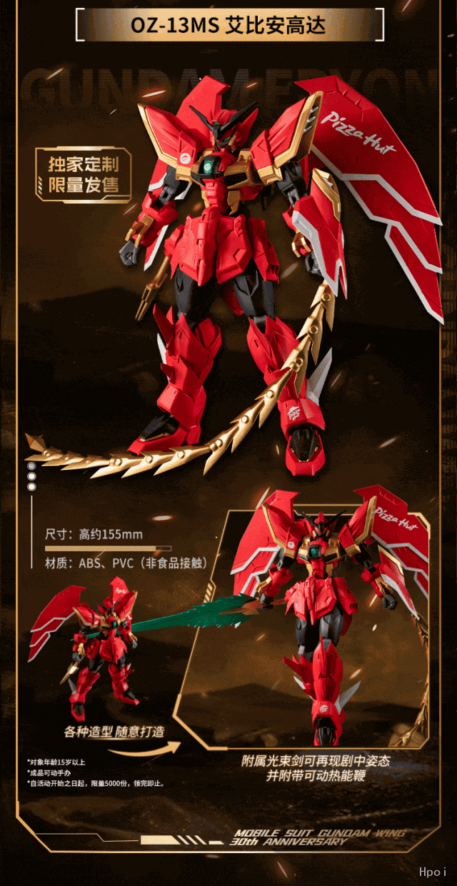 二. 联动实物周边共2款;其中:联名GUNDAM UNIVERSE艾比安高达(必胜客定制款)5000份,GUNDAM UNIVERSE飞翼高达零式(必胜客定制款)5000份;均自本活动开始之日起随餐发放,发完即止。如活动产品售完,则本活动提前结束。