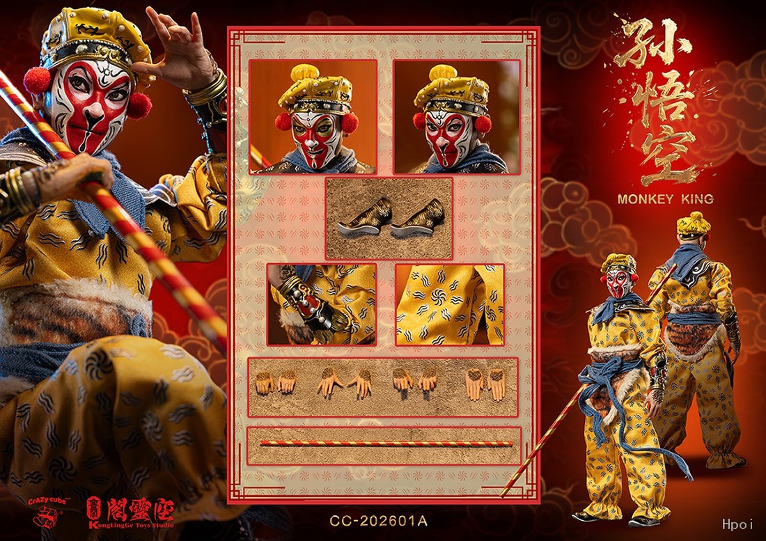 1/12戏猴CC-202601B真人头x2(可动眼)猴子头x1(可动眼)超可动素体x2握棍手x2剑指手x2放松手x2拜佛手x2普通鞋x2造型鞋x2配件:护腕x4金箍棒x2(戏剧金箍棒x1)合金金箍棒x1服装:造型1戏服1套虎皮裙x1披肩x1围巾x1飘带x1(内含金属丝)造型2戏服1套围裙x1披肩x1围巾x1