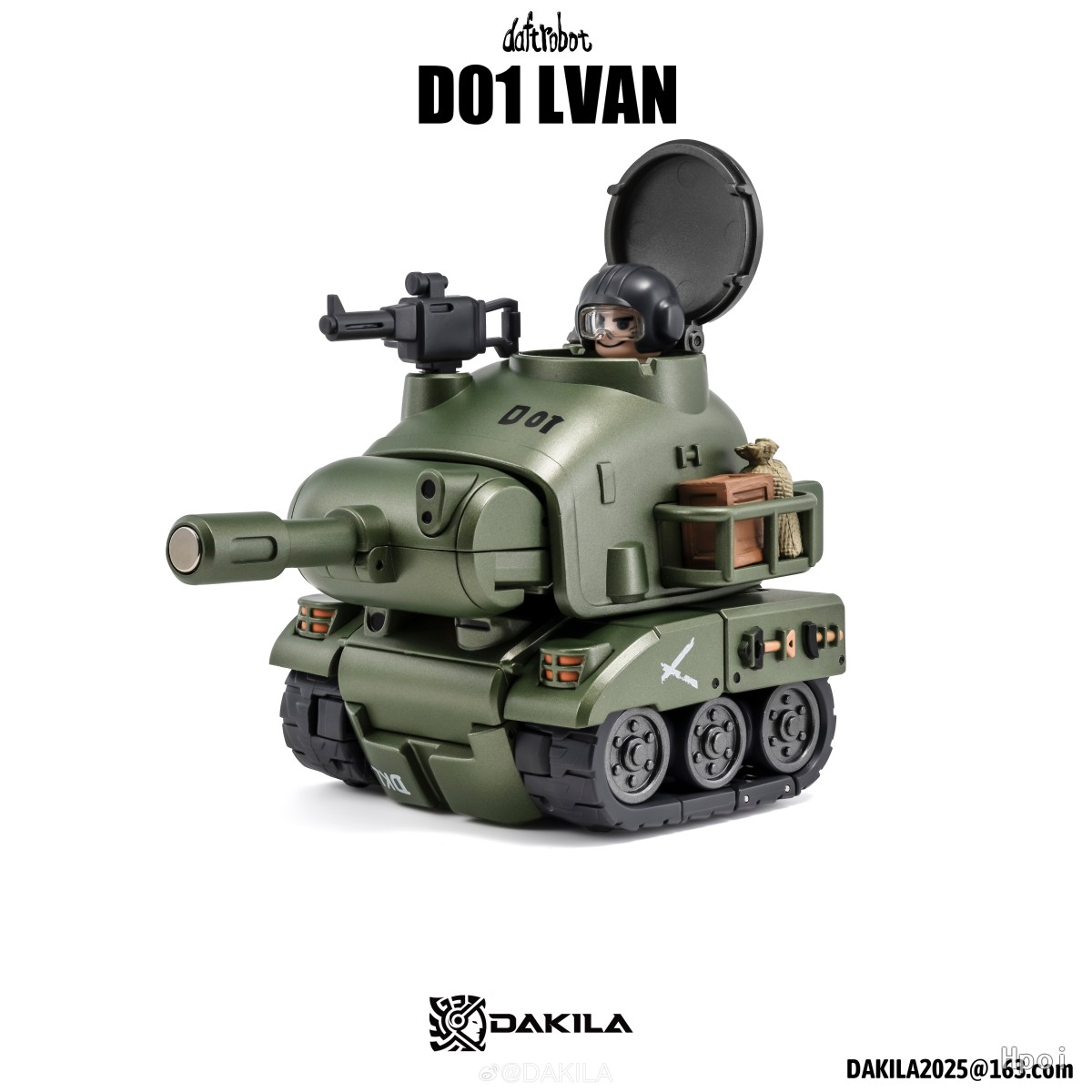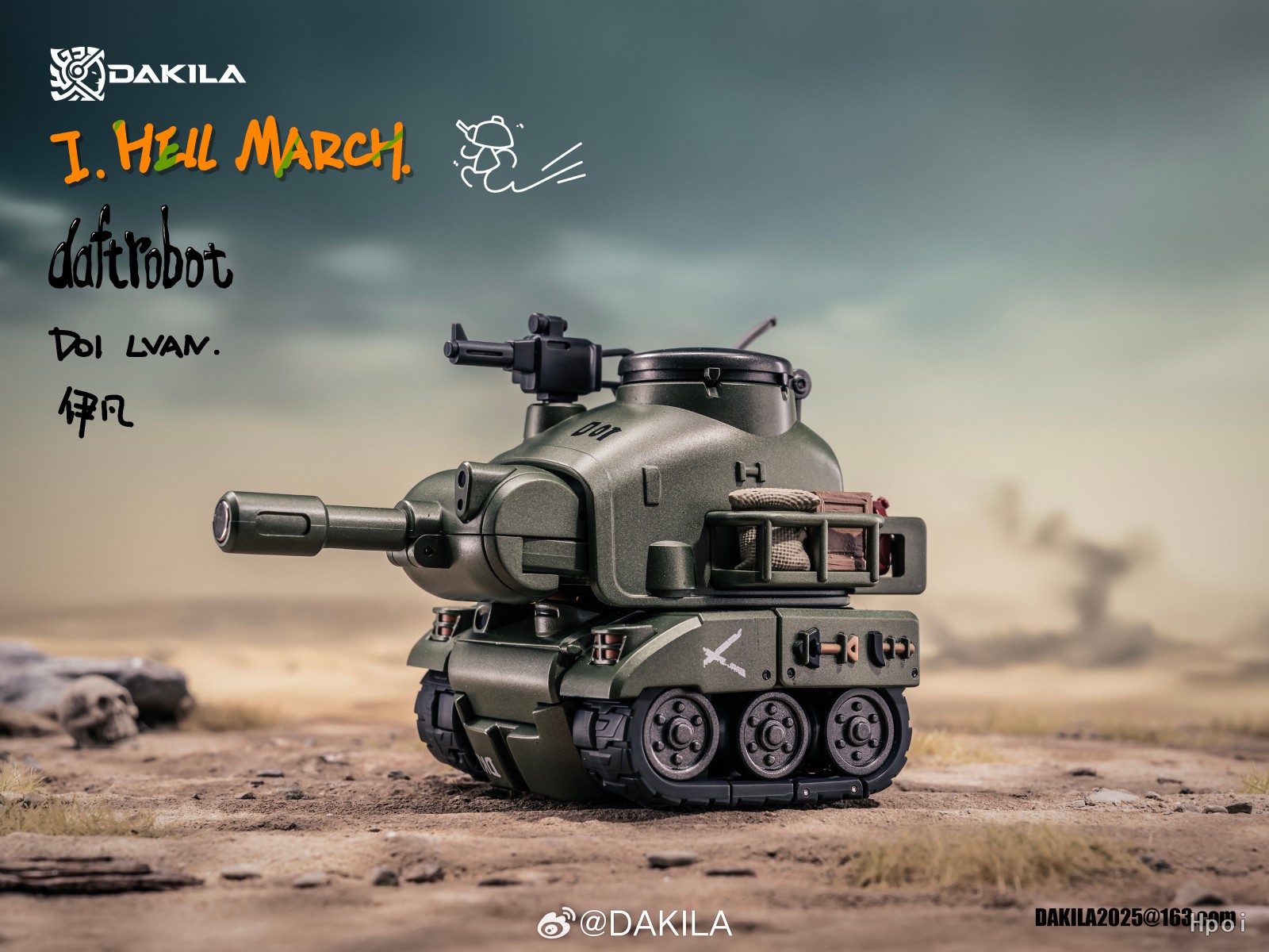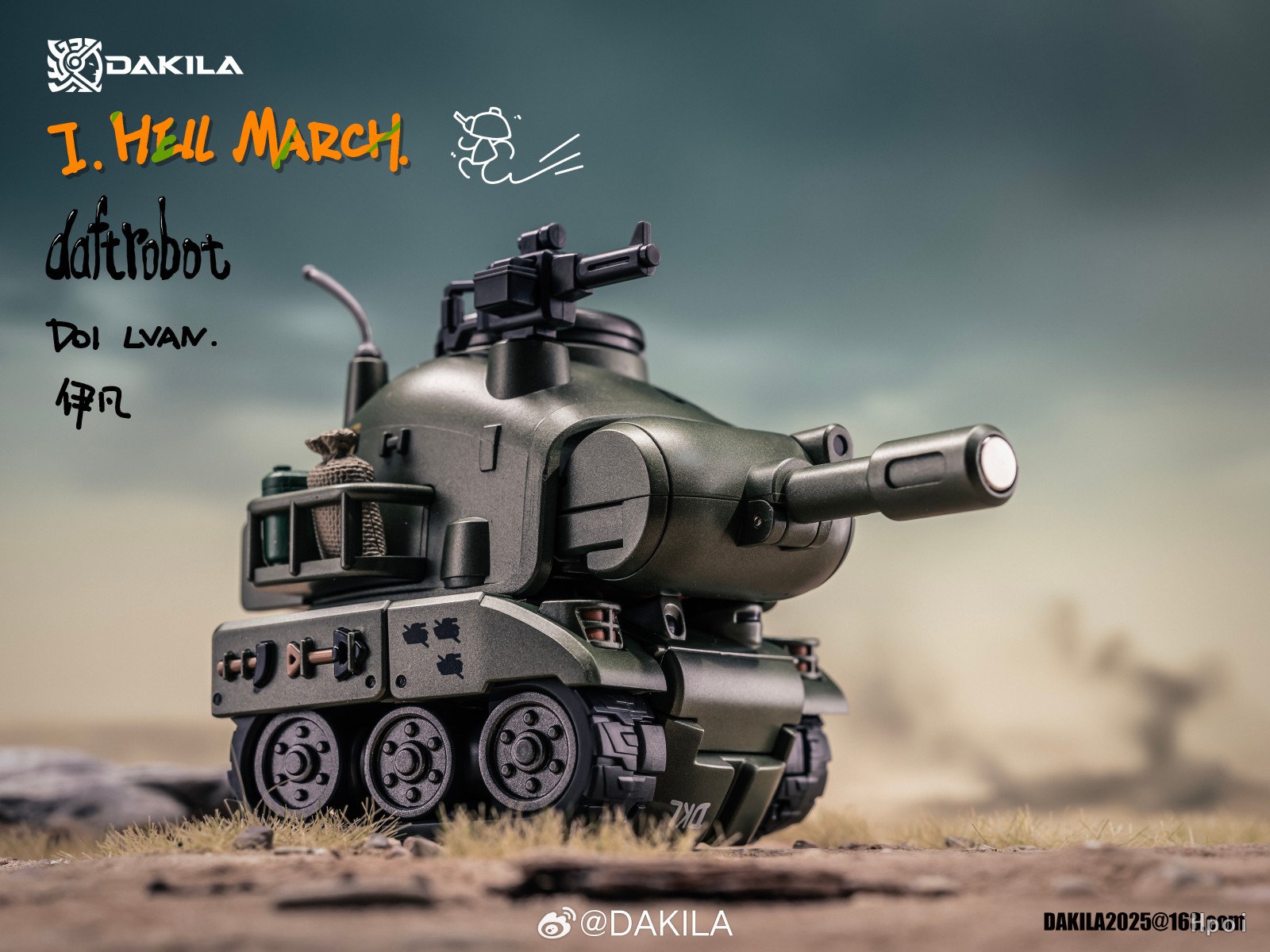 DAKILA DAFTBOTS系列第一篇章:HELL MARCH,第一款作品 D01 LVAN 伊凡 ,可变形机器人,全身烤漆涂装,眼部指针可以独立活动,用锤子触碰眼睛可激活眼部灯光,坦克形态可流畅在桌面滚动,包含一个独立可动人仔可在伊凡机器人状态下和坦克状态下安装在驾驶室。