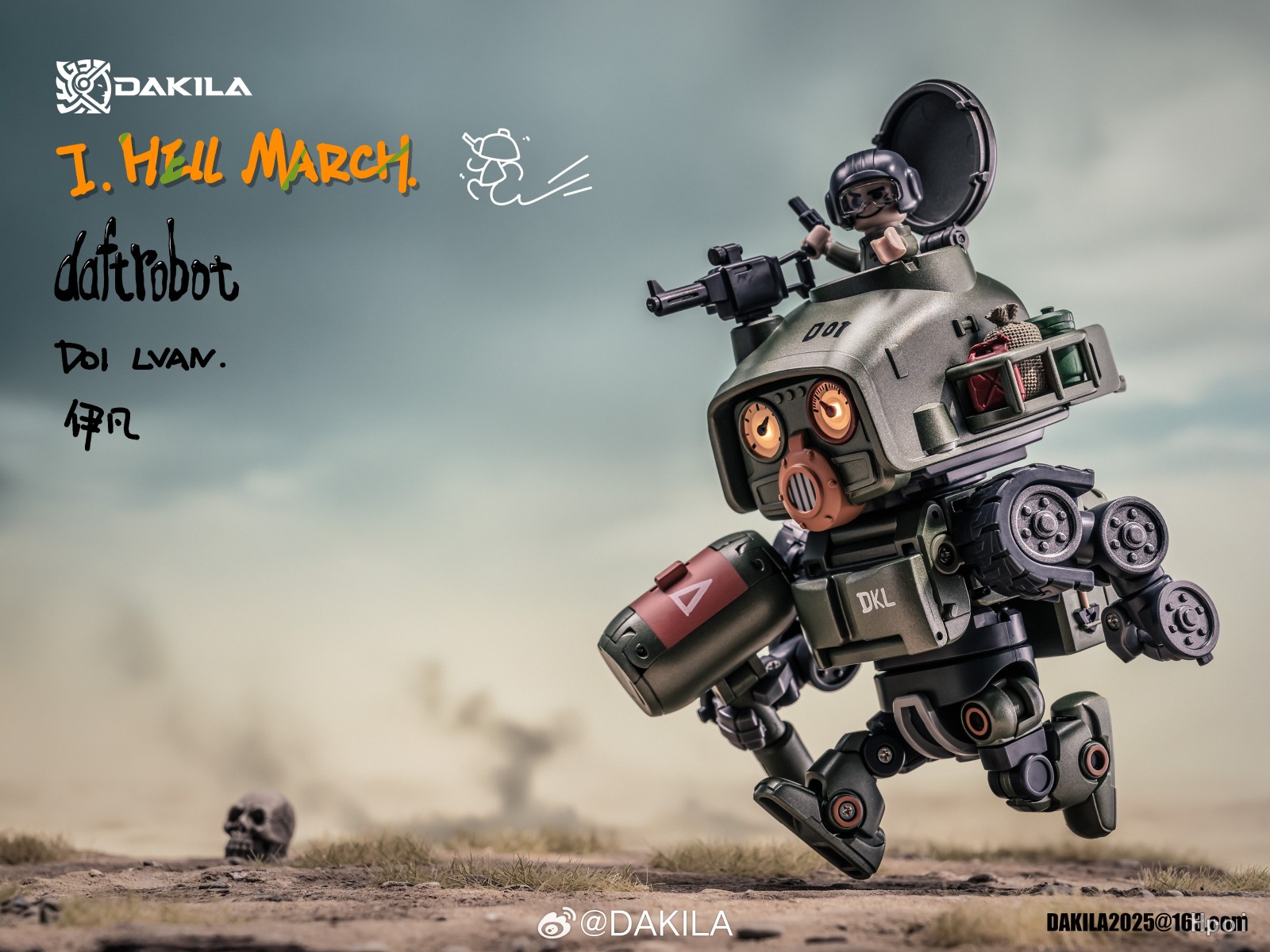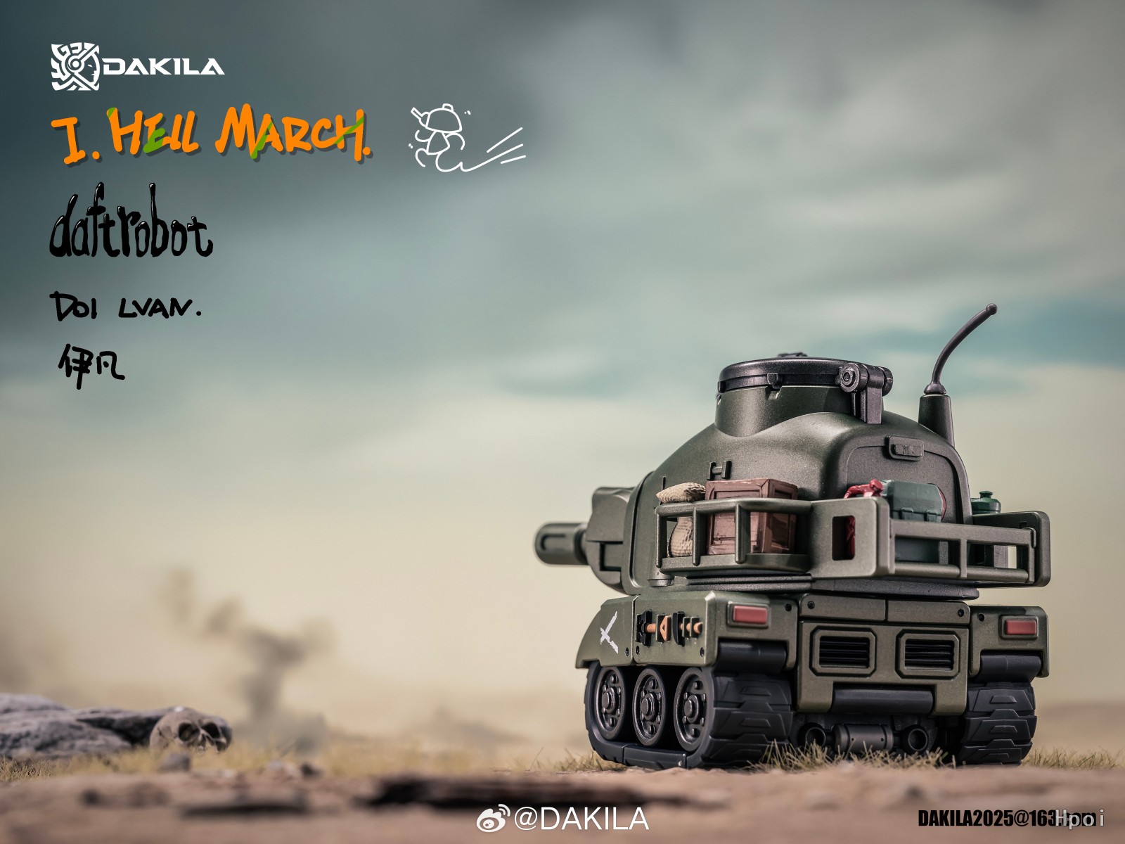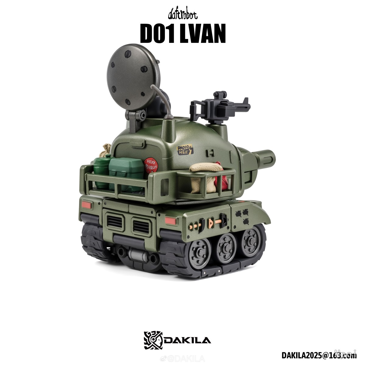DAKILA DAFTBOTS系列第一篇章:HELL MARCH,第一款作品 D01 LVAN 伊凡 ,可变形机器人,全身烤漆涂装,眼部指针可以独立活动,用锤子触碰眼睛可激活眼部灯光,坦克形态可流畅在桌面滚动,包含一个独立可动人仔可在伊凡机器人状态下和坦克状态下安装在驾驶室。