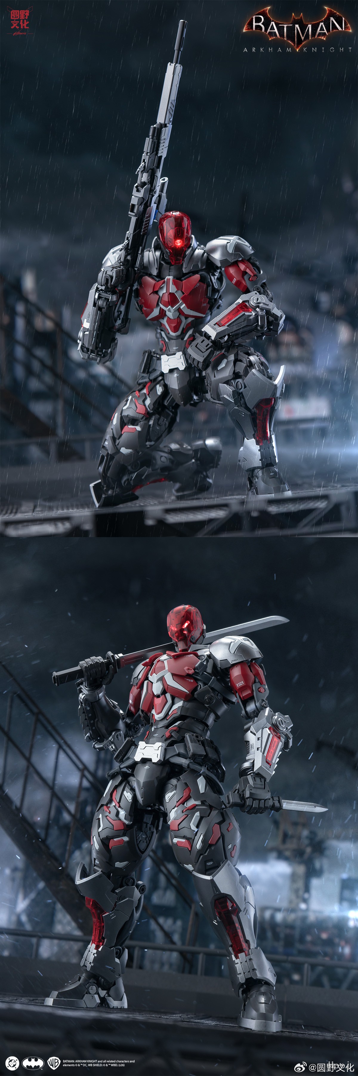 3、<完全合体式武器>武器中附带有阿卡姆骑士标志性的两把改装手枪,两把手枪除了有各自独立的变形方式,还可以合体为完全体的狙击枪模式,这种合体方式是首次出现在同角色产品中。