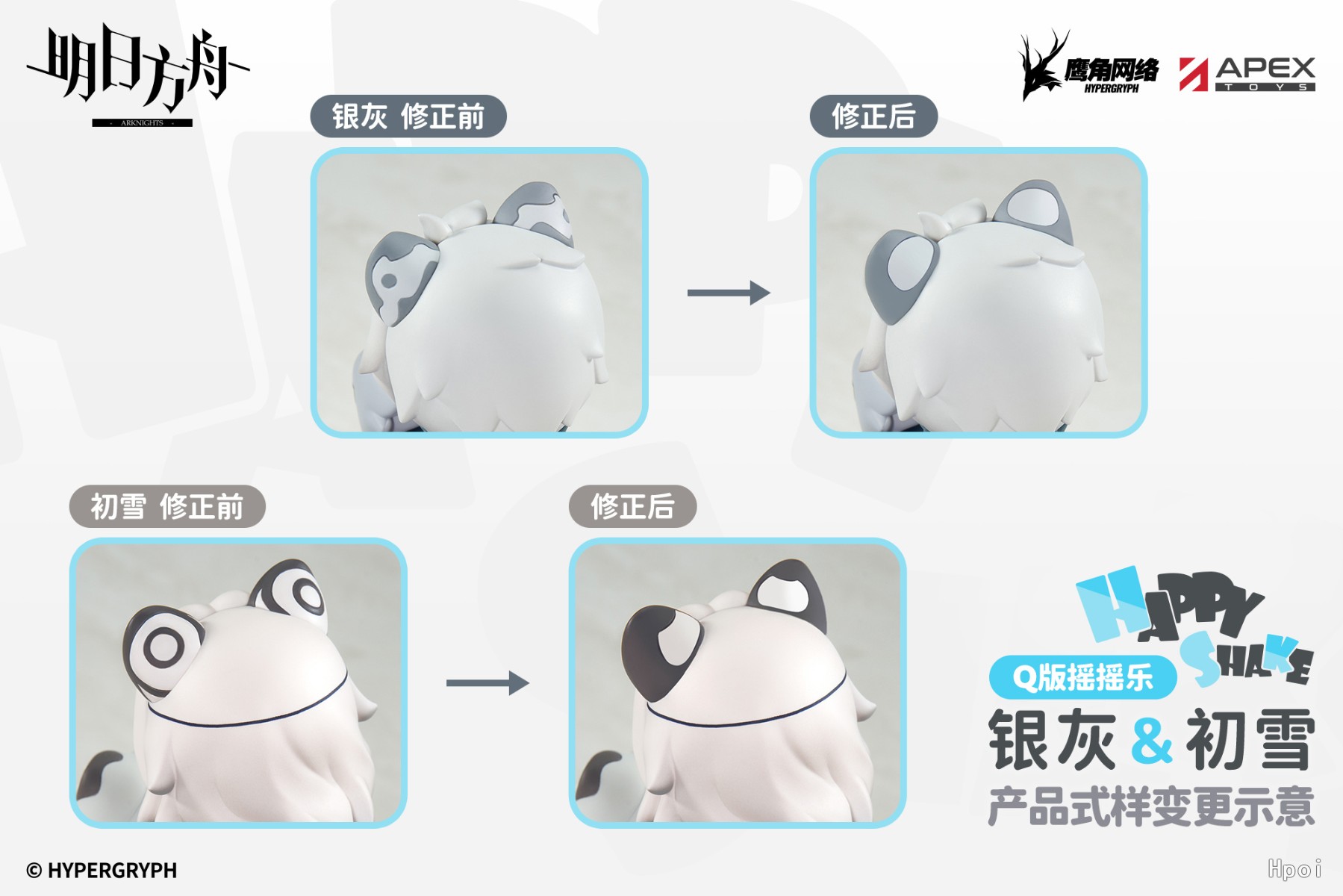 我们于近日推出了【明日方舟 HappyShake系列Q版摇摇乐 银灰】、【明日方舟 HappyShake系列Q版摇摇乐 初雪】,非常感谢大家对产品的喜爱以及支持,同时我们注意到了一些玩家提出的建议,经审慎考量,我们决定对于角色【耳朵】零件的设计进行调整,为大家呈现更好的效果,特此发布本次式样变更说明: