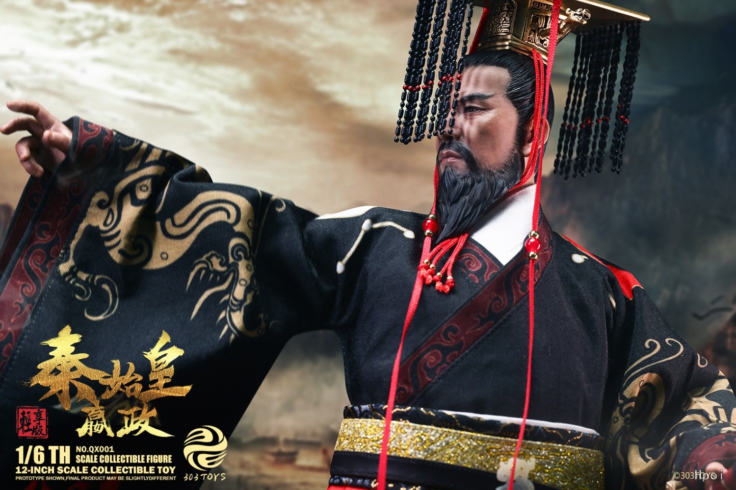 配置清单:– 秦始皇头雕– 超可动素体– 4只替换手型服装:– 十二旒天子冕冠– 白色中单(内衬衣)– 六章玄衣(黑色上装)– 六章纁裳(黄色下装)– 黄色大带(玉扣腰带)– 红色蔽膝– 黑色佩绶– 朝履配件:– 玉佩- 传国玉玺- 天子剑(含黑色剑鞘)- 黑色人偶支架