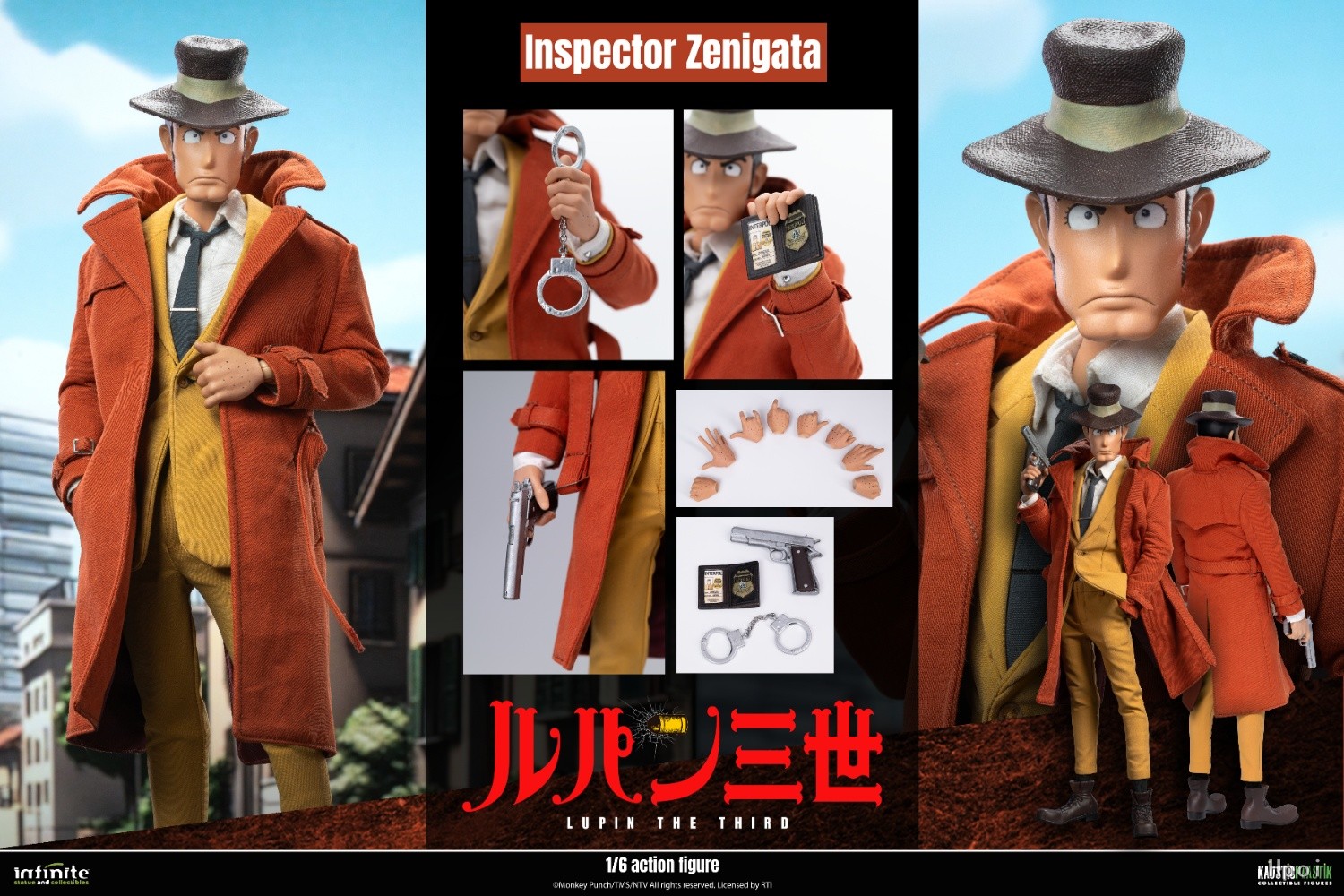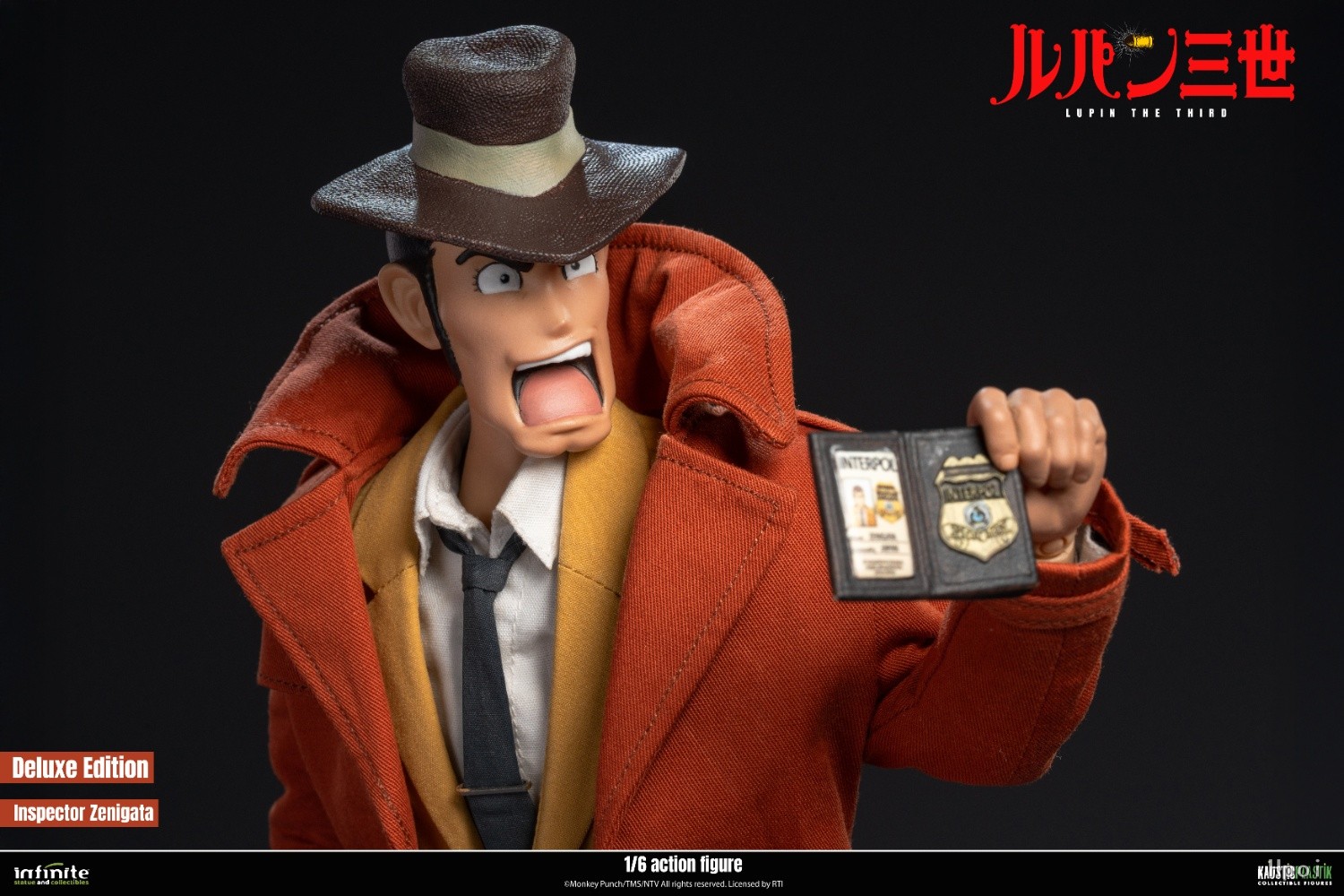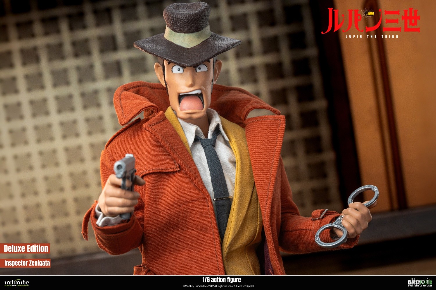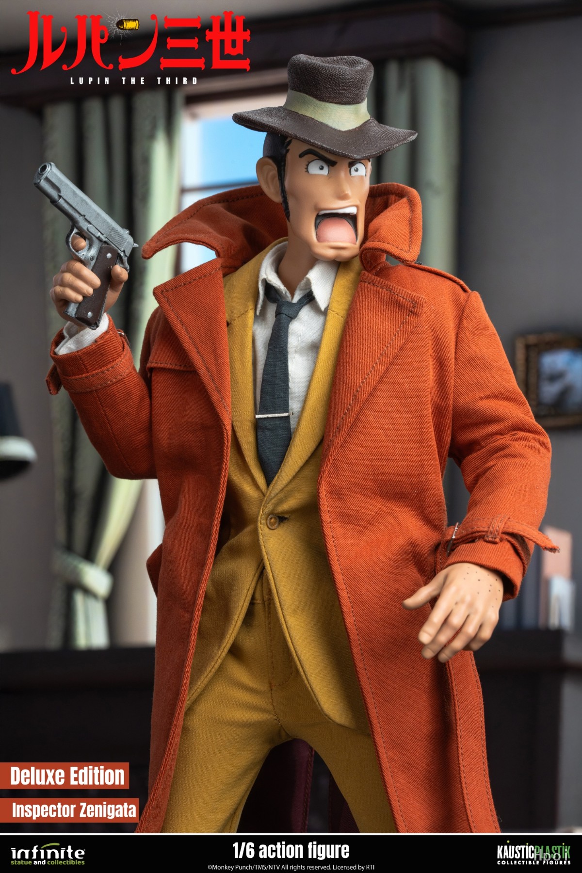 豪华版配件清单:.一个<<鲁邦三世>>第三季造型的平静头.一个<<鲁邦三世>>第三季造型的呐喊头.一个可动素体.8只可替换手型.一把柯尔特手鎗.一副手铐.一枚国际刑警徽章.一件棕色/砖红色风衣.一件夹克搭配浅棕色/芥末黄长裤.一件白色衬衫.一条深色领带.一双棕色皮鞋.一个胯部支架地台