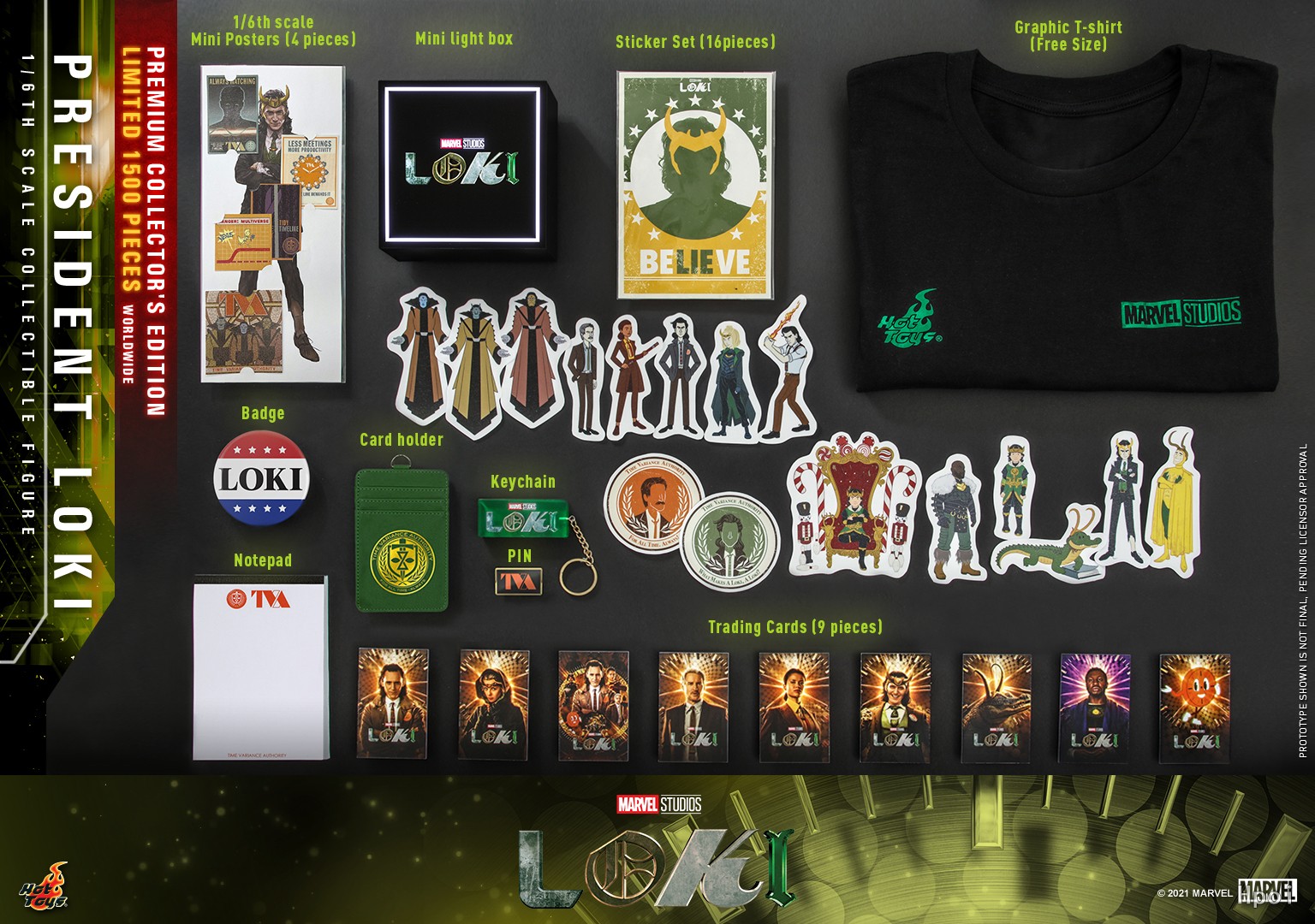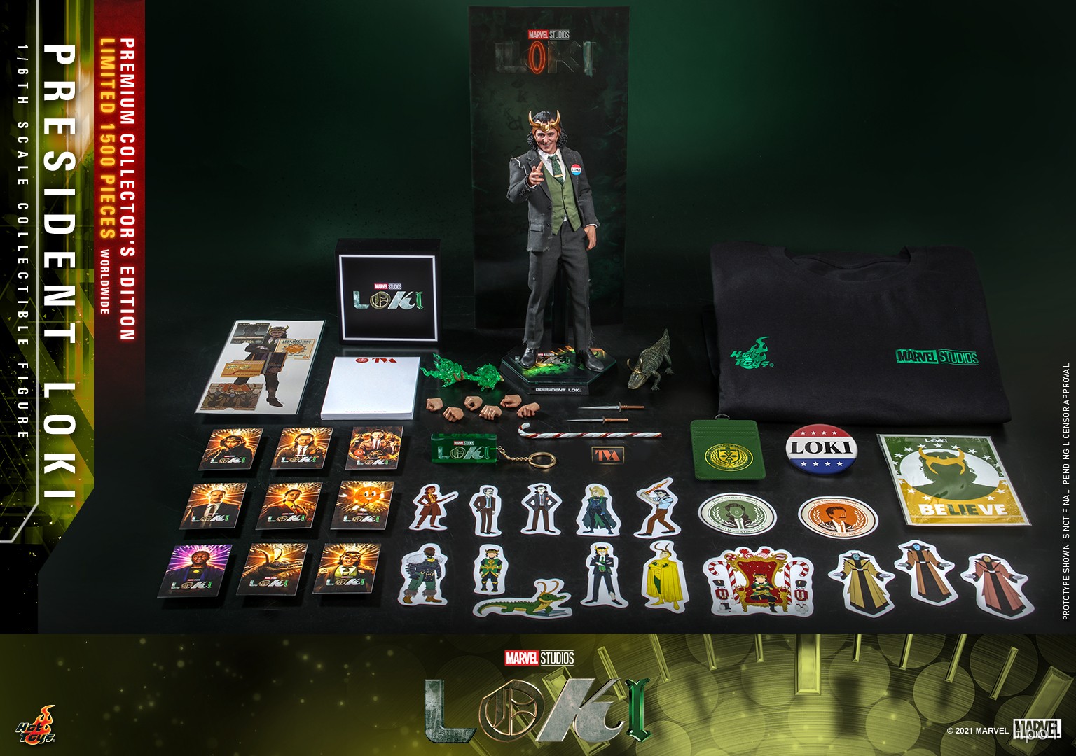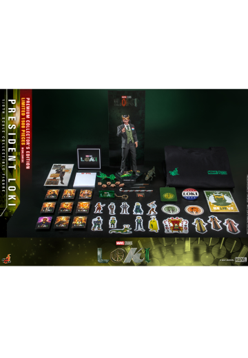 全新极像真头雕由Hot Toys韩国头雕师团队参照型男汤姆·希德勒斯顿的五官轮廓所设计而成,细致地于面上涂装尘埃感和刻划上凌乱的中长发发型,同时头雕搭配上一个铜金色招牌头盔。Hot Toys更按照角色的身型比例,身高约31cm、逾30个活动关节的专用素体;同时Hot Toys制作团队按照原版戏服以造真人服装的技术打造全套饰有破损效果的西装,配有一件配有总统竞选徽章的深灰绿色西装外套、一件绿色的西装马甲、一件白色恤衫、一条绿色格纹图案连金色配扣领呔、一条深灰绿色西裤、一条饰有皮革纹理的腰带,以及一对黑色鞋,剪裁结构及缝纫手法精确,高度还原西装上的各项细节,完美呈现贴服称身的效果!随人偶更会配备一只短吻鳄洛基(嘴巴可张口) 、一对匕首、一支手杖、多对不同造型手掌 (其中一对配有绿色仿火焰特效) 以及一个人偶地台连透镜效果背景咭。 以上为普通版本的配置,礼盒珍藏版将印有独立编号,此版本配置了洛基精品,包括有一件洛基型格Tee、一个洛基Logo迷你LED 灯箱、一个总统洛基徽章、一个TVA徽章、一个洛基Logo匙扣、一包便条贴、一个咭片套、多张 1:6比例迷你海报、多张洛基角色贴纸和多张洛基角色收藏卡。