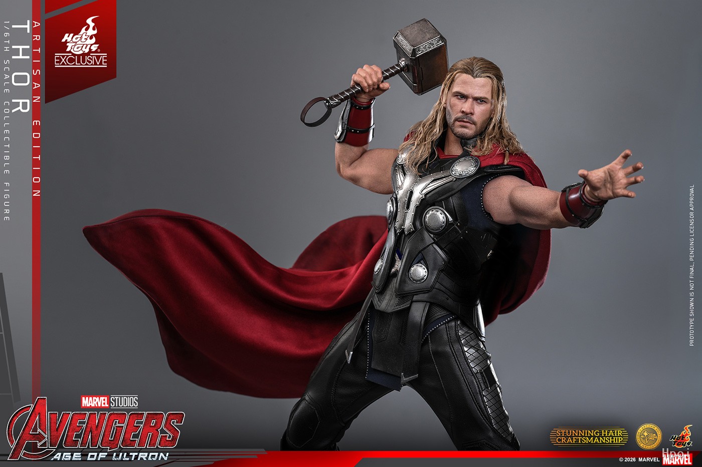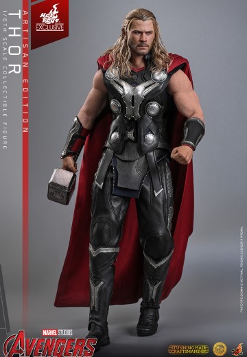 在服饰的设计上,阿斯加德盔甲忠实还原影片中所呈现的层次感,以深蓝色贴身衣、带有银色圆盘装饰胸甲、前臂甲,红色披风、黑色长裤及长靴组成,尽显阿斯加德战士威严形象。在武器配置上,配备两柄雷神之锤:一柄经电镀精致涂装,另一柄则内置LED灯效可散发出标志性的「雷神之力」蓝光。两者皆可搭配专属的半透明蓝色电击特效配件,特别设计的地台印有彩虹桥焦痕图案及角色名牌,整体生动重现电影中雷霆万钧、充满神话色彩的战斗场面。
