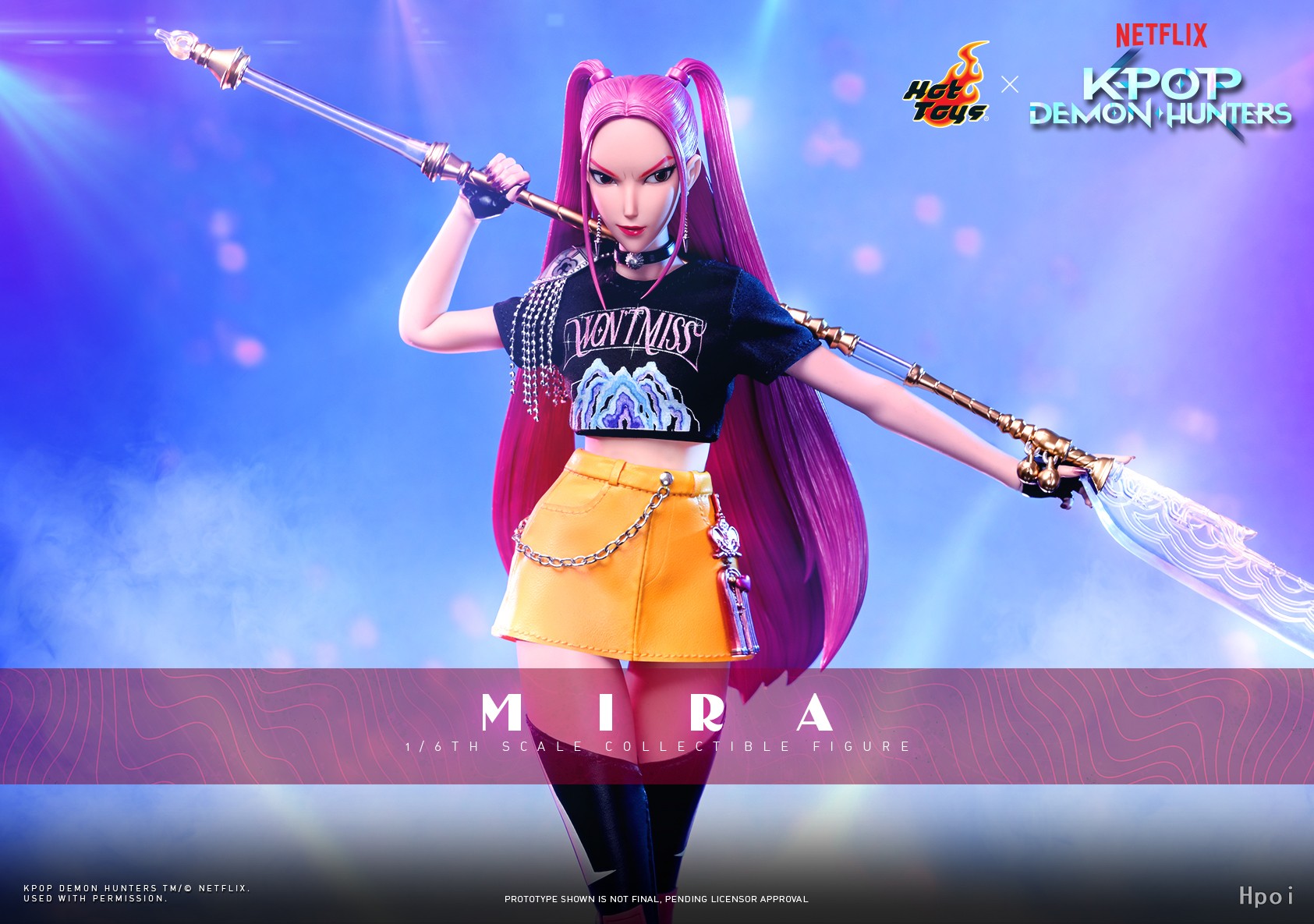 HUNTR/X主舞米拉无论在舞台以完美编舞俘获观众,或以致命身手对抗恶魔,都展现无与伦比的从容与力量。米拉1:6比例珍藏人偶高约28.5cm,以精细雕塑粉红色半扎双马尾发型还原影片形象。服装包括黑色印花短版上衣配银色肩饰、颈圈、黄色高腰裙饰以金属链条与粉红色绳结、黑色过膝长靴。专属武器为曲月刀 ,透明弯刀刃配金色铃铛装饰与分节式刀柄。