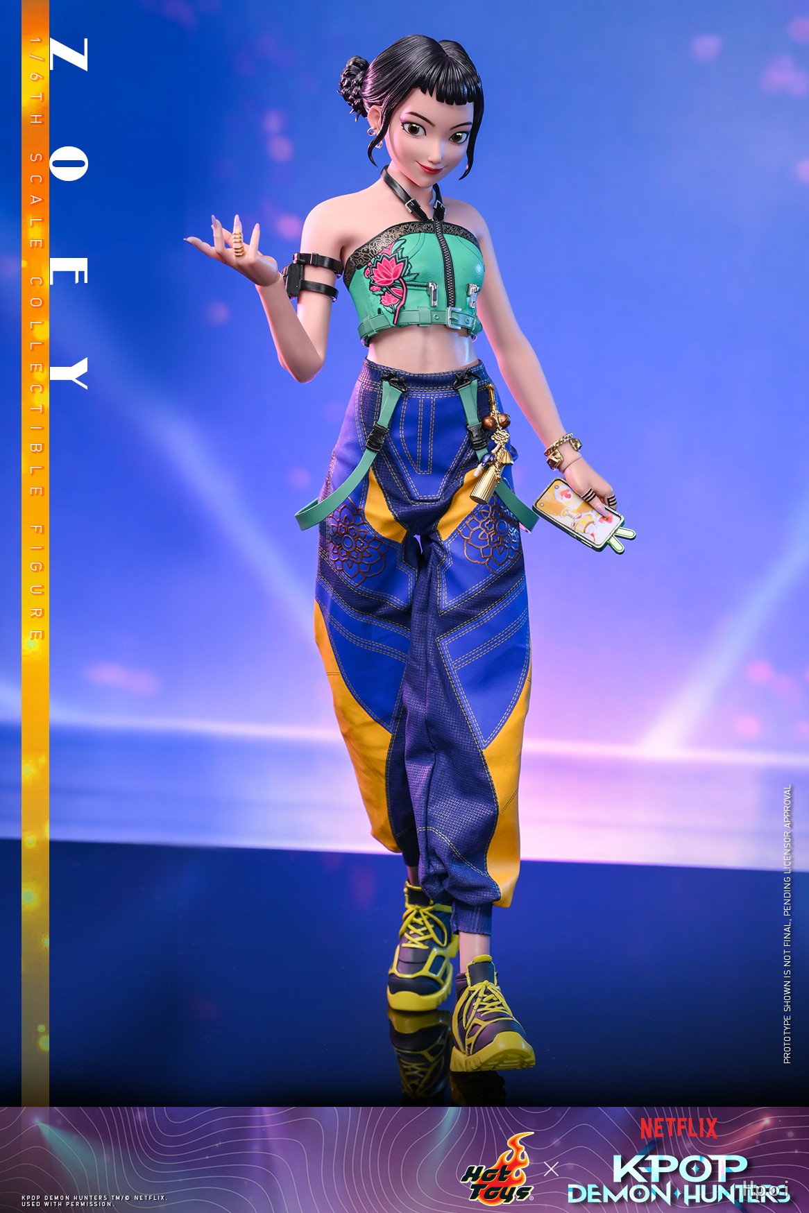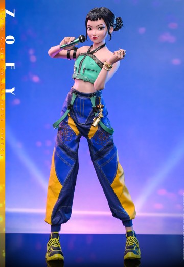 HUNTR/X Rapper担当佐依以活泼创意点亮舞台,深受粉丝喜爱。佐依1:6比例 珍藏人偶高约27.5cm,复刻黑色双辫丸子头配刘海造型。她的舞台服充满街头潮流感:青绿色挂颈短版上衣、金色手镯与手臂袋、高腰伞兵裤配金色绳结挂饰、黑黄配色厚底运动鞋。专属武器双组神刀,透明短刀刃配金色流苏,体现灵动速度的战斗风格。特有配件包括佐依的日记本,展现忙内创意个性。