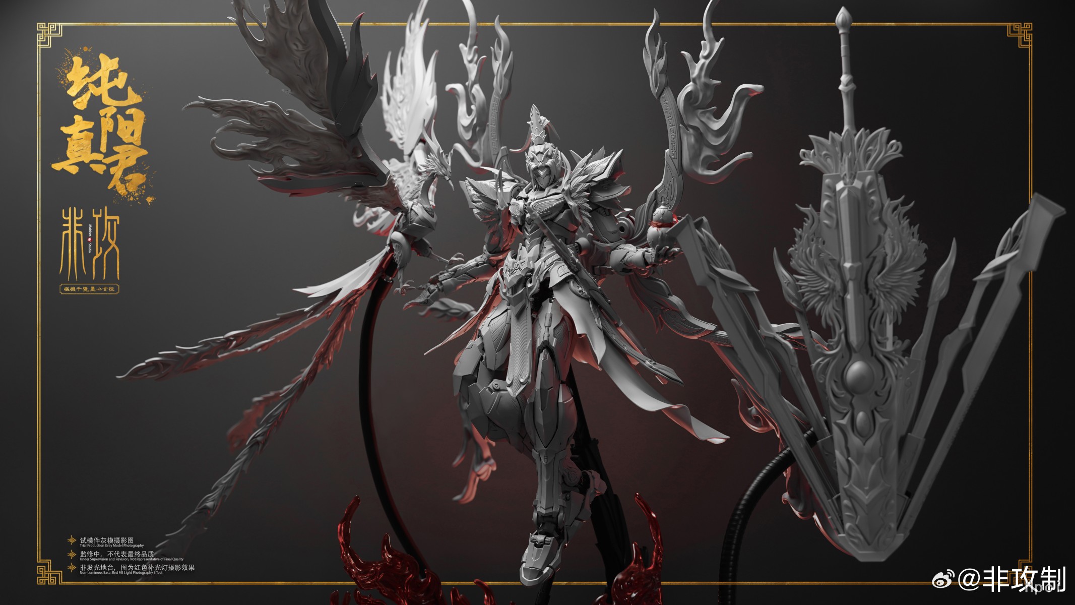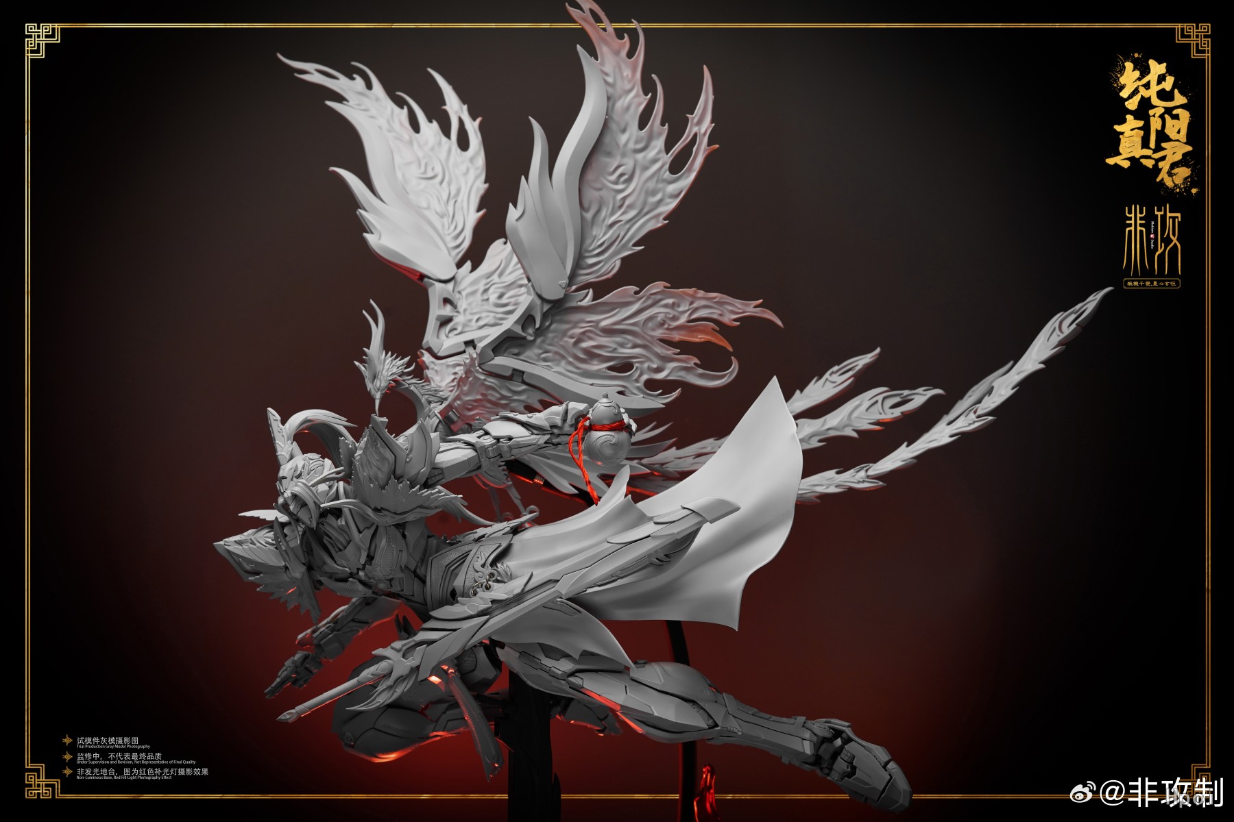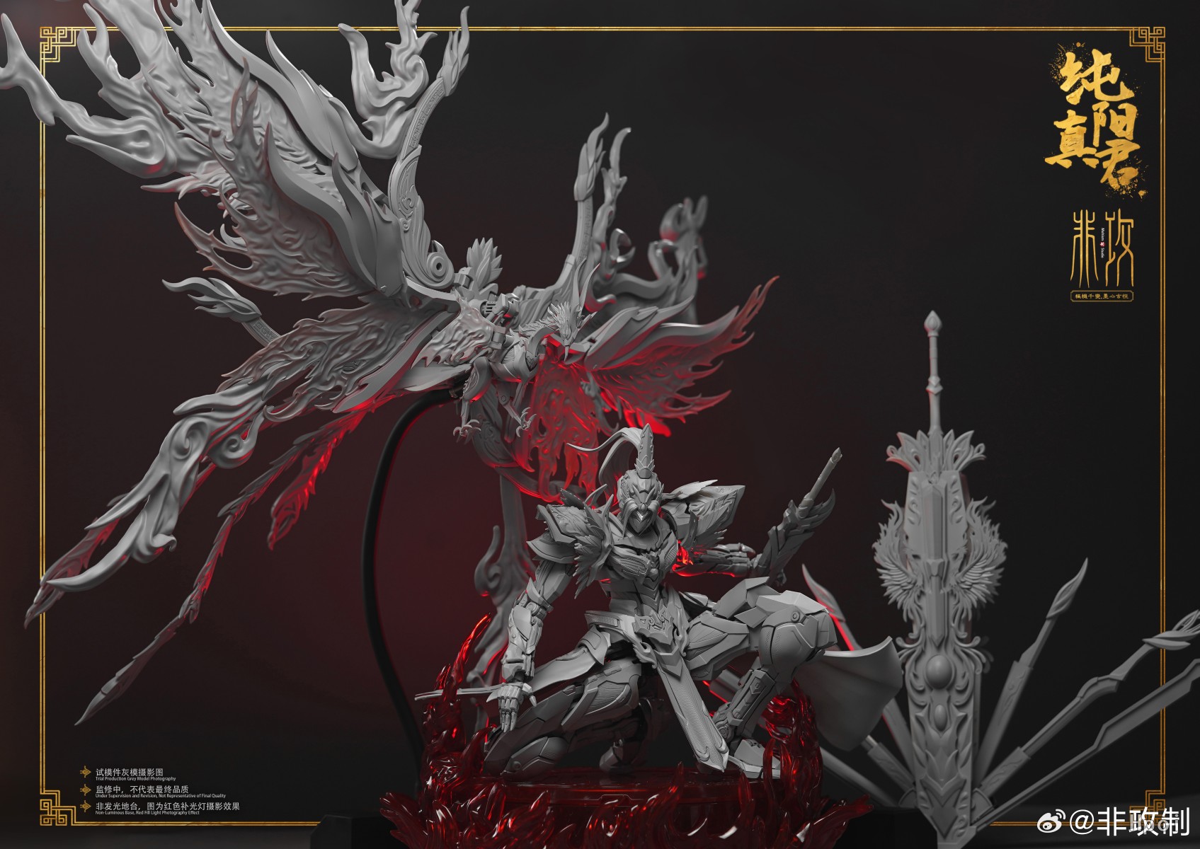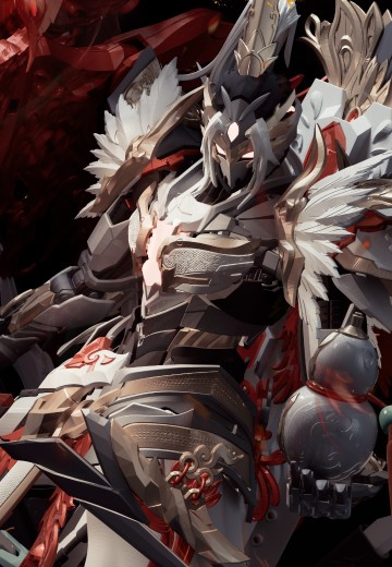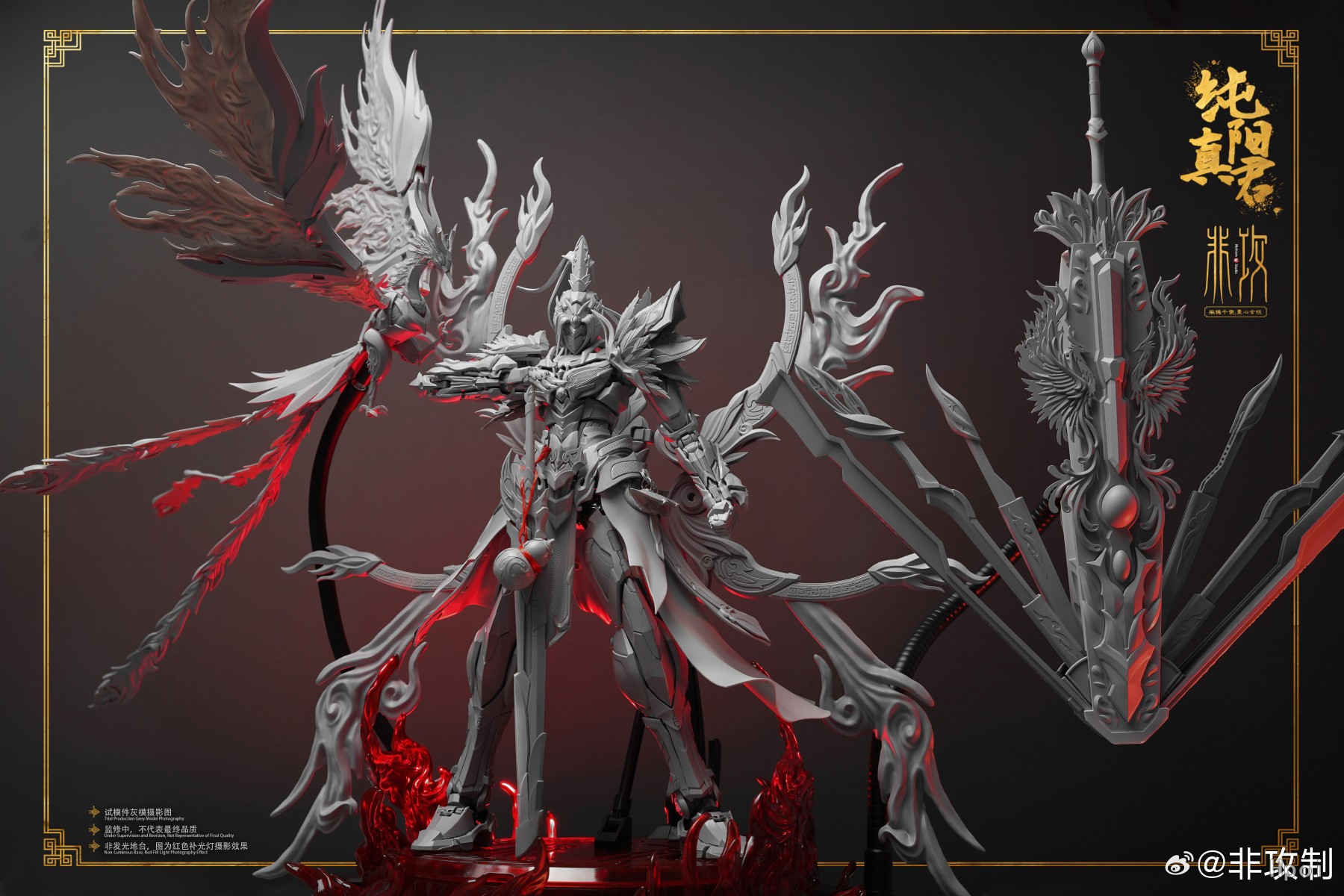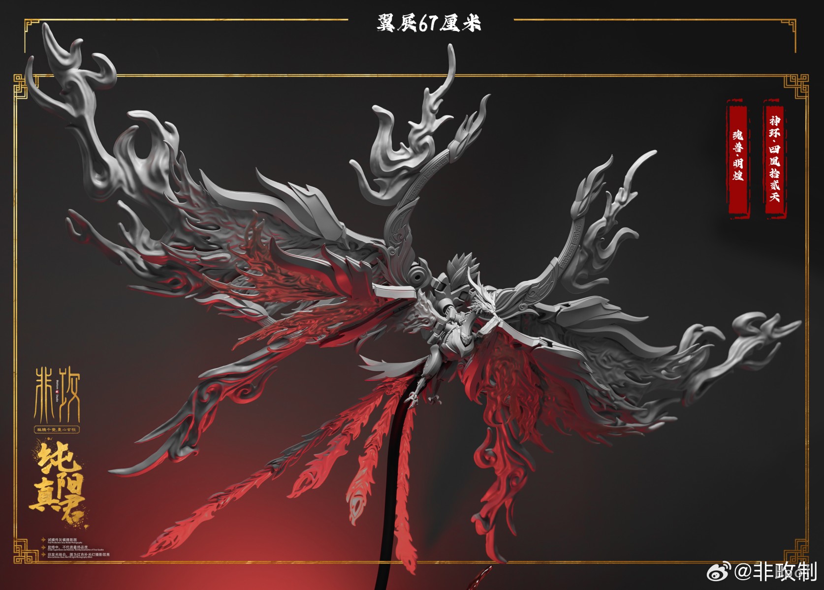 此款人物塑造为剑客,凤凰[明煌]为其魂兽,为体现出其灵体的形态,大量采用了特效件来还原设定效果。