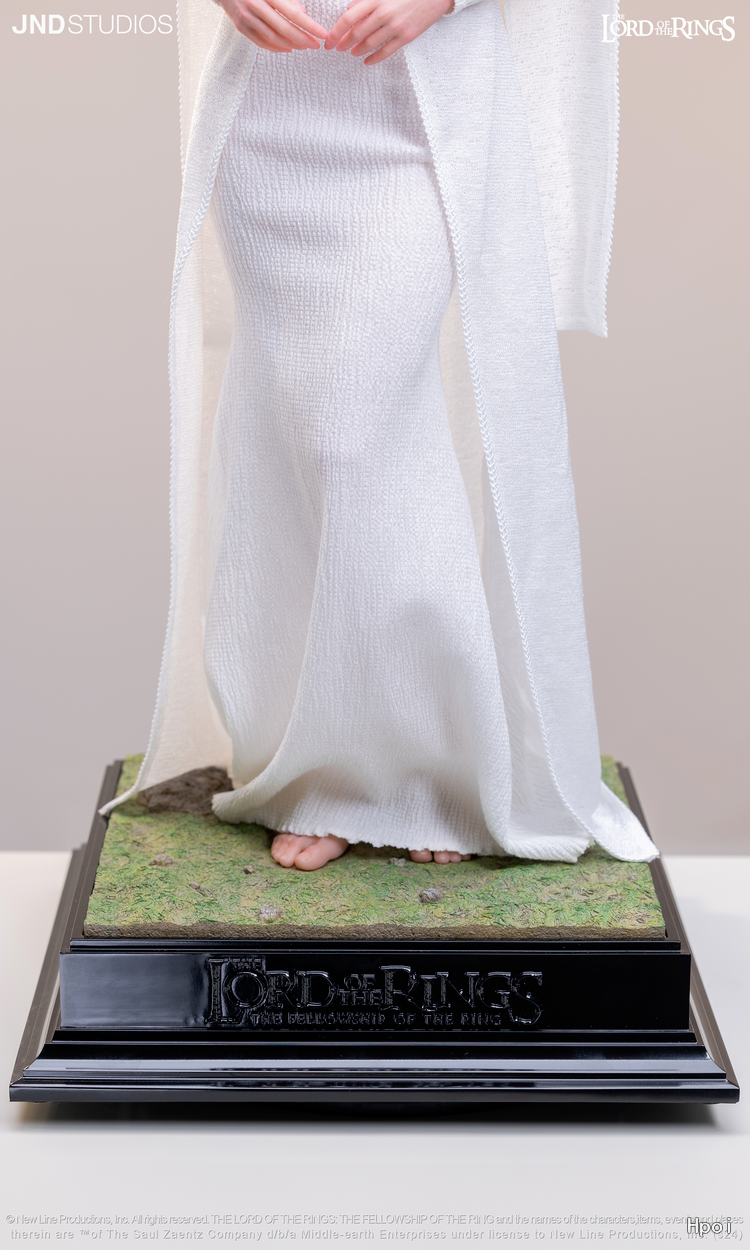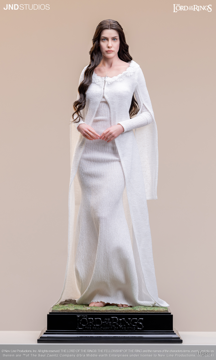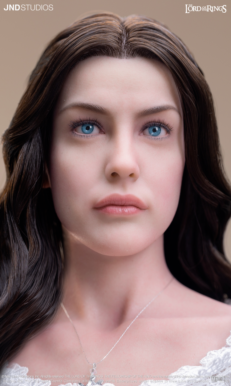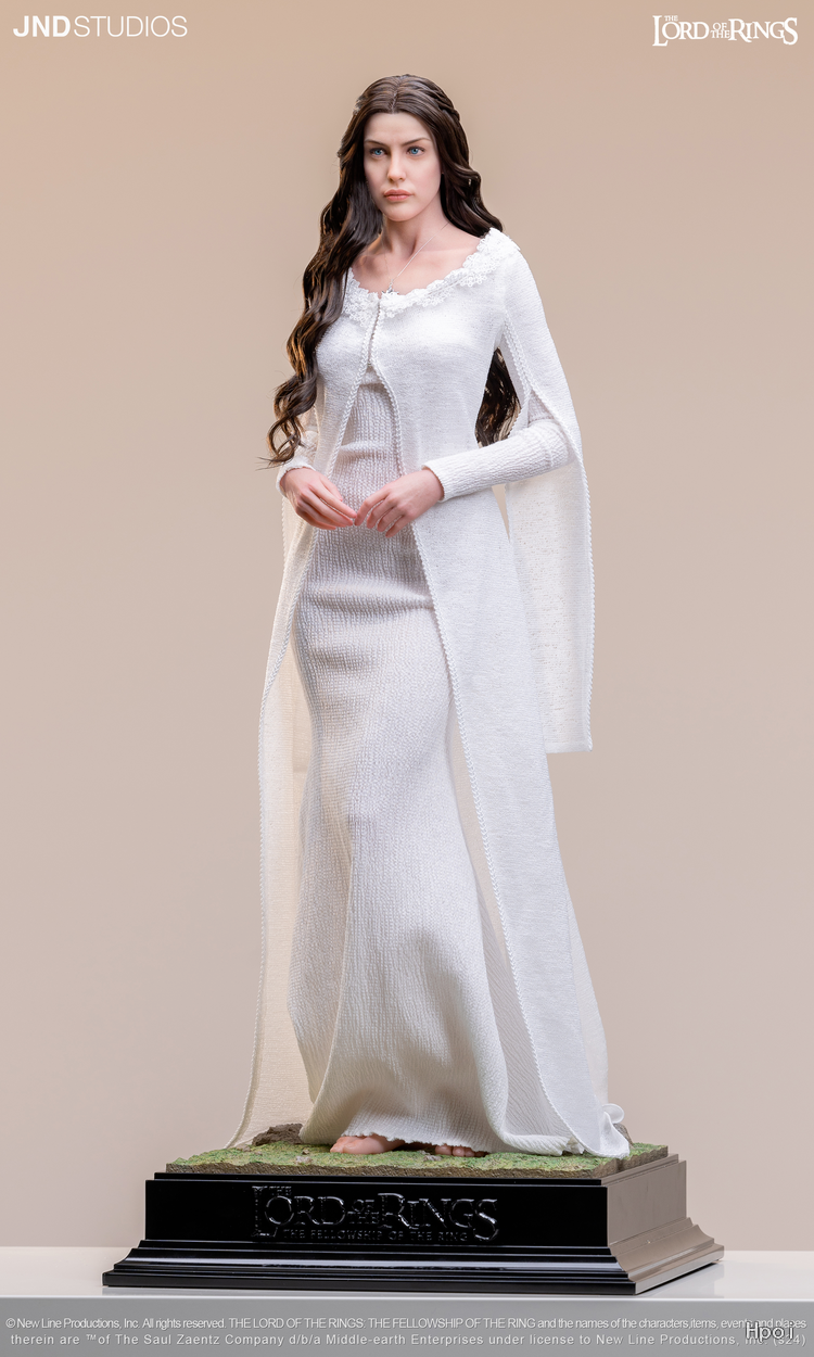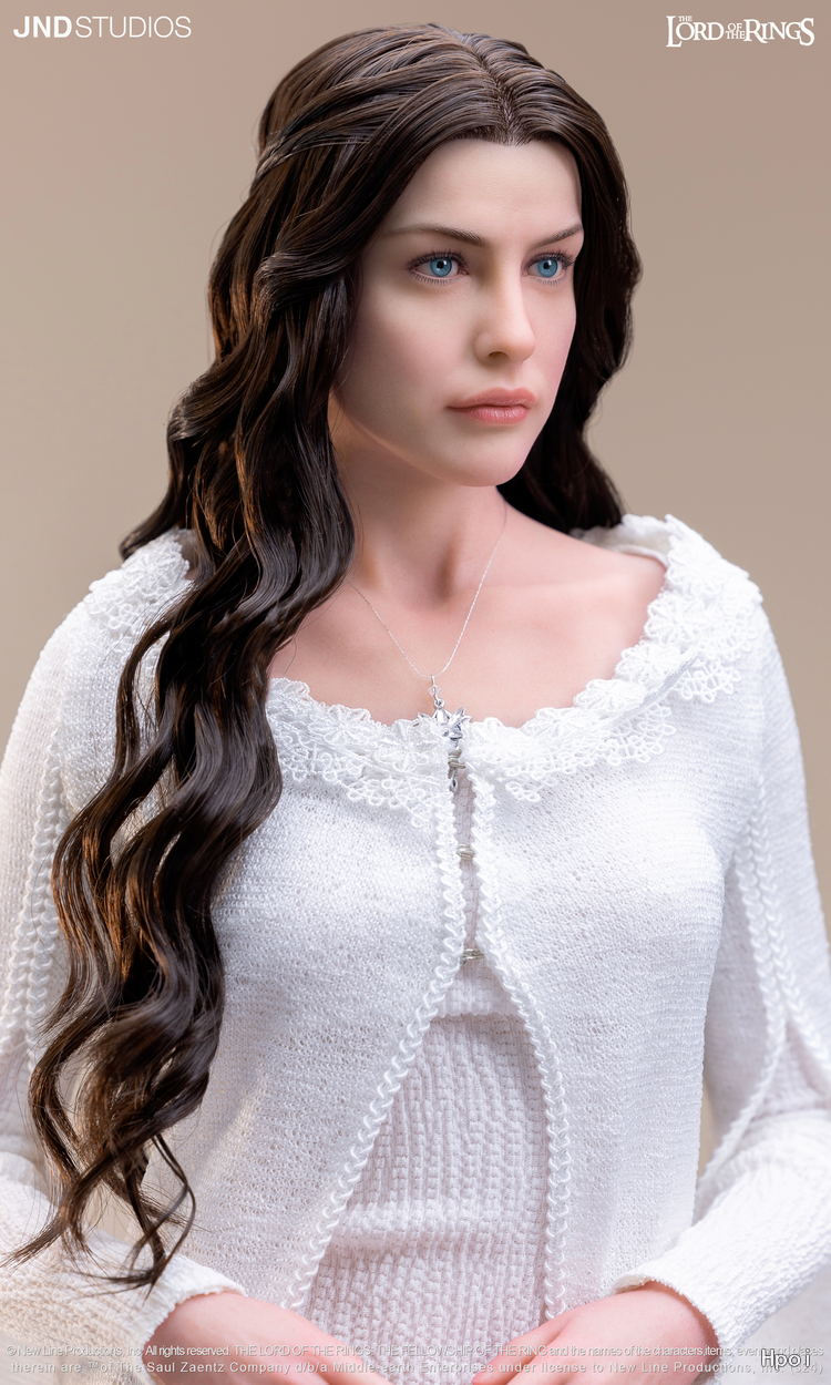 为了以超现实雕像重现这位角色,我们专注于刻画其柔美的面部特征,以及华服之下曼妙的身体线条。至于服装,我们想要复现阿尔温与阿拉贡月光下亲吻的那个经典场景——月光穿透阿尔温的裙摆,让她周身笼罩在圣洁的光芒之中。我们精心挑选了裙装的材质,并倾注心血于“暮星”项链的细节还原——那是阿尔温托付给爱人阿拉贡的定情信物。也许,对于 JND《指环王》产品线的下一款作品,我们心中已有不错的构想。