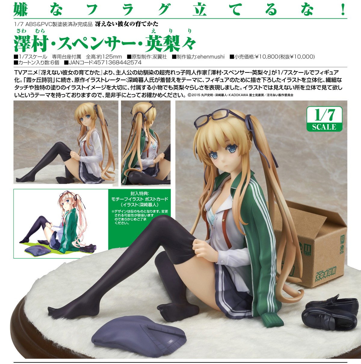 出自TV动画『路人女主的养成方法』,主角的青梅竹马兼超人气同人作家「泽村·史宾瑟·英梨梨」的1/7比例模型决定再次贩售!继「霞之丘诗羽」后,由担任原作插画的深崎暮人以换衣服为主题,为模型特别绘制的插图立体化。重视插图原本的细致作画与独特上色,连配件设计也十分符合英梨梨的风格。立体化后可欣赏到插图中看不见的地方,请务必拿到手边欣赏!