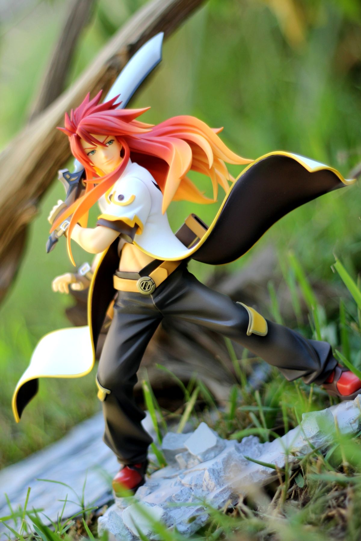 剣を振りかぶり、服の裾や髪をなびかせる姿を躍動感たっぷりに立体化しました。反らした上半身や手の動きなど、全身から力強さを感じる造形が見事な仕上がり。