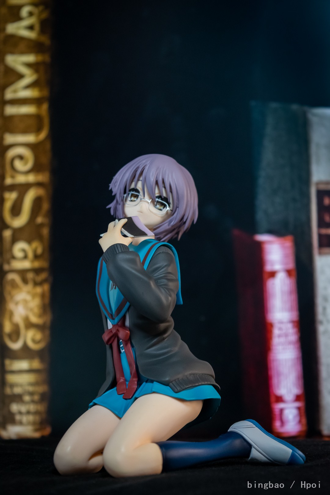 感情表現が薄く無口で無表情な彼女ですが、投げかけた眼差しがわずかな感情のゆらぎを感じさせる造型となりました。少し腰を浮かせた座りのポージングで、メガネをはずしたたずむ姿は、可憐さとミステリアスな雰囲気を合わせもちます。