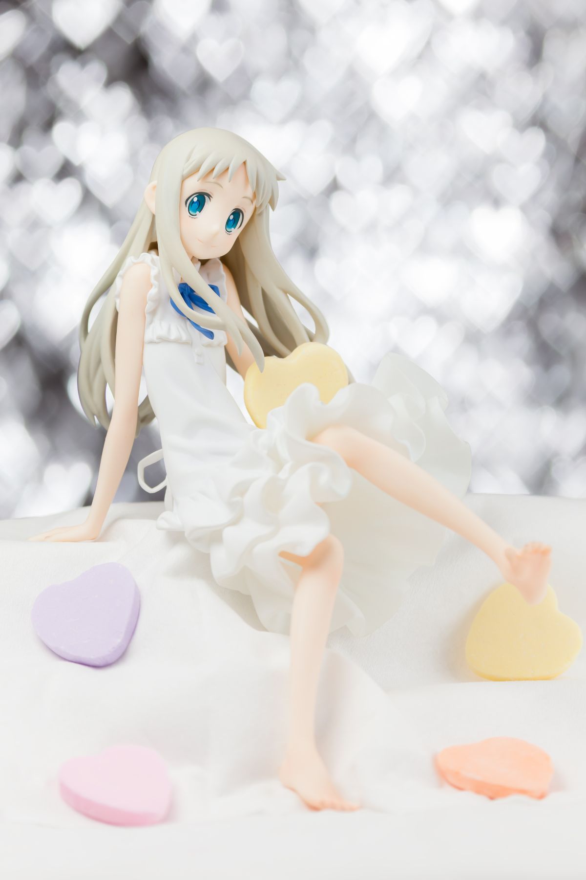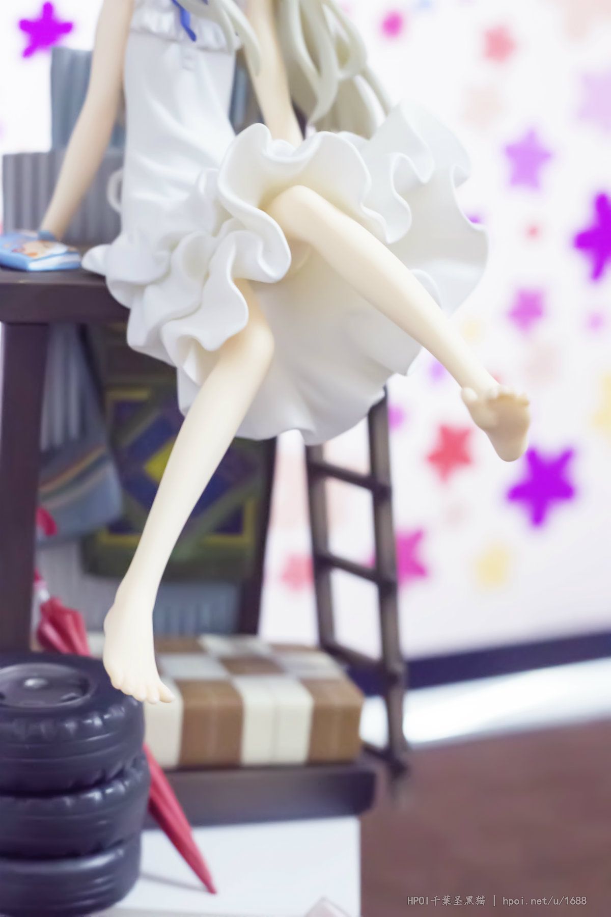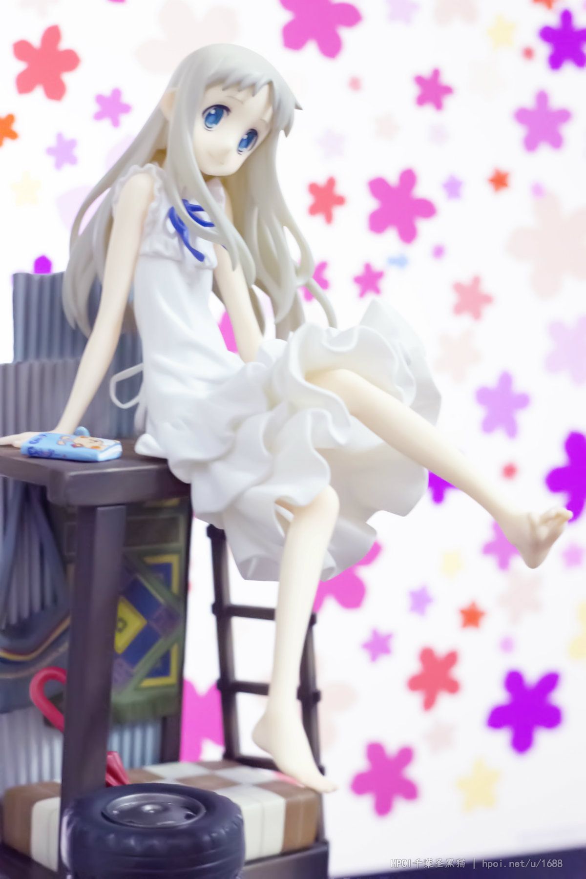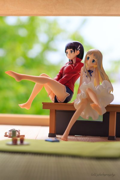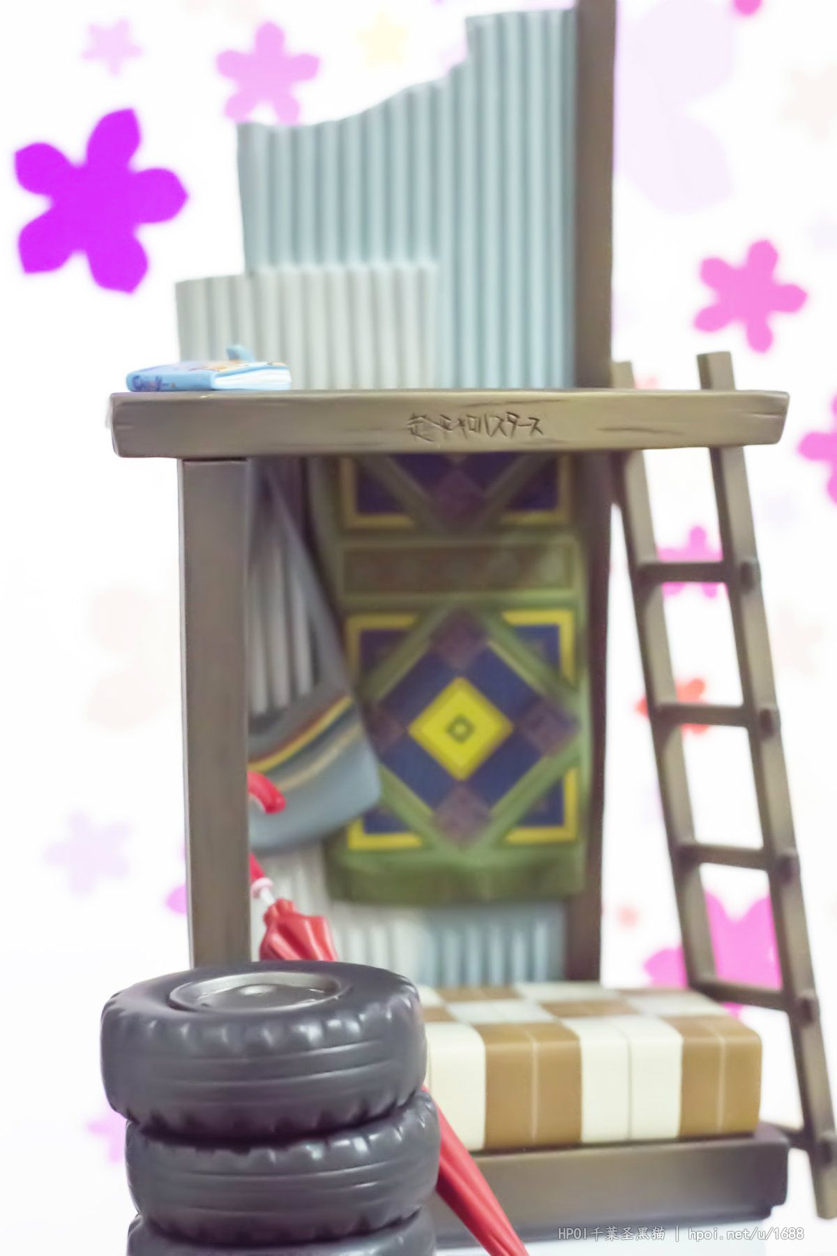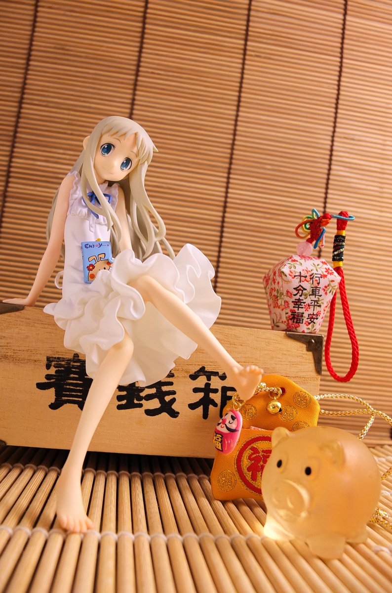 台座には「超平和バスターズの秘密基地」をイメージし、劇中を飾った小物達を散りばめました。淡い彩色と合わせて作品の雰囲気を高めます。