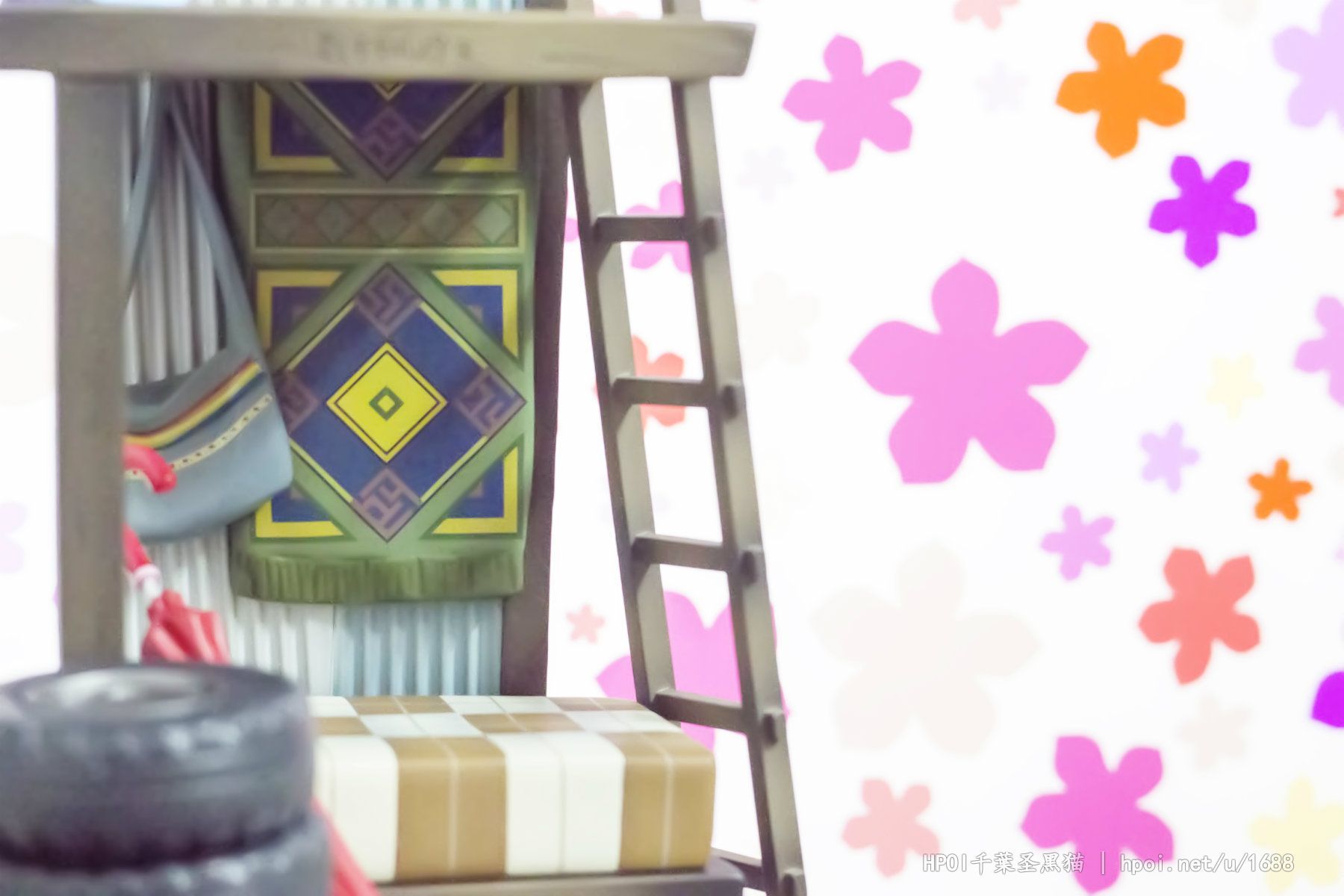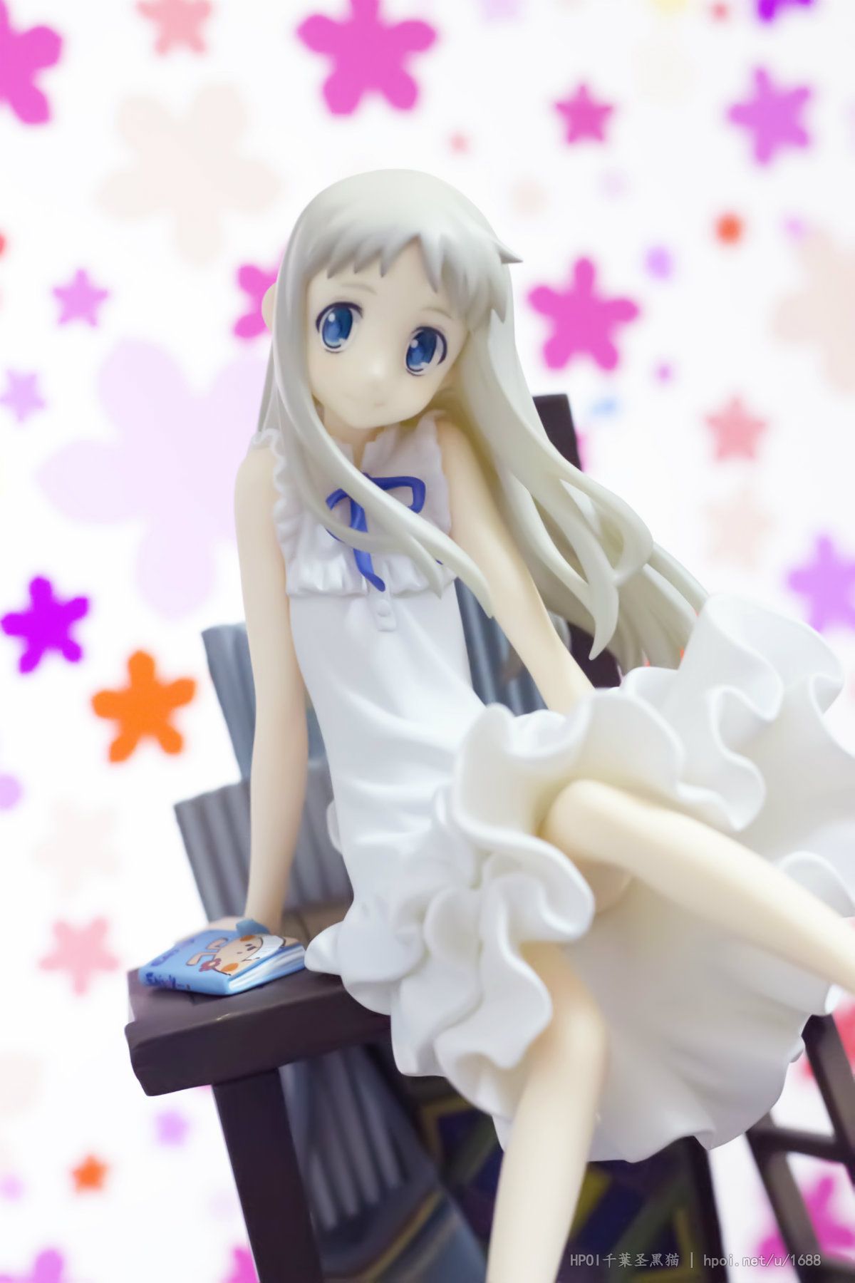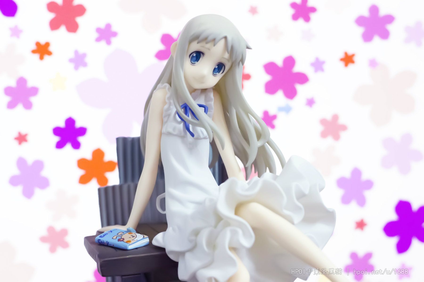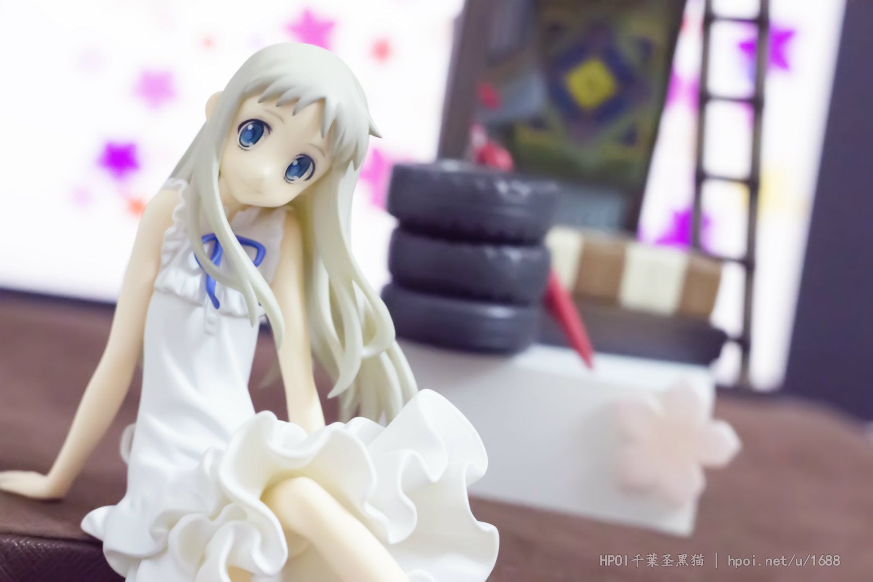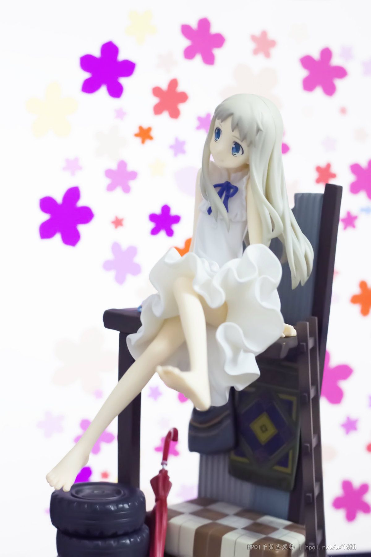 台座には「超平和バスターズの秘密基地」をイメージし、劇中を飾った小物達を散りばめました。淡い彩色と合わせて作品の雰囲気を高めます。