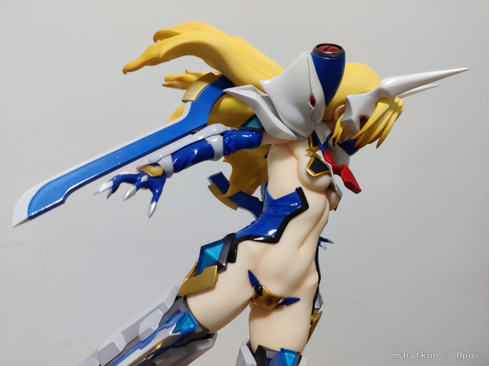 凄みを感じさせる強い眼差しや、台座から放射線状に突き出した武器「ペタル」の構成が戦闘前の緊迫した雰囲気を醸し出しています。ヘッドギアや脚部のメカニカルな装備も細部まで再現。ビビットブルーで彩色された衣装が、引き締まったボディラインを引き立てます。