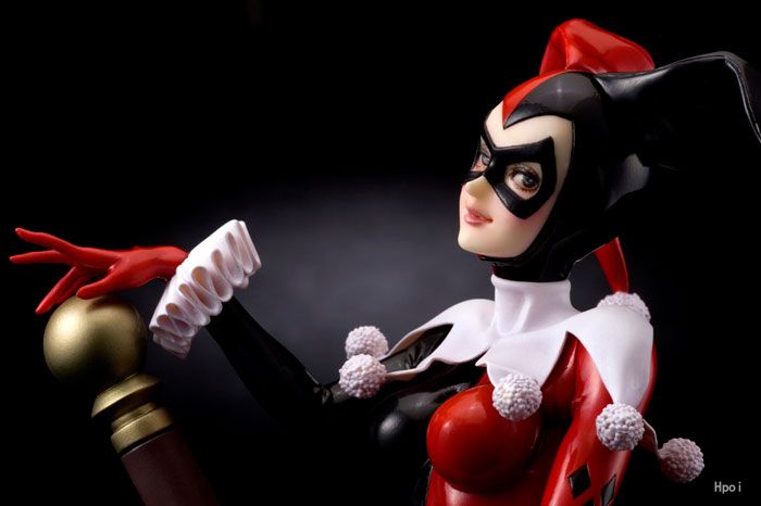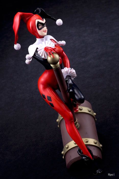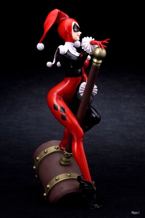 精神分析医であった彼女は、バットマンの宿敵「ジョーカー」の狂気に魅入られ、脱獄を手助けし自ら相棒に志願。恐れ多くもあのジョーカーをプリンちゃんと呼び彼の愛を手にするべく奔走する悪女へと大胆なキャリアチェンジを果たしました。累計600万本以上を売上げたアクションゲーム「バットマン・アーカムシティ」にも登場し存在感をますます発揮する彼女を、コミック登場時の赤と黒の道化師のようなお馴染みのタイツコスチューム姿で立体化。また、劇中でも度々登場する巨大なハンマーをモチーフとしたベースも存在感抜群です。