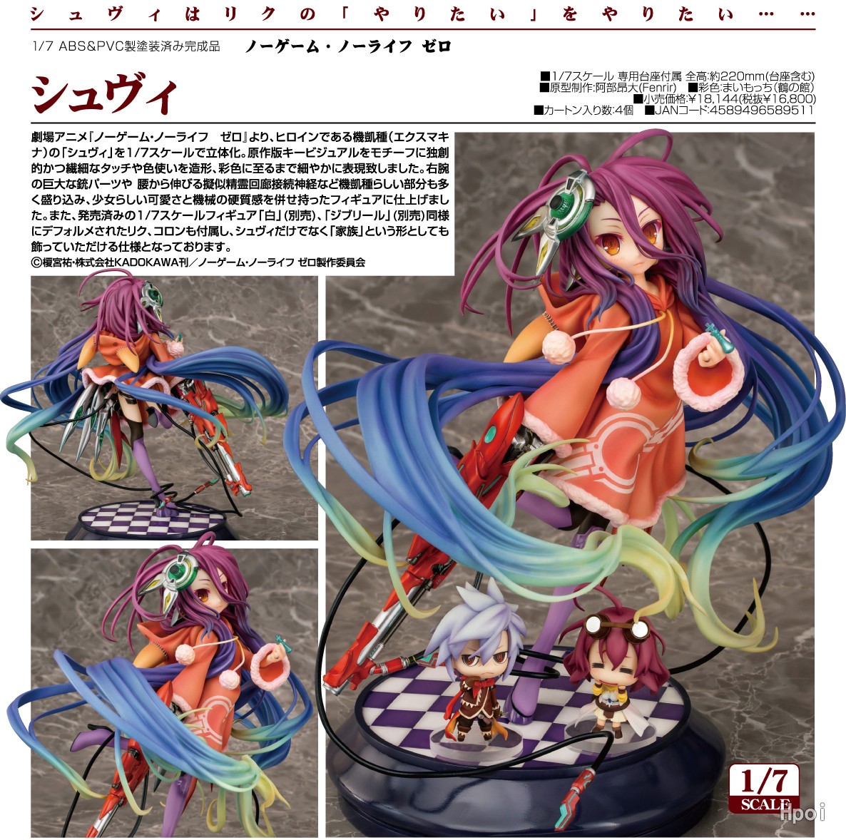 来自动画电影《NO GAME NO LIFE 游戏人生 零》,身为机凯种的女主人公「朱碧」的1/7比例手办决定再贩。以原作版主视觉图为原型,并将原作中独特而细致的笔触和用色于造型,涂装上表现出来。包含着大多数如右臂上的巨型枪械零件或从她的腰间伸延出来的拟似精灵回廊连接神经等与机凯种相符的部分,是一款同时兼具与少女相符的可爱和机械的硬质感的手办。此外,还附带了至今为止的同系列商品中都会附赠的Q版化了的里克,柯儿,不单单是朱碧一人还能以「一家人」的形式进行摆设。
