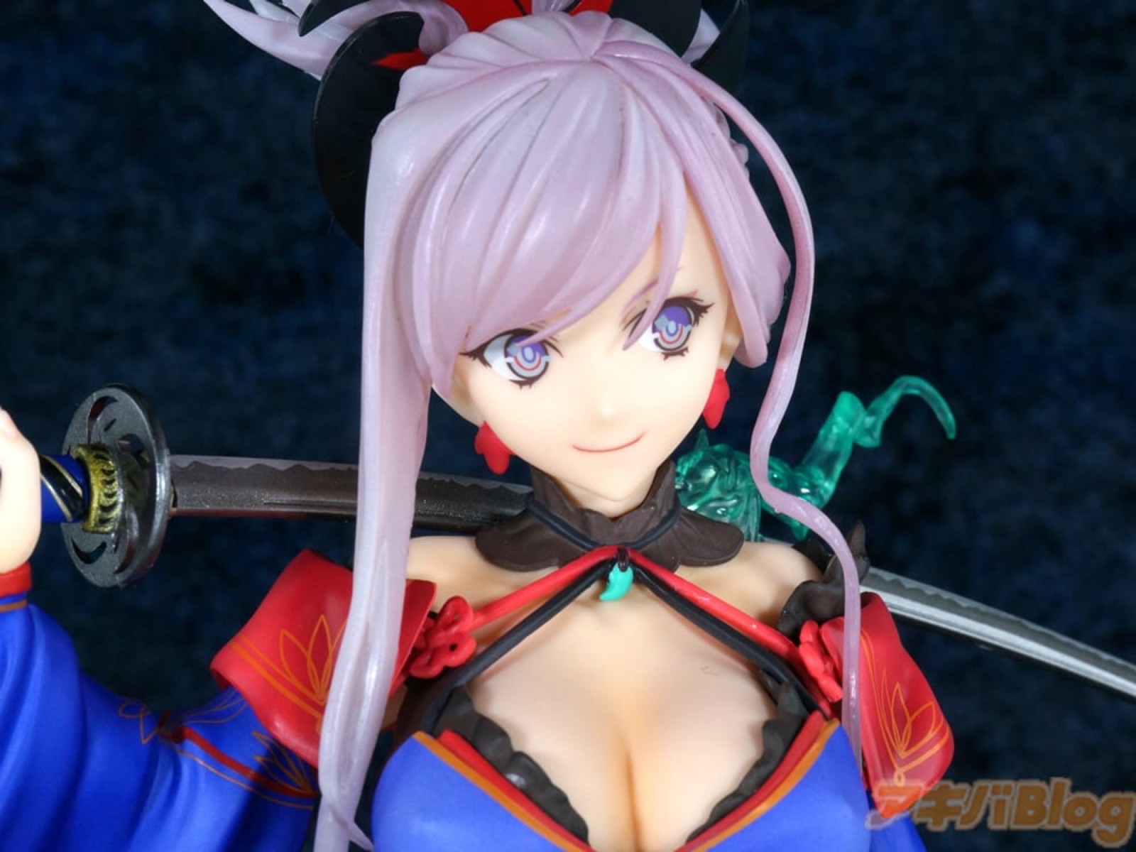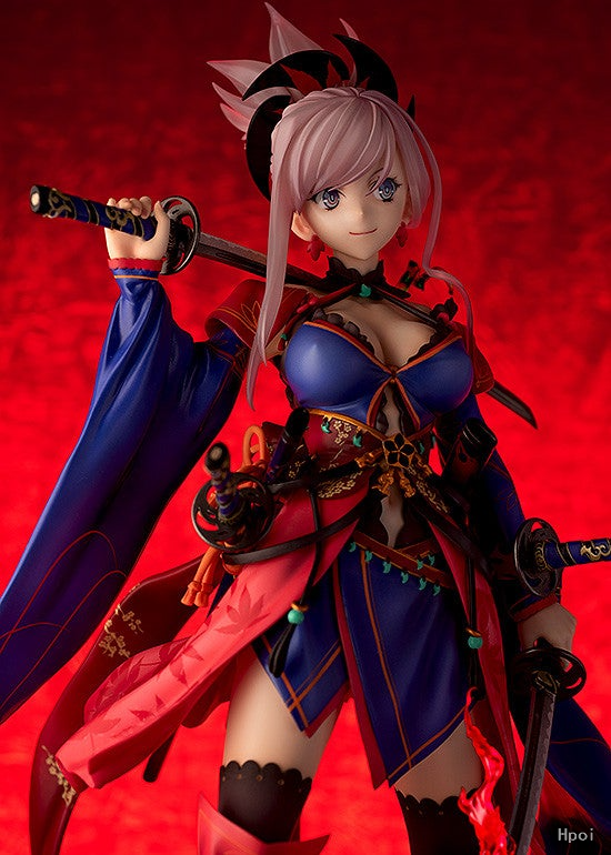 出自超人氣手機遊戲《Fate/Grand Order》,Saber/職階的從者「宮本武藏」化身為比例模型。如實呈現其兼具勇健與華美魅力的第三再臨姿態。繪製著奢華紋樣的和服腰帶以及刀鞘、從和服縫隙間露出的肌膚模樣等,製成精緻度極高的模型。另外,為了賞玩能感受到餘裕的淡然表情,頭髮零件採用透明成型材質製作。即使變成模型,其美麗姿態也能被稱作天元之花,敬請迎接這款武藏回家吧!