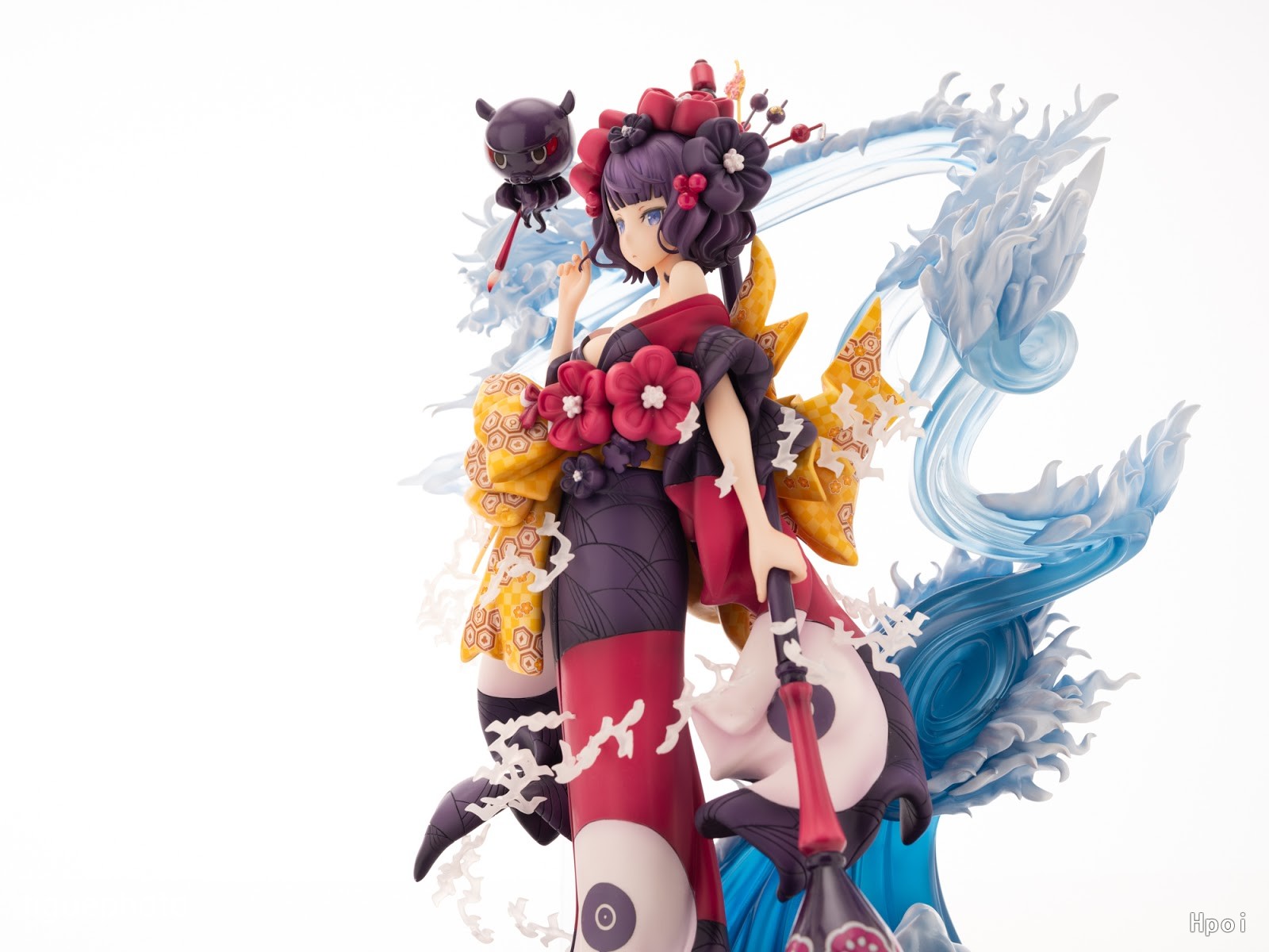 出自超人氣手機遊戲《Fate/Grand Order》,Foreigner從者「葛飾北齋」化身為1/7比例模型!和服腰帶與各處花飾、大膽裸露的胸前等,如實還原第二再臨花魁風格的妖豔和服姿態。以浪花為形象製作的巨大特效零件,還有圍繞在她身邊,以「海上的不二」為形象設計的眾多小鳥等,大量添加令人聯想浮世繪師北齋的配件。獻上本款史無前例的大分量模型!