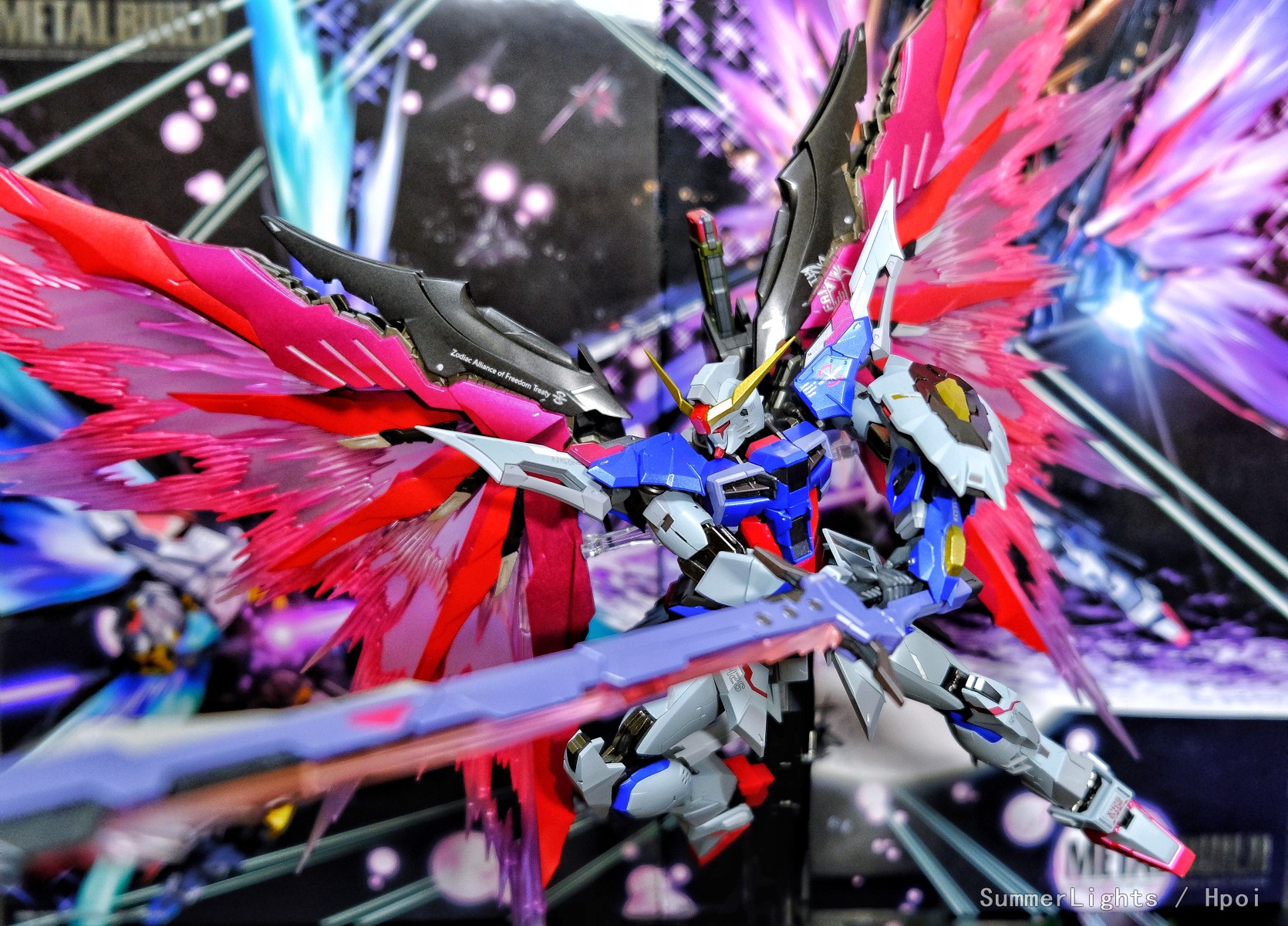 | 「デスティニーガンダム」と「光の翼オプションセット」の両方が付属する豪華パッケージ。 デスティニーガンダムは、マーキングを変更した新バージョン。 特徴である“光の翼”を、クリア素材とPPシートの三層構造で豪華に再現。 PPシートには、マイクロアイレンズシート“HALS”を採用。 斬新な立体表現が、未だかつて無い“光の翼”へと昇華させている。 更に、本体とオプションセットを同時収納できる特製スリーブが付属。 スリーブ表面には、『機動戦士ガンダムSEED DESTINY』チーフメカ作画監督・重田 智氏による描きおろしイラストがプリント! |