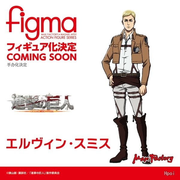 来自TV动画《进击的巨人》,「埃尔文・史密斯」的figma决定再贩!・以顺滑且有保持力的figma原创关节零件,还原剧中各种场景。・表情零件附带了「蔑视脸」「喊叫脸」「咬牙切齿脸」共3种。・附加零件附带了战斗时使用的「超硬质刃」1对,「钢丝锚」,立体机动装置的「烟特效」「带钩钢丝」,以及调查兵团的「披风」。・更附带了在剧中对他来说相当重要的马。・附带了能使还原各种场景成为可能,带有可动支架的figma专用底座。