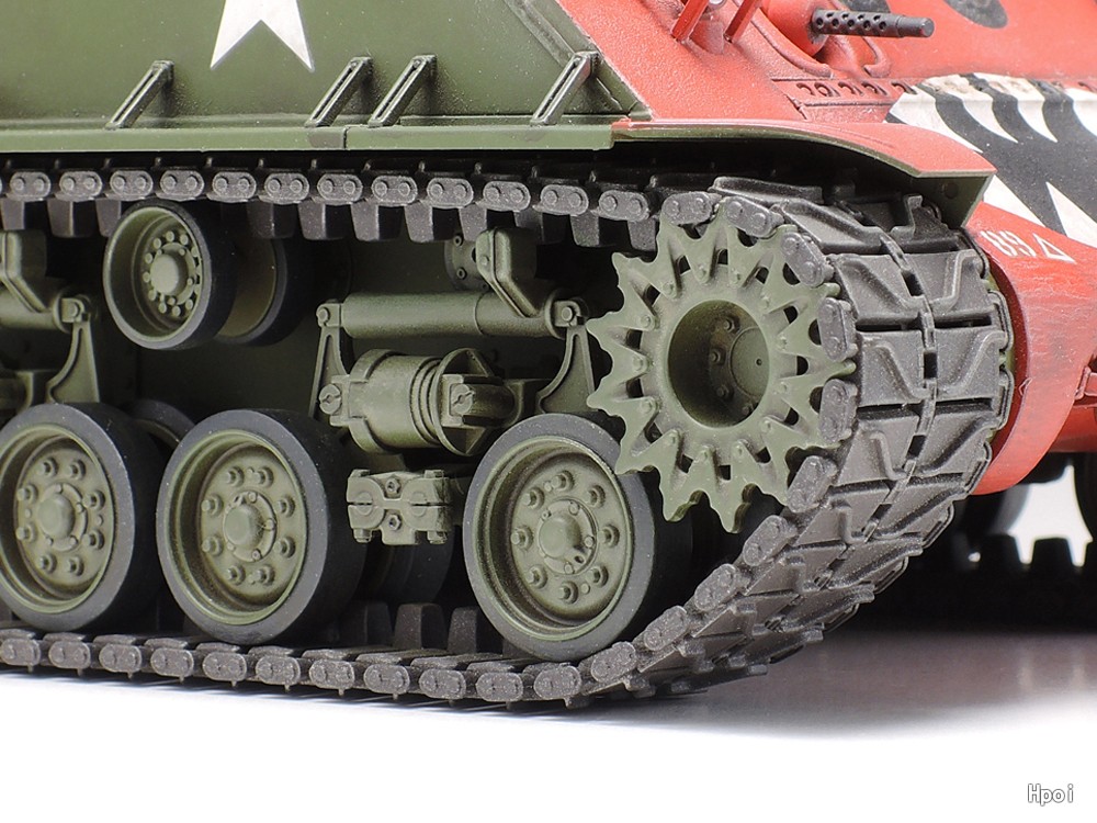 【 戦場を威嚇する、赤い悪魔のマーキング 】 第二次大戦中のM4シャーマン戦車の最終型となったのがM4A3E8イージーエイトです。防御力を向上させた後期型の溶接車体にV型8気筒ガソリンエンジンを搭載。水平懸架式サスペンション(HVSS)と幅の広い履帯による高い走行性能や、76mm砲の優れた対戦車戦闘能力を活かして連合軍の勝利に貢献しました。そして戦後も細部に改良を加えながら引き続きアメリカ軍に使用され、1950年に勃発した朝鮮戦争でも北朝鮮のT34/85に対抗して出動。練度の高い乗員と高速徹甲弾の多用により威力を発揮し、1953年の停戦まで奮戦しました。なお1951年の漢江沿いの戦いでは、中国義勇軍に対する心理作戦として、車体や砲塔の前面に猛々しい虎や悪魔の顔などを大きく描いた車輌も見られました。