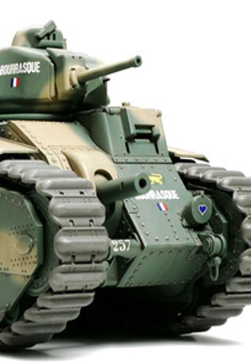 【 フランスの怪物、ドイツ戦車師団を阻止す 】 第二次大戦序盤の1940年5月、破竹の勢いでフランス国内に侵攻してきたドイツ軍の前に立ち塞がったのがフランスのB1 bis戦車です。第一次大戦後から開発が進められてきたB1戦車の改良型で、1937年から生産を開始。リベット接合の車体の右前部に短砲身75mm榴弾砲、小型の砲塔に長砲身47mm戦車砲を装備した強火力に加え、最大60mmという当時としては破格の重装甲を誇っていました。B1 bisは大戦初期のドイツ主力対戦車砲であった37mm対戦車砲の攻撃を寄せ付けず、ドイツ軍をパニックに陥れたのです。また、フランス北東部のストンヌ村の戦いでは、2個中隊のB1 bisがドイツ戦車部隊を相手に奮戦。多数の被弾をものともせず、10数輌ものドイツ戦車を撃破したのです。