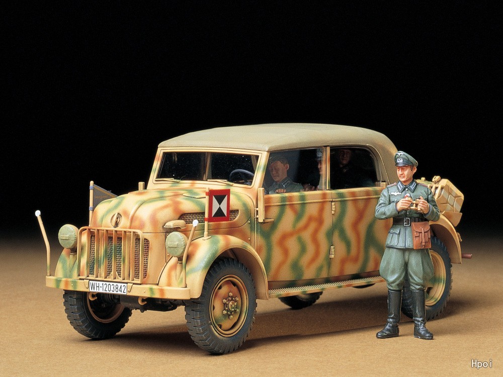 第二次大戦中、数多くの派生型が生産された軍用乗用車シュタイヤー1500A/01。その中で4枚の大型ドアや後部のトランクルーム、本革製のシートなど高い居住性を備え、師団長や軍司令官など指揮官用の乗用車として使用されたコマンドワーゲンのプラスチックモデル組み立てキットです。丸みのある独特なエンジンフードやトランクルームはそれぞれスライド金型で精密に再現。トランクのフードや幌、4つのドアは開閉を選んで組み立てられます。そして実車では本革製のシートなども高い質感で再現。双眼鏡を手にする将校とドライバー、後部座席に収まる将軍の人形もセットしました。