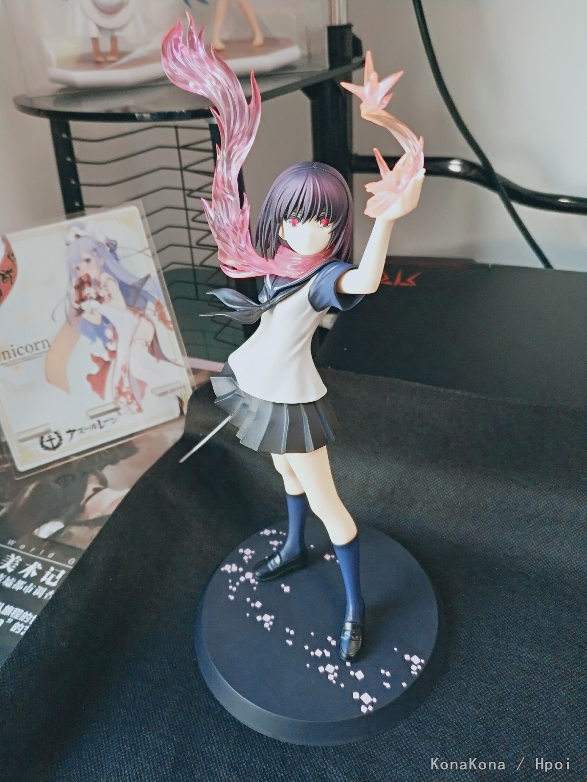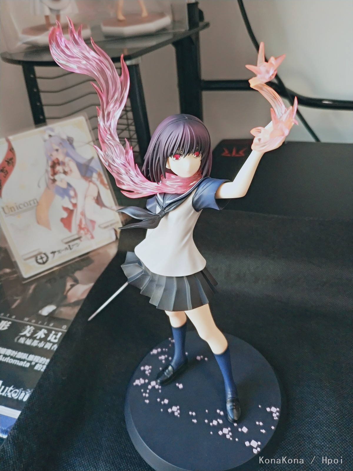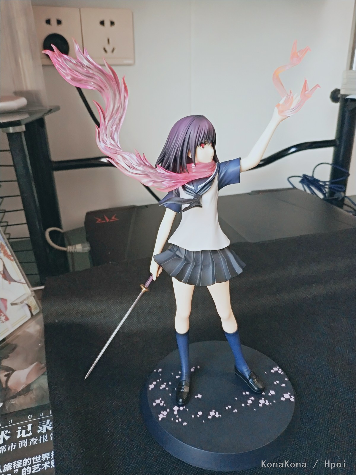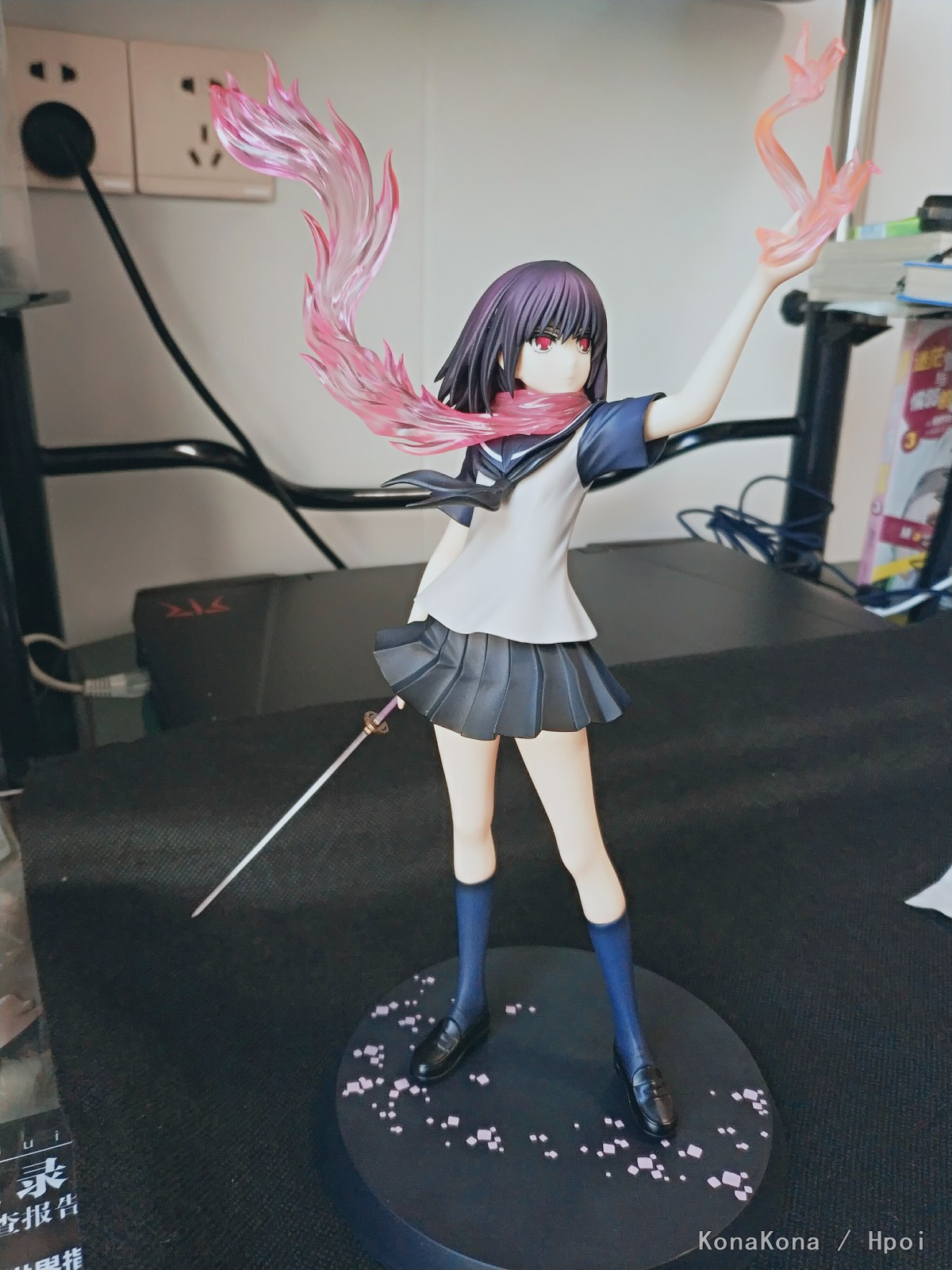 原作書籍1巻の裏表紙をモチーフに立体化された姿は、彼女と「シ・ニンジャ」独自の技「サクラ・エンハンスメント」によって具現化された桜色のマフラーメンポと炎、掲げた左手に生み出された「オリガミ・ミサイル」を見事に表現。さらに右手に持つ刀「ウバステ」はこの企画の為にわらいなく先生が新規に設定を起こしています!どことなく儚げなたたずまいでありながら瞳には桜色の炎を映し出す、絶妙の造形と色彩をご堪能ください。