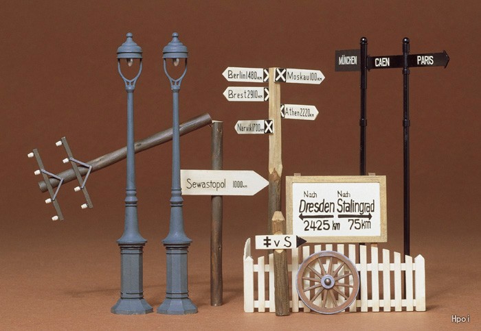 第二次大戦当時のヨーロッパの街角で見られた標識や街路灯などをモデル化しました。道標板12枚に加え、それを支える柱、電柱、街路灯、木の柵などをセット。ヨーロッパの代表的な地名やキロ数のデカールも用意しました。パッケージの裏面にはポスターや看板をカラーで印刷。切り抜いて情景に使えます。
