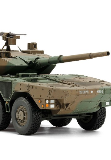 【 革新の俊足装甲車を手頃なサイズで 】 2016年度に調達が開始された陸上自衛隊の装輪装甲車が16式機動戦闘車です。高い機動力で目的地にいち早く駆けつける即応機動連隊の要として開発されました。8輪の大径タイヤを装備した車体に570馬力のディーゼルエンジンを搭載し、最高速度は100km/h。高速道路の自走による移動や航空機での輸送により、迅速な部隊展開が可能となっています。主砲の国産105mmライフル砲は優れた射撃統制装置により走行間射撃でも高い命中精度を実現。普通科部隊への火力支援や装甲車輌に対する攻撃を主任務とし、各部隊への配備が進められています。