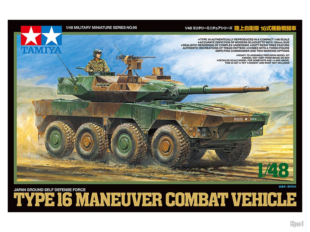 【 模型要目 】 陸上自衛隊の装輪装甲車、16式機動戦闘車のプラスチックモデル組み立てキットです。●1/48スケール。全長176mm、全幅63mm。●8輪の大径タイヤを持つ車体に105mm砲を装備した精悍な姿を、組み立てやすいパーツ構成で実感豊かにモデル化。●全輪独立懸架の足まわりも立体感ある仕上がり。●タイヤはトレッドパターンをリアルに再現した軟質樹脂製。●車長の半身像1体、デカール2種類付き。