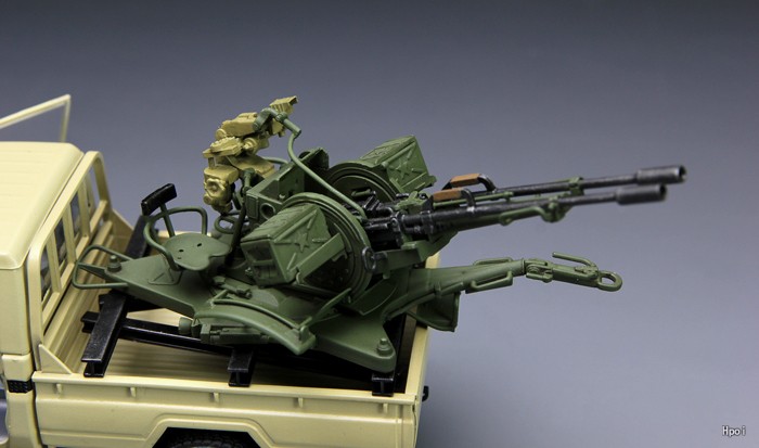 1/35比例搭载ZU-23-2高射炮的皮卡塑料拼装模型。模型全长140mm,宽57mm。皮卡车体外形逼真再现;车门可选择开闭两种状态。ZU-23-2高射炮复杂构造精密模型化,有三种射击角度可供选择;可制作成牵引或射击状态。套件附带精密蚀刻片;皮卡有两种涂装方案可供选择。